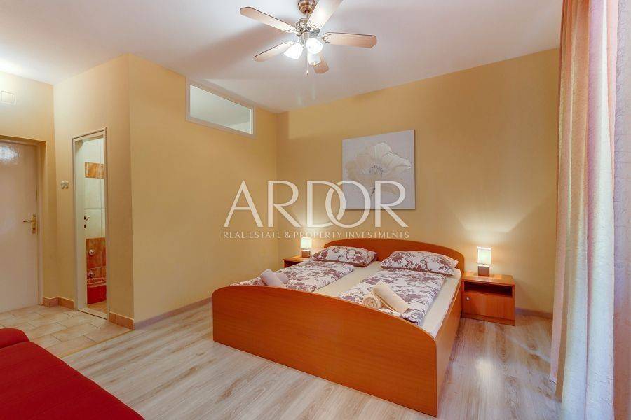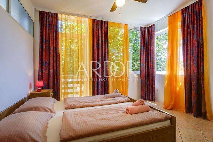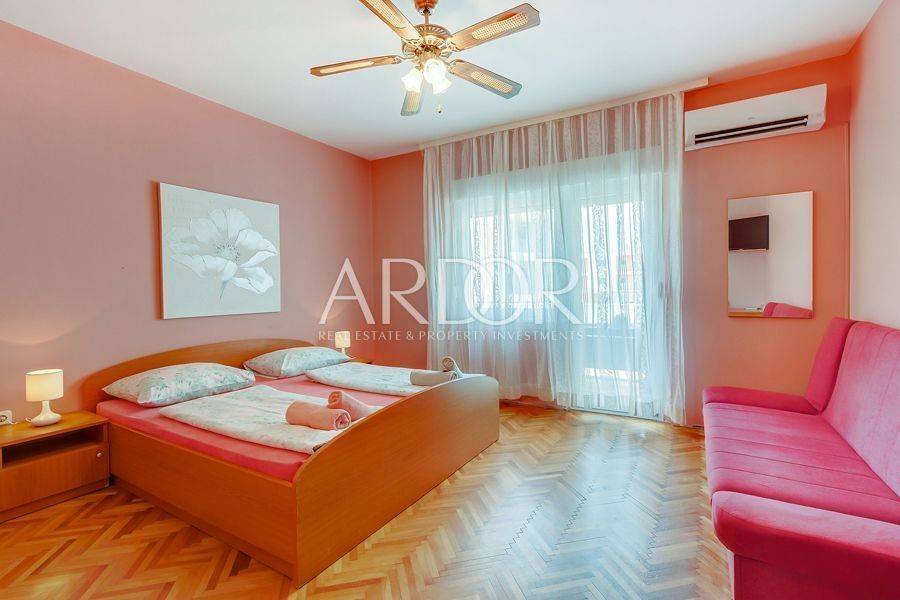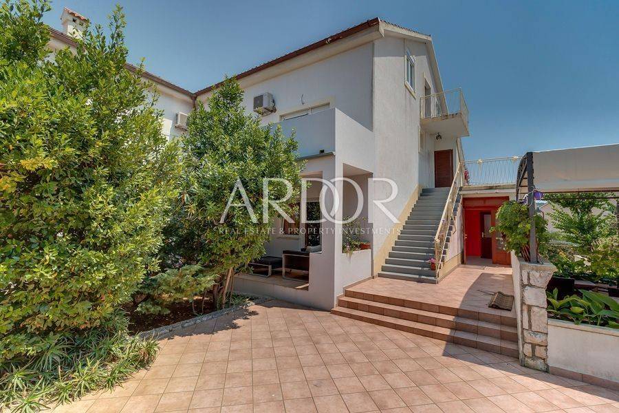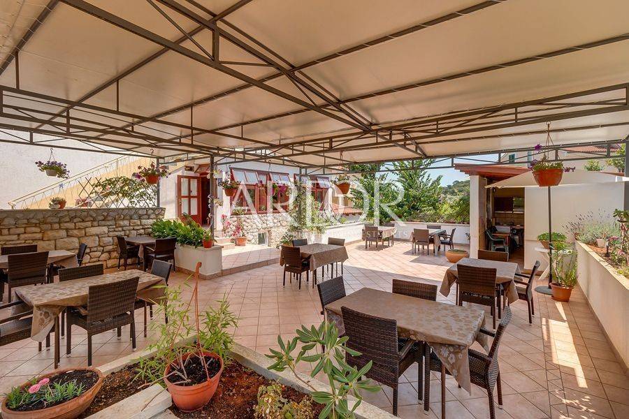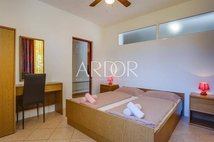 Mali Lošinj, in friedlicher und ruhiger Lage, nur 500 Meter von der berühmten Bucht Čikat entfernt, steht eine Villa mit 9 modern ausgestatteten und klimatisierten Zimmern und 5 Apartments für zwei oder fünf Personen zum Verkauf. Auf einem Grundstück von 1200 m2 befindet sich ein wunderschönes und gepflegtes Anwesen mit 825 m2 und eigenem Stellplatz für bis zu 14 Fahrzeuge. Es ist von einem Pinienwald umgeben und bietet einen wunderschönen Blick auf die Stadt Mali Lošinj. Die große, von mediterranen Pflanzen umgebene Terrasse und die Balkone mit freiem Blick auf die Stadt und das Meer werden Sie sicher nicht gleichgültig lassen. Das Objekt verzeichnet eine hervorragende Auslastung während der Sommermonate, aber auch in der Vor- und Nachsaison und eignet sich ideal als touristisches Investment.