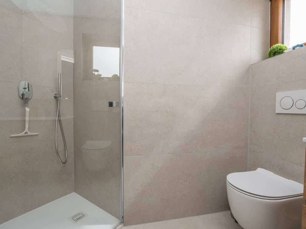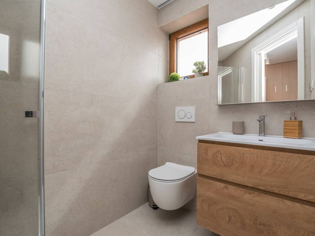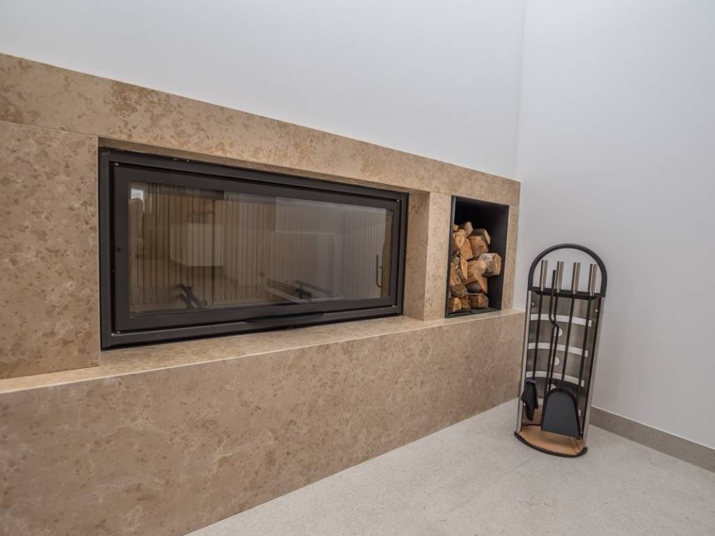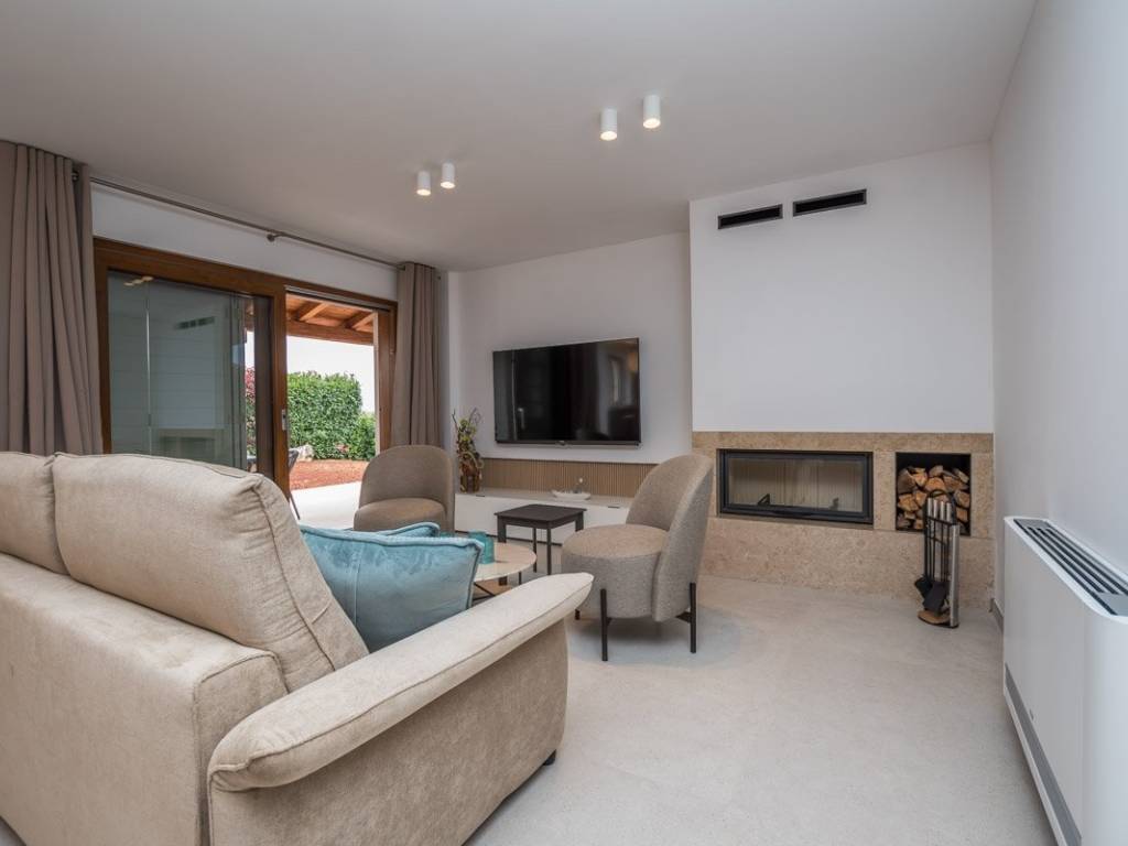 Heizung und Kühlung werden durch eine Wärmepumpe, Fußbodenheizung und einen Gebläsekonvektor geregelt, und im Wohnzimmer finden wir einen modernen Kamin.