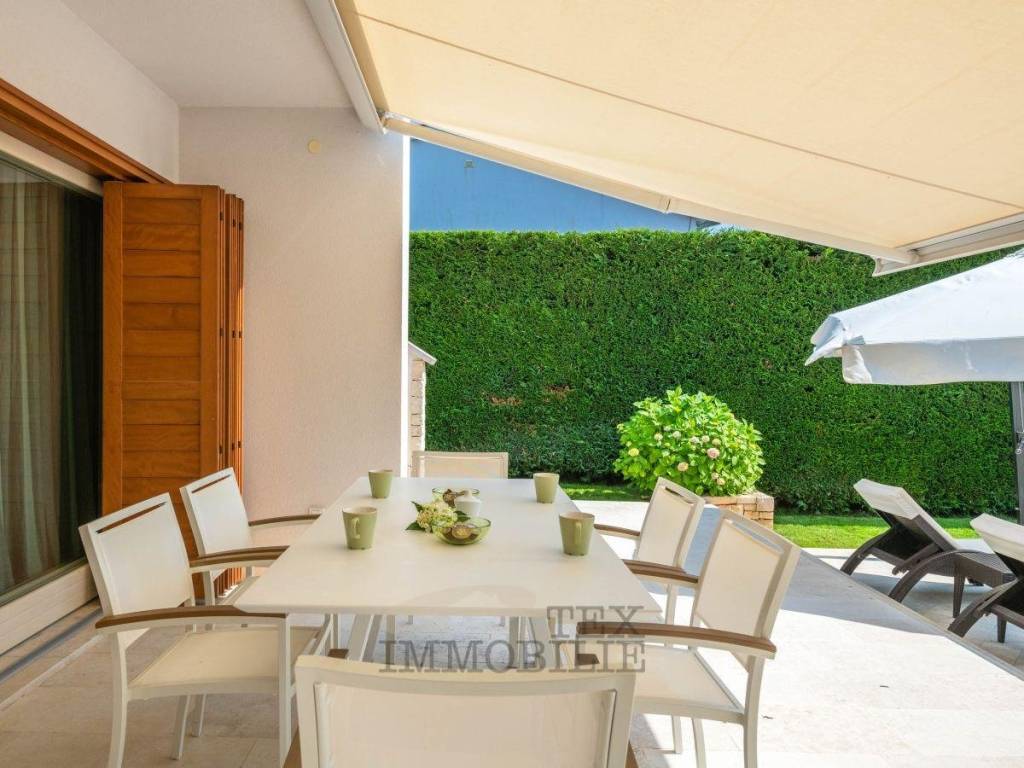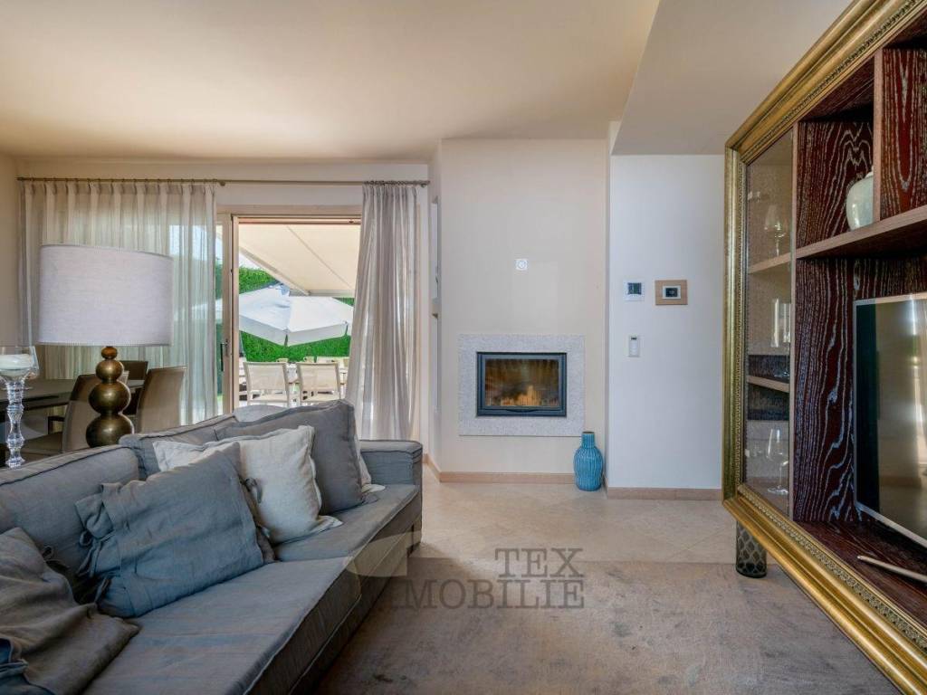 Die Villa ist Doppelhaushälfte, bietet jedoch dank der hohen Hecken und einer soliden Steinmauer vollständige Privatsphäre und eine ruhige Atmosphäre. Im Erdgeschoss beeindruckt der offene, lichtdurchflutete Wohnbereich mit einem gemütlichen Kamin und einem stilvollen Interieur. Die moderne Küche mit Natursteinboden und hochwertigen Geräten lädt zum Kochen ein. Der angrenzende Essbereich und das Wohnzimmer öffnen sich direkt auf die überdachte Terrasse mit einem Essplatz im Freien, einer Sommerküche und einem eingebauten Stein-Grill – ideal für entspannte Abende mit Familie und Freunden.