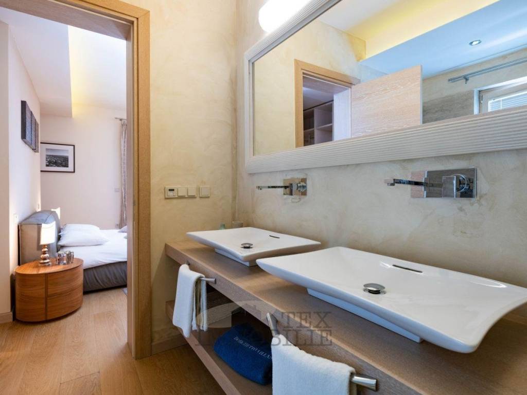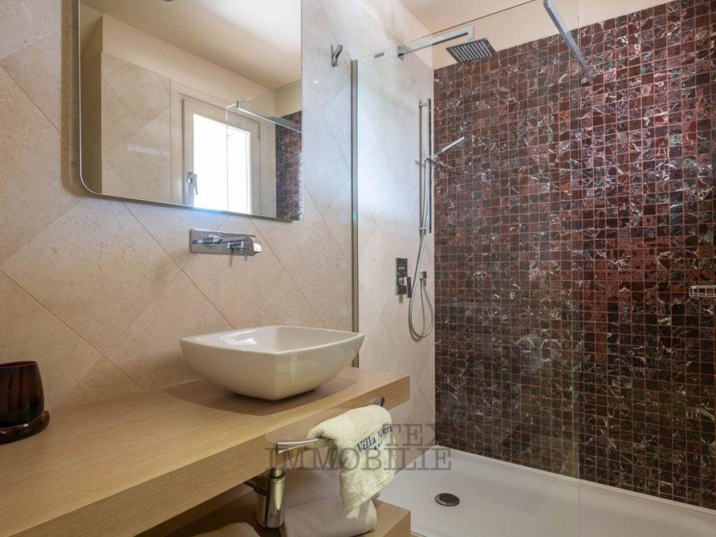 Eine elegante Steintreppe führt in das Obergeschoss, wo sich zwei weitere großzügige Schlafzimmer befinden, jeweils mit eigenem Badezimmer – eines mit Dusche, das andere mit Hydromassage-Badewanne für maximale Entspannung. Beide Schlafzimmer verfügen über einen Zugang zu einer großen Terrasse mit herrlichem Blick auf den Garten und den Pool. Die Terrasse und der Poolbereich sind zudem über eine Außentreppe aus Stein erreichbar.