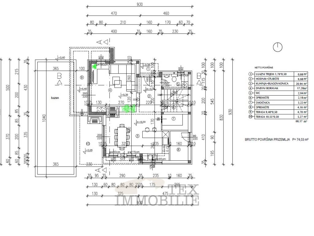 Die Villa umfasst außerdem einen Pool mit einer Fläche von 38 m2 und zwei Parkplätze.