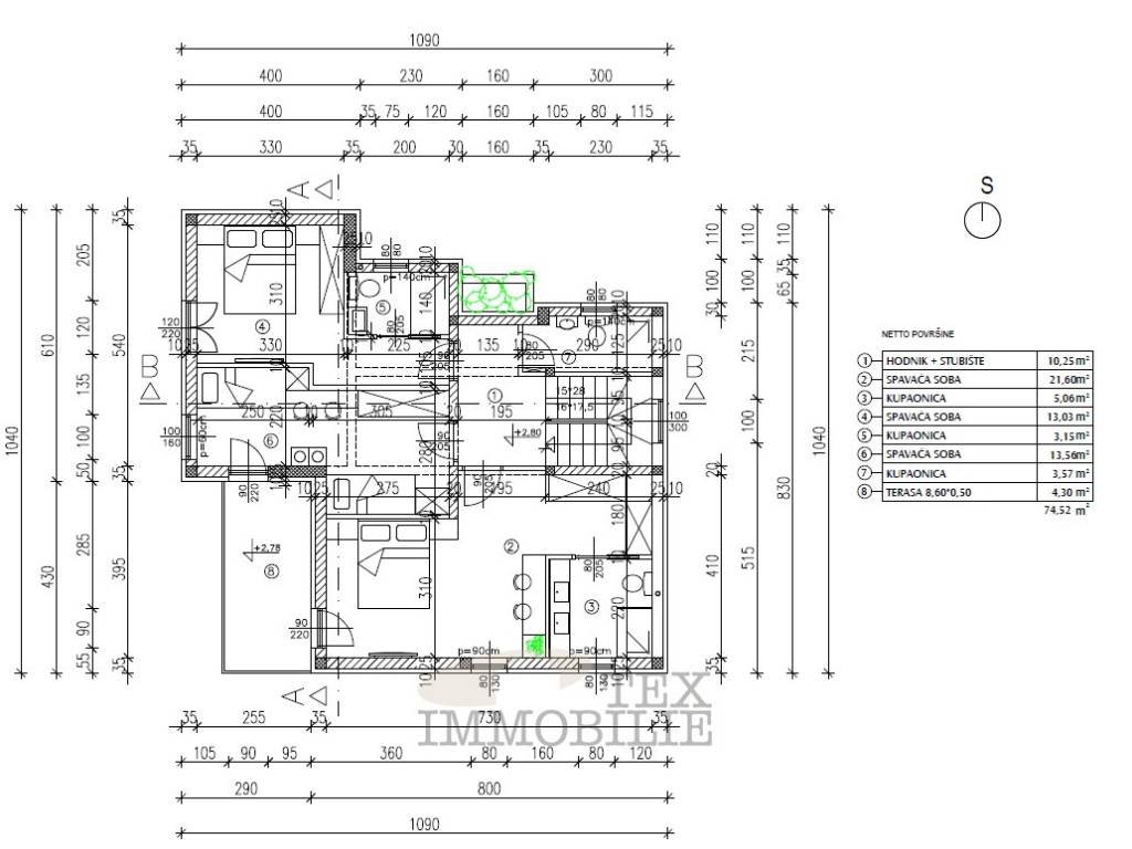 Das erste Obergeschoss umfasst drei Schlafzimmer und drei Badezimmer mit Duschkabinen. Zwei Schlafzimmer haben Zugang zu einer gemeinsamen überdachten Terrasse.