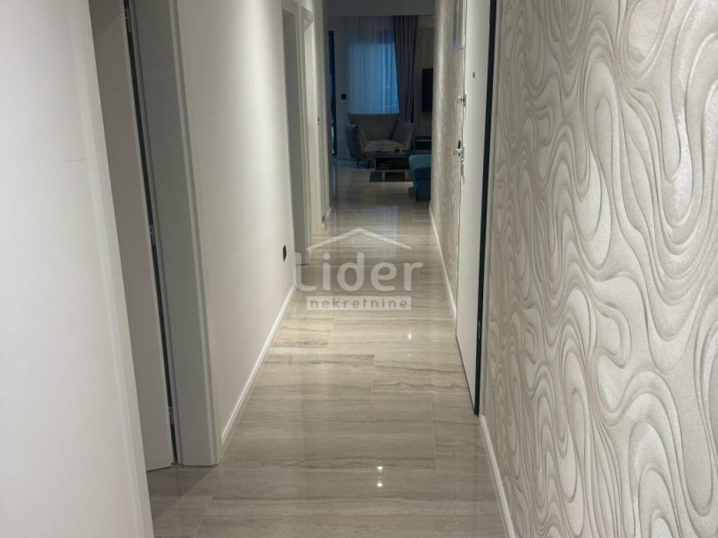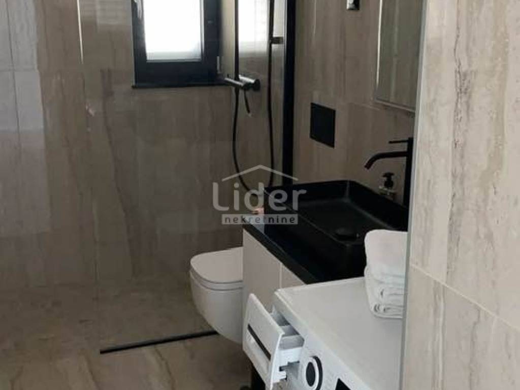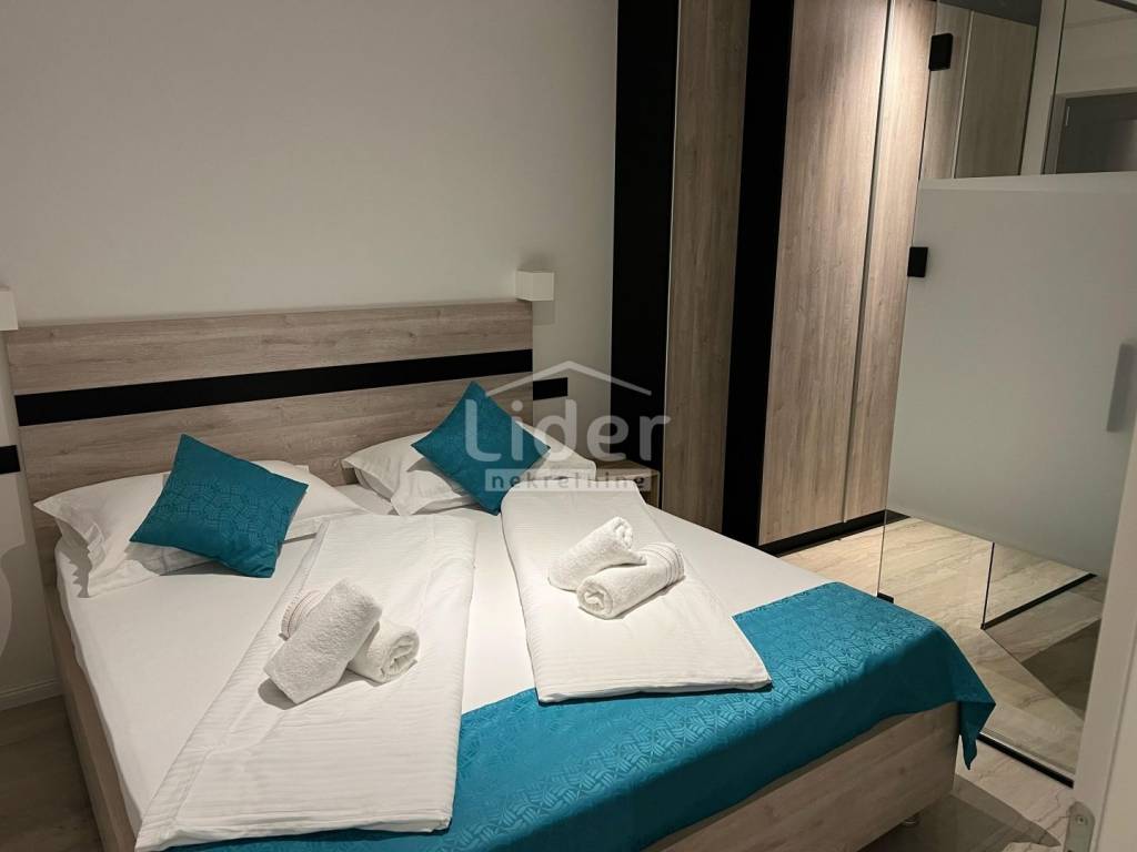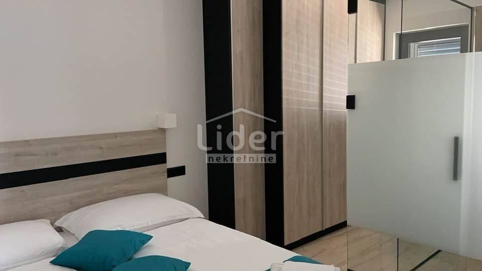 Der Außengarten und der Außenpool sind direkt mit der Wohneinheit verbunden, und der Garten ist vollständig eingezäunt und bietet zusammen mit dem Pool einen Ort zum Entspannen und Genießen. Im Garten gibt es neben dem Pool, der mit blauem Mosaik und weißem Brač-Bordstein ausgekleidet ist, eine Solardusche und einen Holzkamin, und Wärmepumpe zur Poolheizung. Der gesamte Garten der Garten wird dezent mit LED-Beleuchtung beleuchtet und es wurden mediterrane Pflanzen wie Oleander, Pitospora, Lavendel, Rosmarin und hohe Palmen gepflanzt. Die Promenade und das Sonnendeck sind mit weißem Naturstein gepflastert.