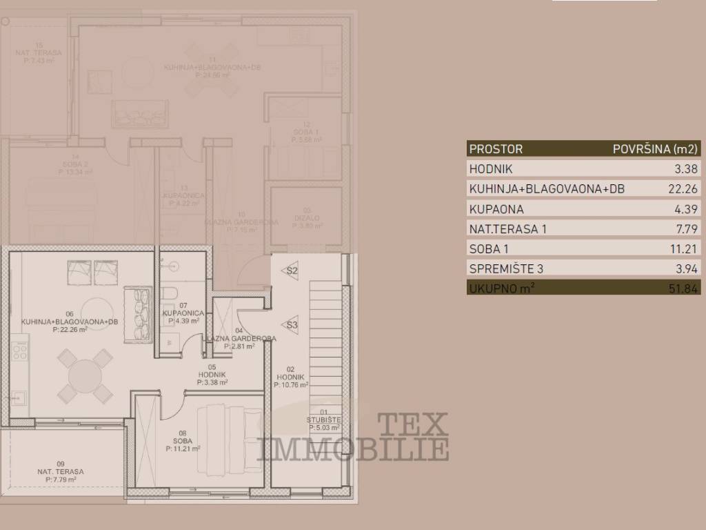 Die Wohnung wurde sorgfältig geplant, um maximalen Komfort und Funktionalität zu bieten, mit viel Tageslicht und einer harmonischen Raumaufteilung. Sie besteht aus einem Flur (3,38 m²), einem offenen Wohnbereich mit Küche und Esszimmer (22,26 m²), einem Badezimmer (4,39 m²), einem geräumigen Schlafzimmer (11,21 m²), einer überdachten Terrasse (7,79 m²) und einem zusätzlichen Abstellraum (3,94 m²).