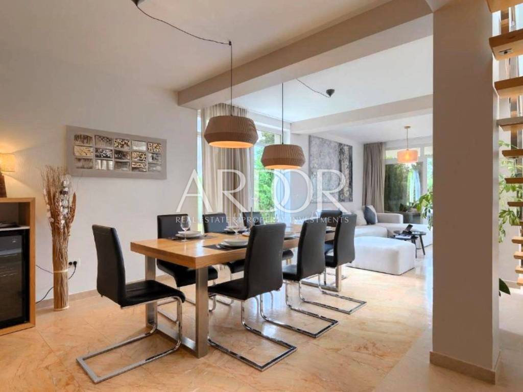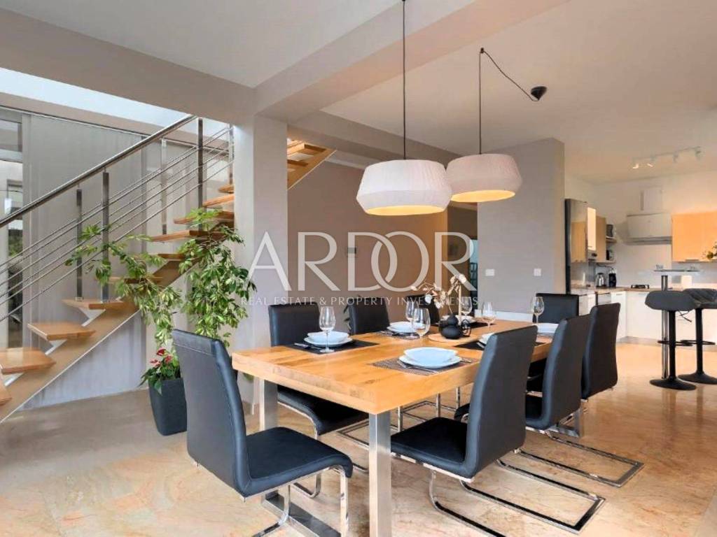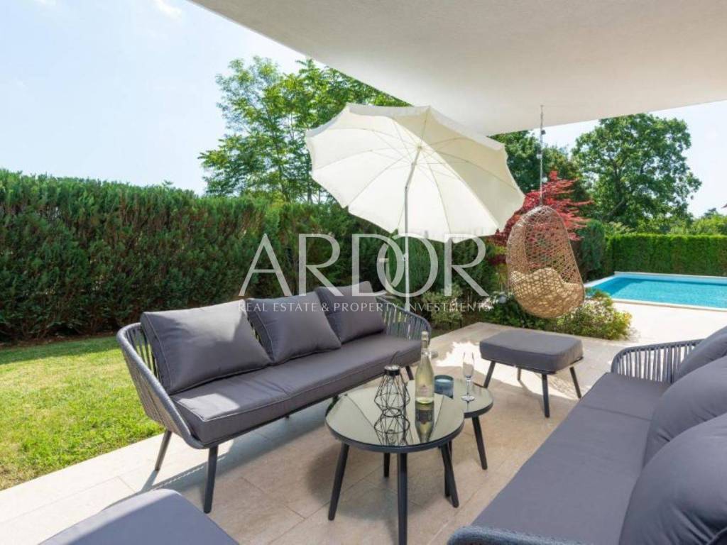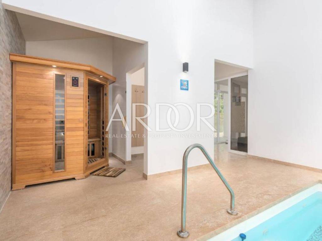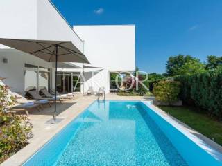Žminj, wir vermitteln den Verkauf einer modernen Villa! Diese Residenz mit einer Gesamtfläche von 350 m2 auf zwei Etagen ist der Inbegriff von Großzügigkeit und zeitgemäßem Luxus. Es verfügt über vier luxuriöse Schlafzimmer, fünf außergewöhnliche Badezimmer und ein zusätzliches Gäste-WC. Die minimalistische Eleganz dieses Hauses wird mit markanten Details und großen Glaswänden kombiniert, die den grünen Außenbereich umgeben. Die mit außergewöhnlichem Augenmerk auf Qualität erbaute Villa verfügt über robuste Betonarbeiten und luxuriöse Stein- und Keramikböden. Es wird komplett möbliert verkauft, ausgestattet mit einer Solaranlage für Warmwasser und intelligenter Technologie zur einfachen Steuerung über ein mobiles Gerät. Für vollen Komfort sorgen eine Wärmepumpenheizung, eine umfassende Fußbodenheizung und eine Klimaanlage. Der private Innenpool von 28 m2 ist mit einer Temperaturregelung durch eine Wärmepumpe ausgestattet, die durch den 32 m2 großen Außenpool wunderbar ergänzt wird. Isolation ist von größter Bedeutung, denn rund um die Villa bietet viel Grün Ruhe und Privatsphäre ohne unmittelbare Nachbarn oder Verkehrslärm. Reflektierende Fenster sorgen für die Privatsphäre der Villa und bieten dem neuen Besitzer ein persönliches Paradies. Die Villa ist eine Fundgrube an Urlaubsmöglichkeiten, mit einem beheizten Außenpool, einem Innenpool und viel Platz zum Entspannen und Genießen.