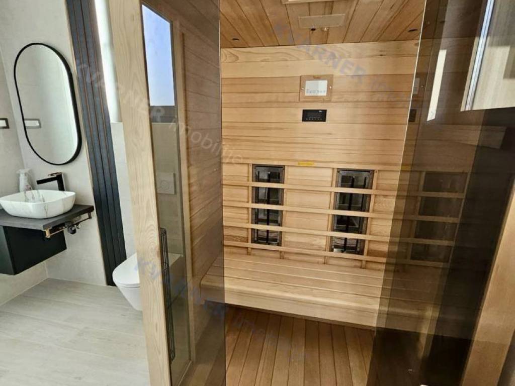 Das Erdgeschoss umfasst eine Küche mit Essbereich, ein geräumiges Wohnzimmer mit Zugang zur überdachten Terrasse, ein Gäste-WC, eine Sauna und einen Abstellraum. Im Obergeschoss befinden sich drei Schlafzimmer, jedes mit eigenem Bad und Zugang zu einer Terrasse mit Meerblick.