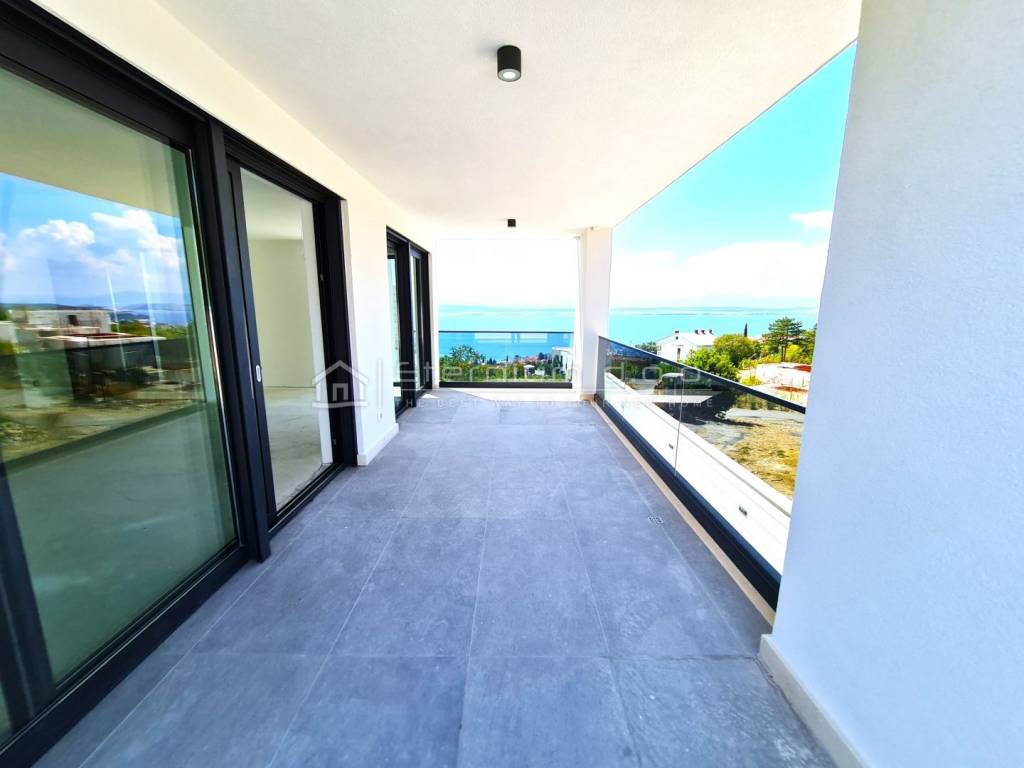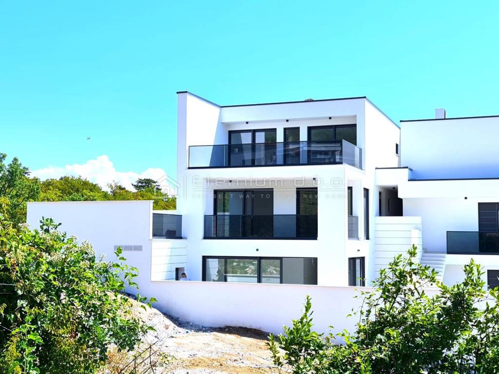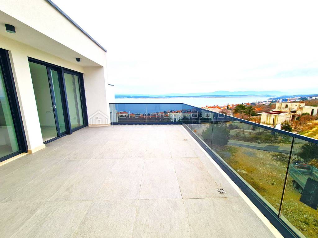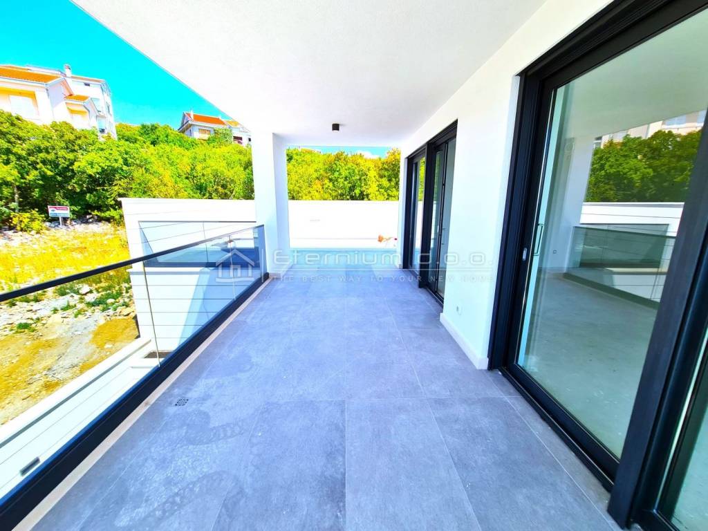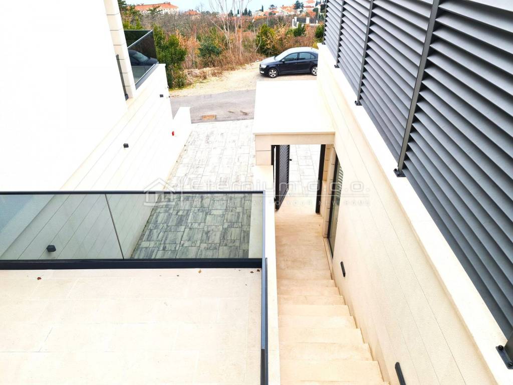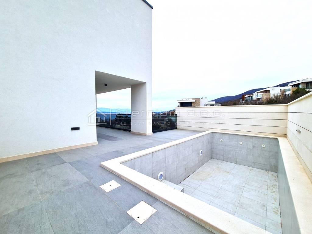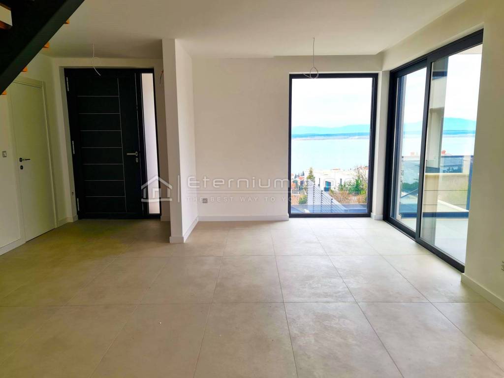 Die hier zum Verkauf stehende Wohnung hat zwei Stockwerke und erstreckt sich über das erste und zweite Stockwerk. Das erste Stockwerk besteht aus einer Eingangshalle mit Treppe zum Obergeschoss, einer Toilette mit Waschküche, einem Schlafzimmer mit eigenem Badezimmer und einem Wohnzimmer, das aus einer Küche mit Esszimmer und einem geräumigen Wohnzimmer besteht, das auf eine große überdachte Terrasse führt, die mit der Nordterrasse verbunden ist, auf der sich der Swimmingpool befindet. Das zweite Stockwerk besteht aus einer Eingangshalle und zwei Schlafzimmern – jedes mit eigenem Badezimmer und Zugang zu einer 23 m² großen, gemeinsamen, halb überdachten Terrasse. Beide Terrassen bieten einen herrlichen Blick auf das Meer und die Insel Krk.