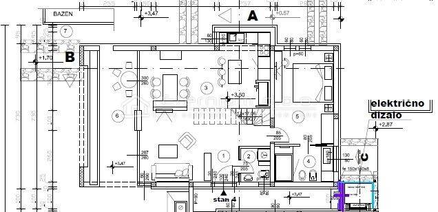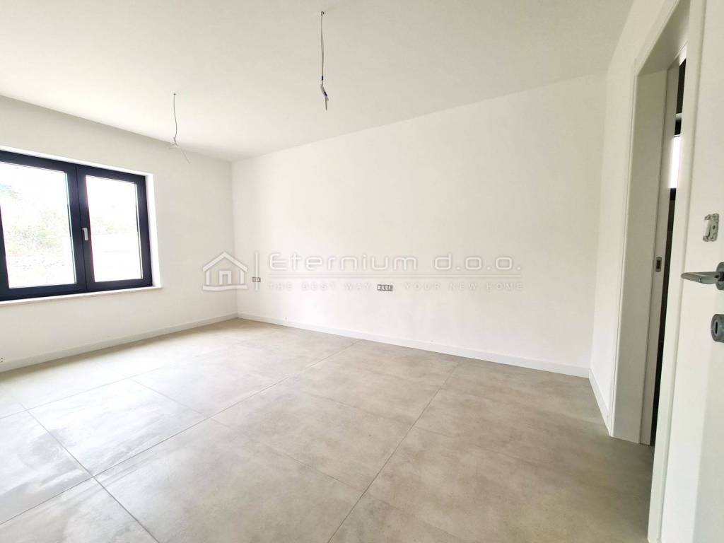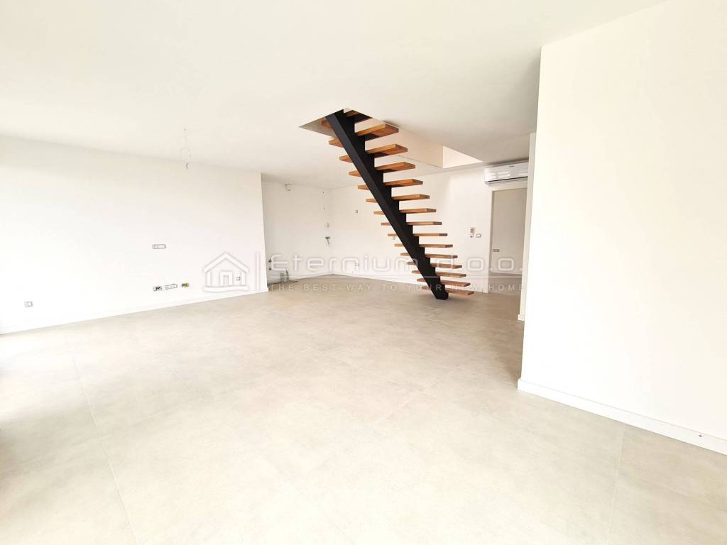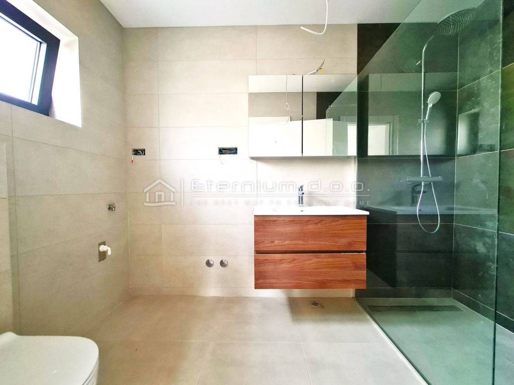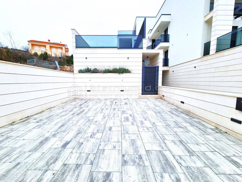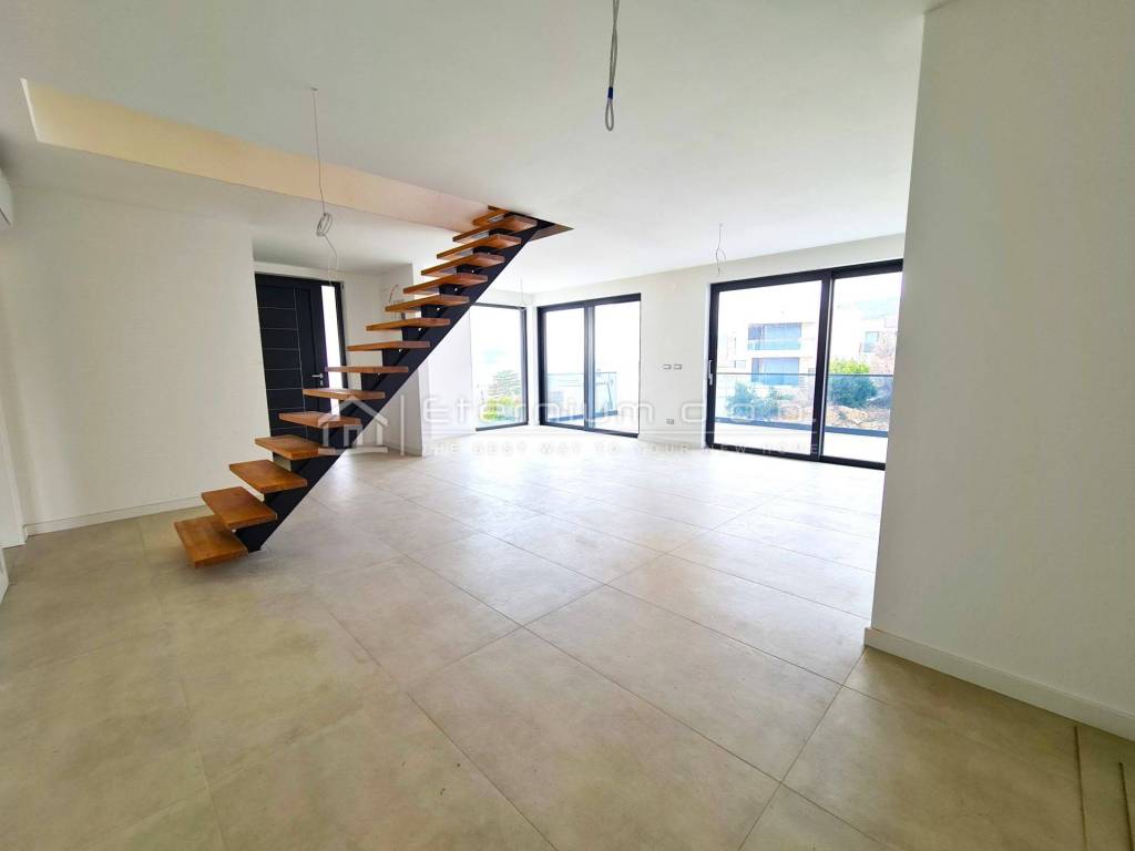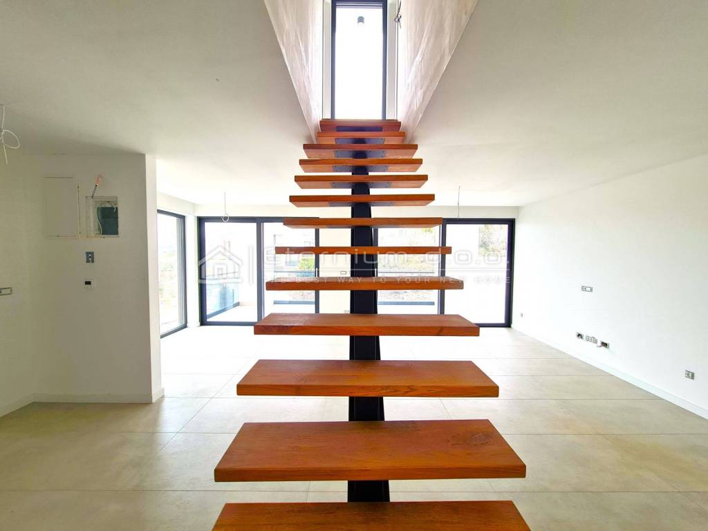 Die hier zum Verkauf stehende Wohnung hat zwei Stockwerke und erstreckt sich über das erste und zweite Stockwerk. Das erste Stockwerk besteht aus einer Eingangshalle mit Treppe zum Obergeschoss, einer Toilette mit Waschküche, einem Schlafzimmer mit eigenem Badezimmer und einem Wohnzimmer, das aus einer Küche mit Esszimmer und einem geräumigen Wohnzimmer besteht, das auf eine große überdachte Terrasse führt, die mit der Nordterrasse verbunden ist, auf der sich der Swimmingpool befindet. Das zweite Stockwerk besteht aus einer Eingangshalle und zwei Schlafzimmern – jedes mit eigenem Badezimmer und Zugang zu einer 23 m² großen, gemeinsamen, halb überdachten Terrasse. Beide Terrassen bieten einen herrlichen Blick auf das Meer und die Insel Krk.