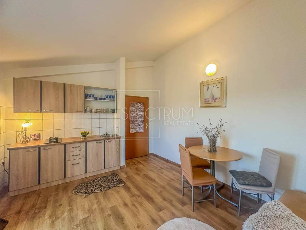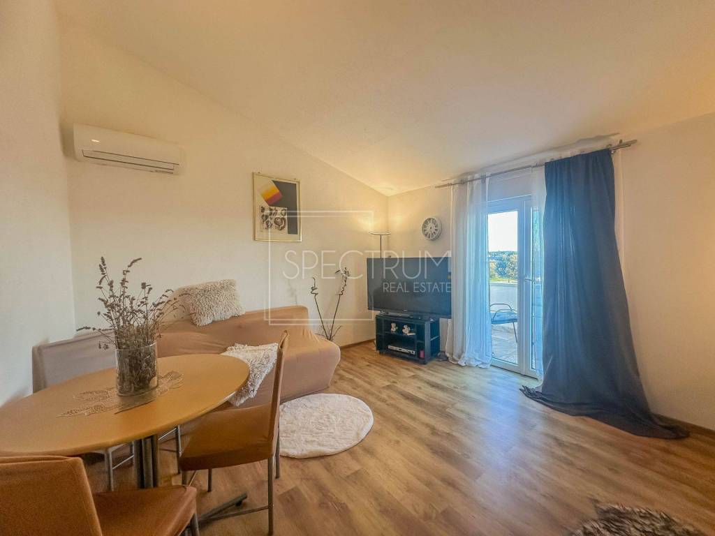 Die Wohnung befindet sich im 1. Obergeschoss eines Hauses mit 4 Wohneinheiten. Die Wohnung hat eine Fläche von 43,14 m2. Die Wohnung besteht aus einer Eingangshalle, einem Wohnzimmer mit Küche und Esszimmer, einem Schlafzimmer, einem Badezimmer und einer Terrasse mit wunderschönem Blick auf das Meer und die Stadt Novigrad. Vom Wohnzimmer aus gelangt man auf die Terrasse. Die Heizung wird über eine Klimaanlage geregelt. Die Wohnung wird möbliert verkauft. Zur Wohnung gehört ein PKW-Stellplatz im Garten.