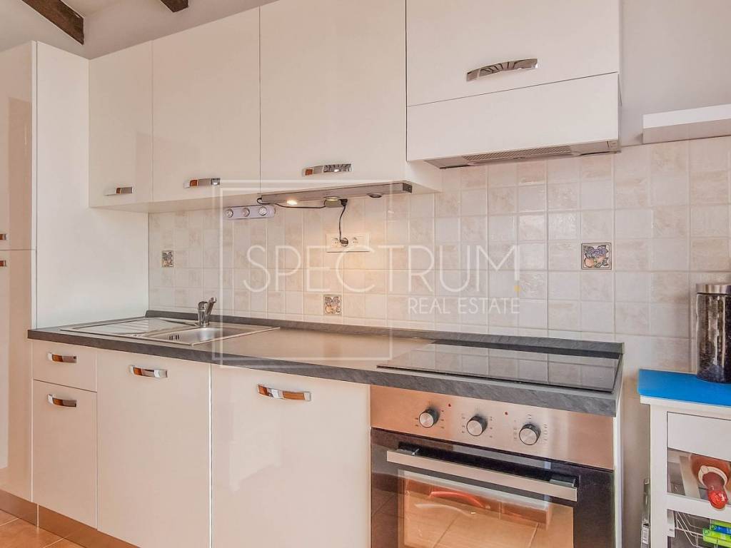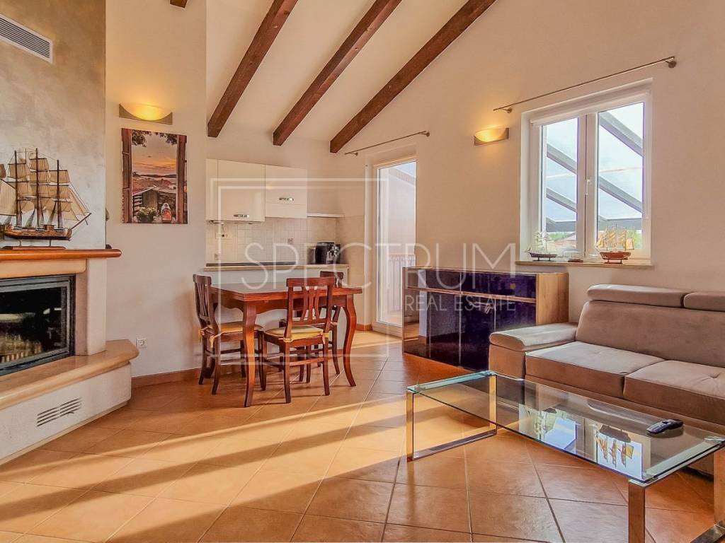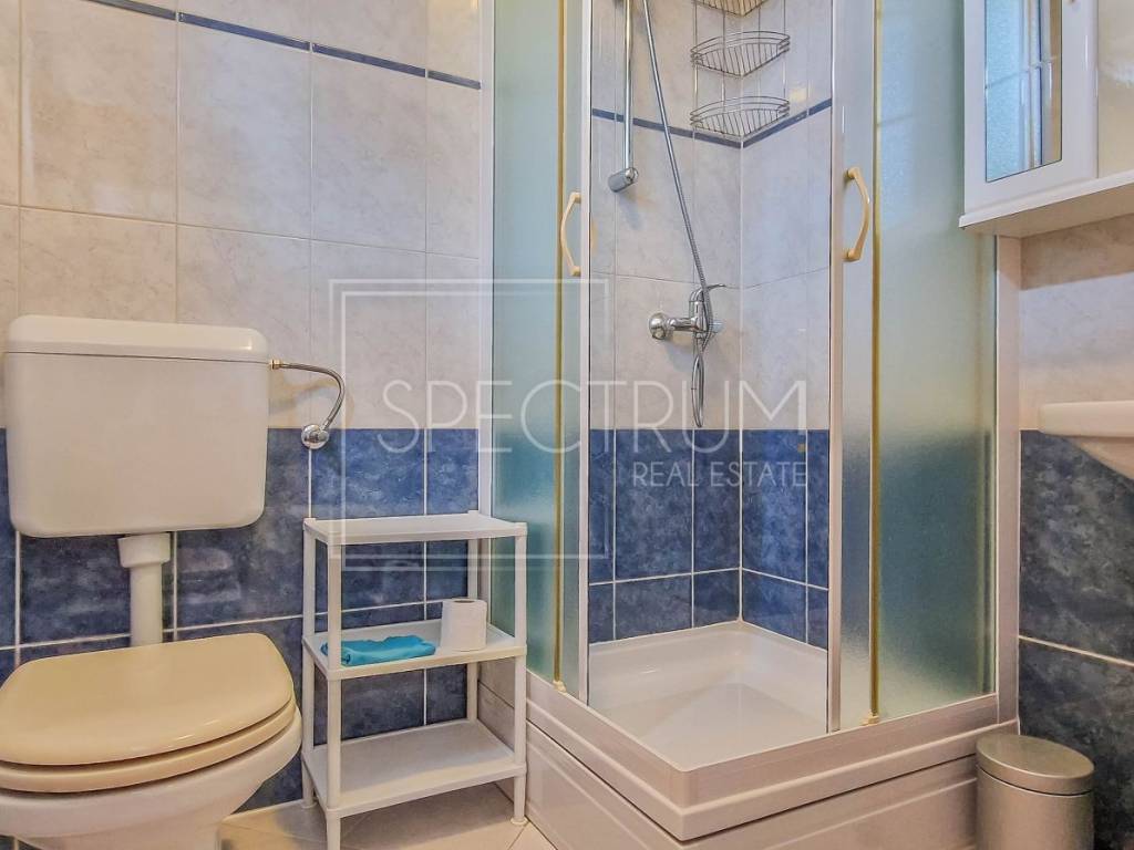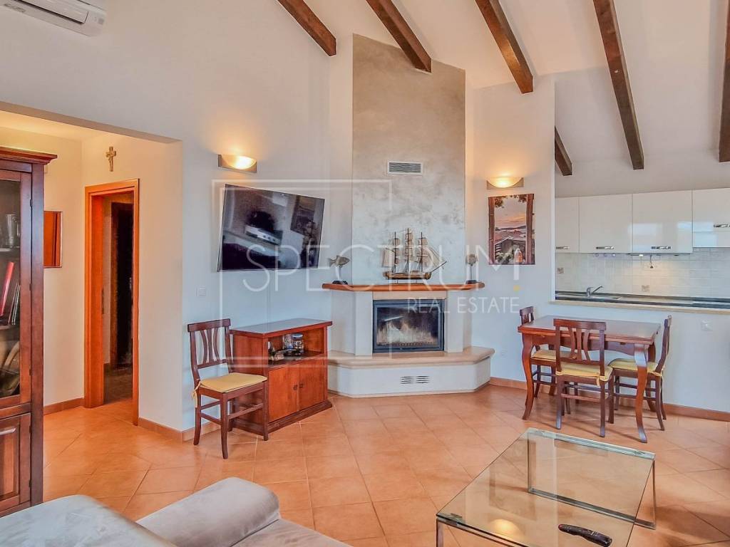 Die Gesamtfläche dieser Doppelhaushälfte beträgt 112,63 m². Sie besteht aus einem Wohnzimmer mit offener Küche und Esszimmer, zwei Schlafzimmern, einem Badezimmer, einem Flur und einer Terrasse. Im Untergeschoss befindet sich eine zusätzliche Wohneinheit, ein Studio-Apartment mit Küche und Kamin, das ideal für Gäste oder zur Vermietung geeignet ist. Das Haus bietet einen wunderschönen Blick auf das Meer und die Natur. Die Heizung erfolgt über eine zentrale Holzheizung und eine Klimaanlage. Das Haus wird möbliert verkauft.