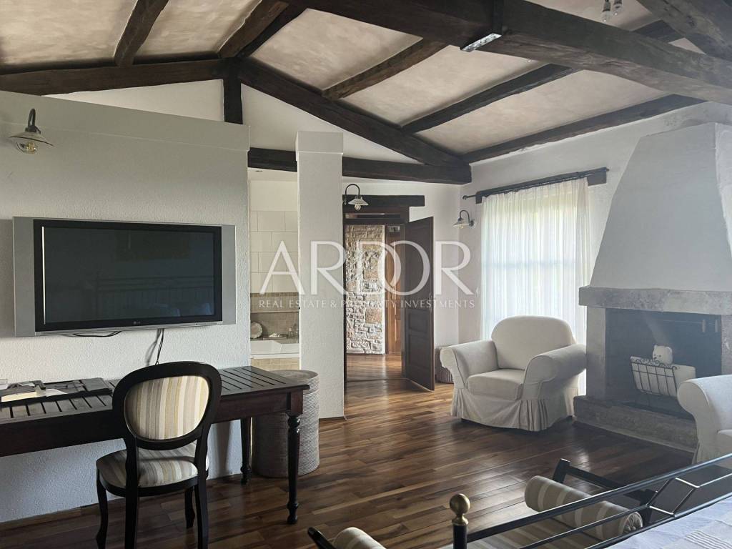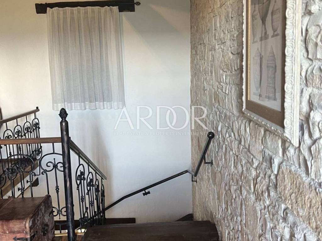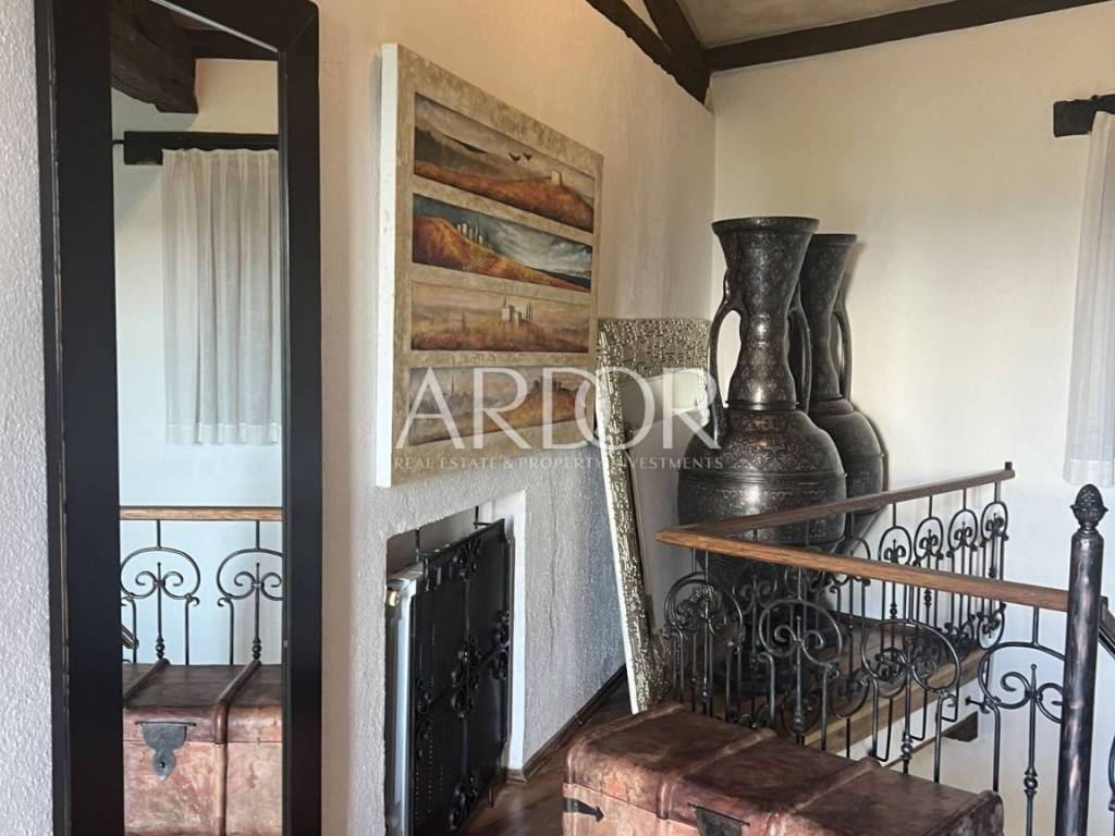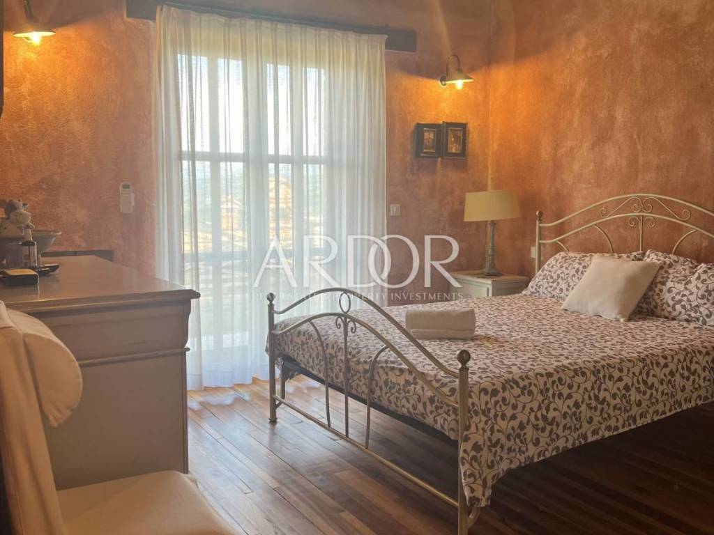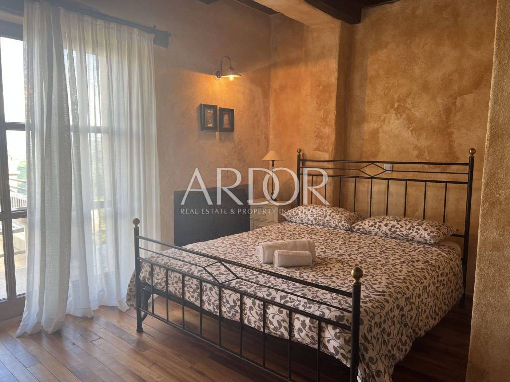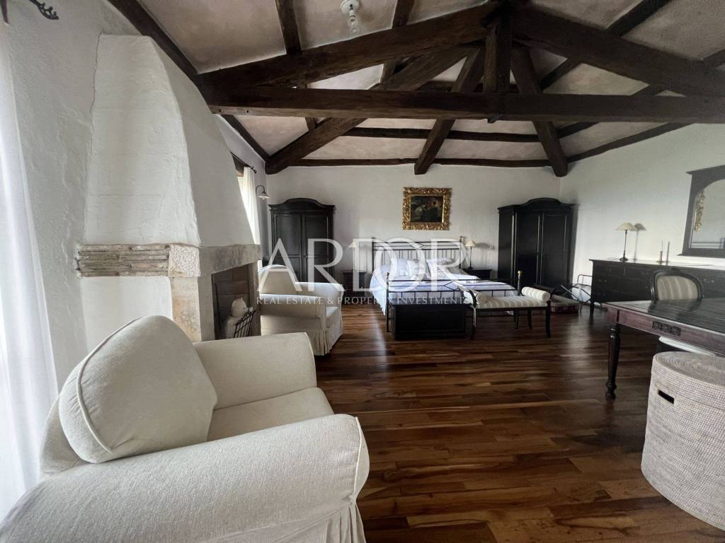 Eine Innentreppe führt in den ersten Stock, wo sich ein elegant eingerichtetes und ausgestattetes Arbeitszimmer und ein geräumiges Schlafzimmer mit offenem Badezimmer und separater Toilette befinden. Dieses Hauptschlafzimmer verfügt über einen Kamin, an dem Sie die kalten Winterabende genießen können, sowie über einen Ausgang zur Terrasse mit herrlicher Aussicht. Die Villa verfügt über einen Keller, in dem sich ein Raum zum Waschen und Trocknen von Kleidung, eine Sauna und eine Duschkabine befinden. Wir haben auch eine luxuriös eingerichtete Weinhandlung, in der Weinliebhaber eine intime Atmosphäre und geselliges Beisammensein genießen können. Die genannten Zimmer haben Zugang zum Garten. Für kältere Wintertage verfügt das Haus über eine eingebaute Ölzentralheizung und zwei Kamine, für heiße Sommertage wurden Klimaanlagen installiert. Die Böden sind mit Parkett und Terrakotta ausgelegt, was dem Raum einen besonderen Charme verleiht und perfekt zu Holz und Stein passt.