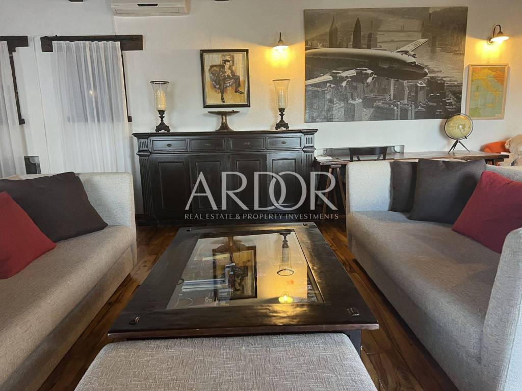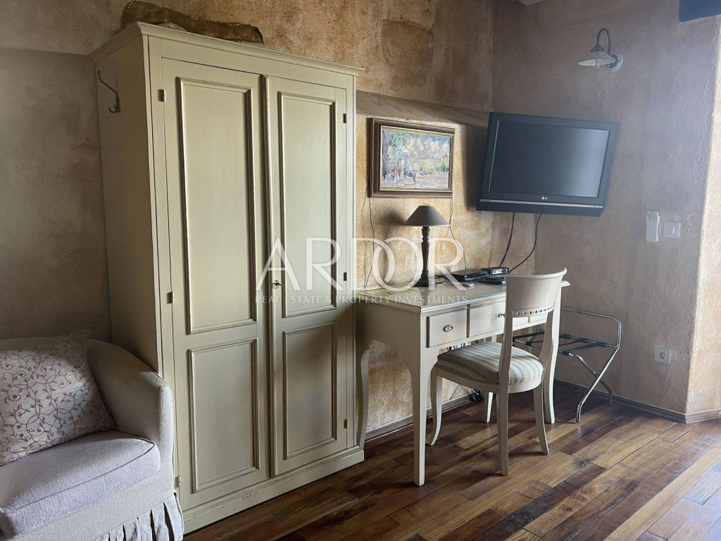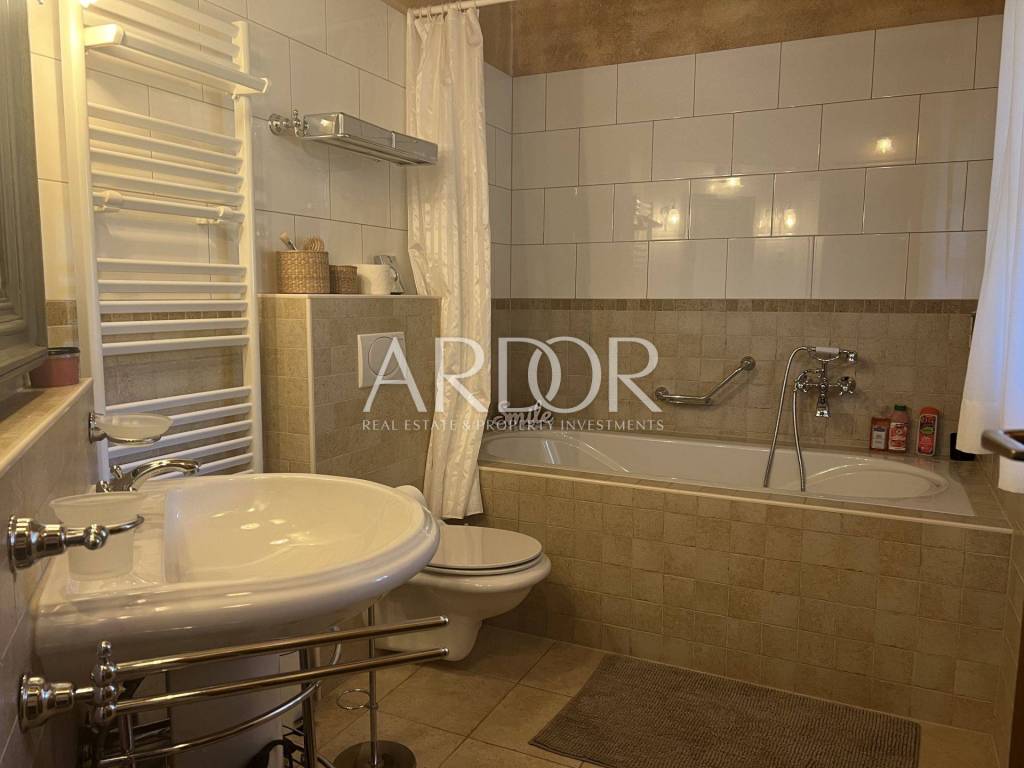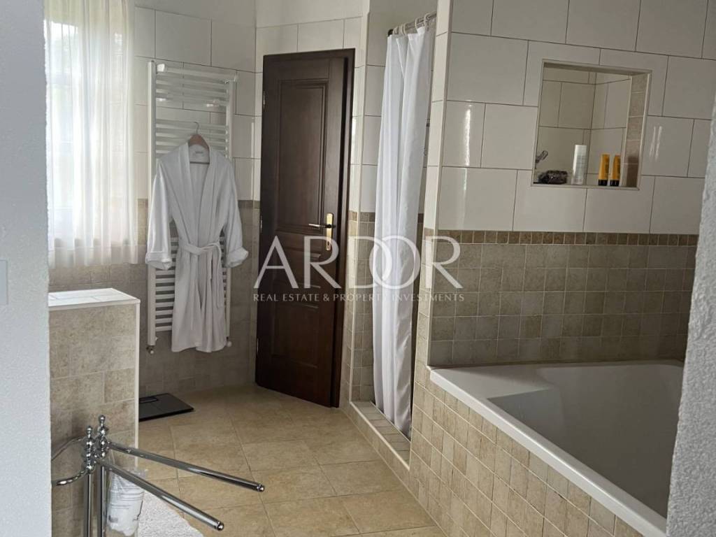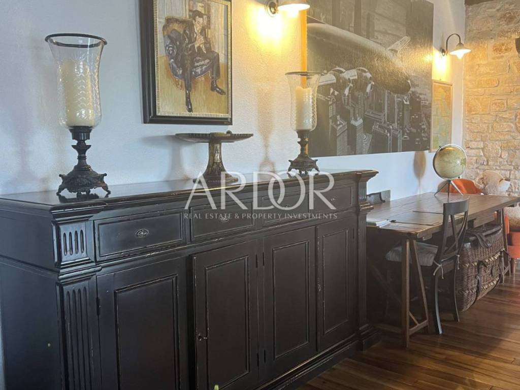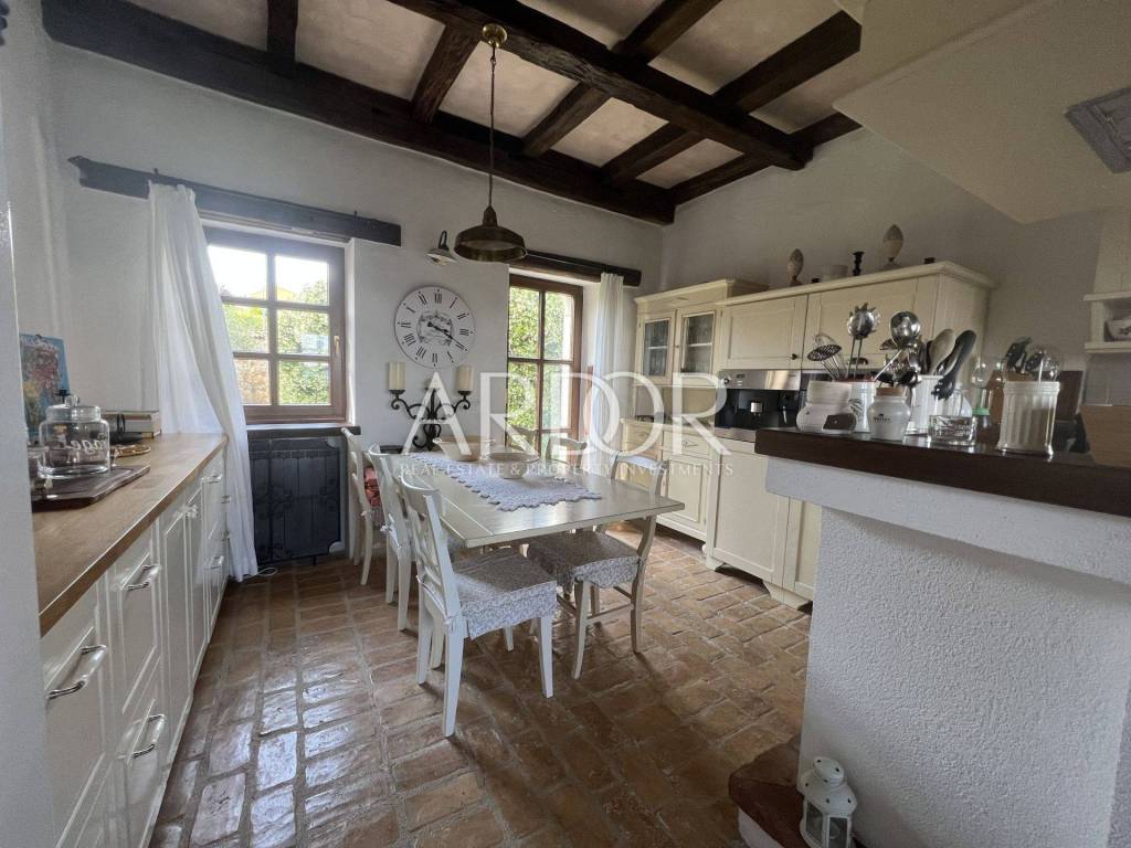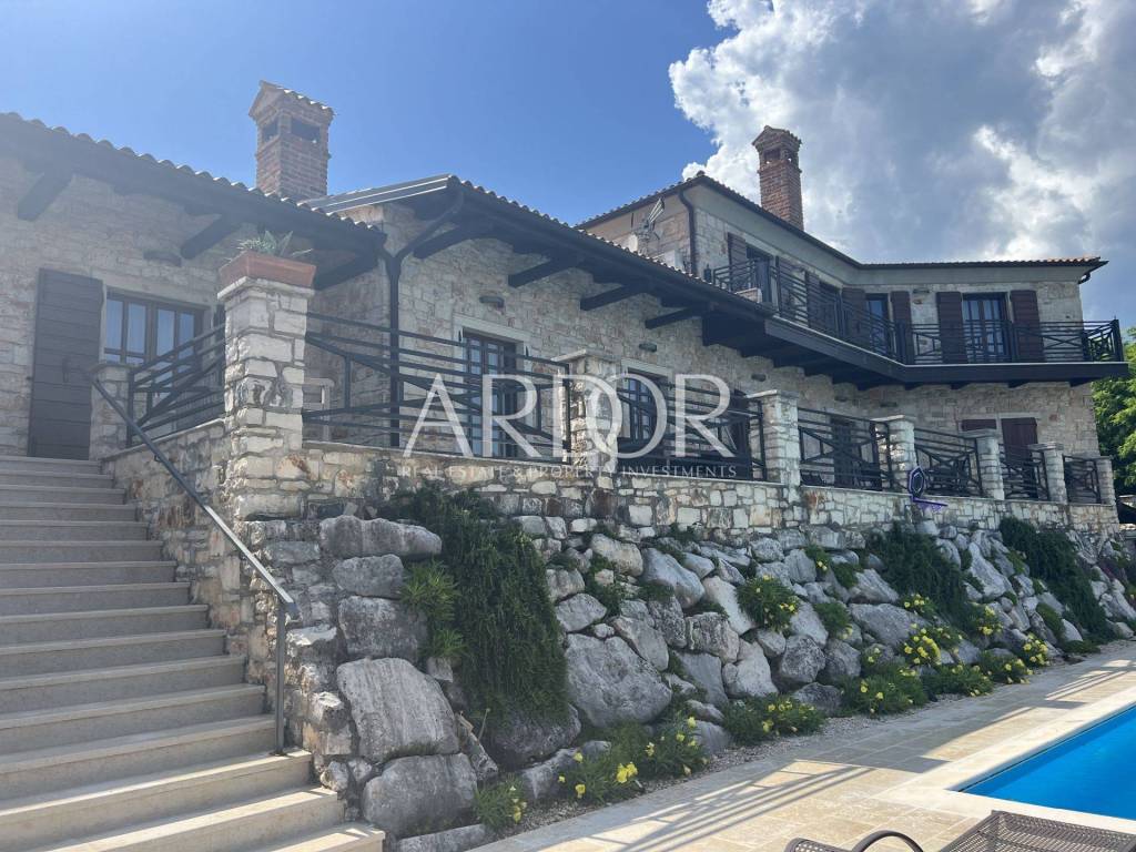 Eine Innentreppe führt in den ersten Stock, wo sich ein elegant eingerichtetes und ausgestattetes Arbeitszimmer und ein geräumiges Schlafzimmer mit offenem Badezimmer und separater Toilette befinden. Dieses Hauptschlafzimmer verfügt über einen Kamin, an dem Sie die kalten Winterabende genießen können, sowie über einen Ausgang zur Terrasse mit herrlicher Aussicht. Die Villa verfügt über einen Keller, in dem sich ein Raum zum Waschen und Trocknen von Kleidung, eine Sauna und eine Duschkabine befinden. Wir haben auch eine luxuriös eingerichtete Weinhandlung, in der Weinliebhaber eine intime Atmosphäre und geselliges Beisammensein genießen können. Die genannten Zimmer haben Zugang zum Garten. Für kältere Wintertage verfügt das Haus über eine eingebaute Ölzentralheizung und zwei Kamine, für heiße Sommertage wurden Klimaanlagen installiert. Die Böden sind mit Parkett und Terrakotta ausgelegt, was dem Raum einen besonderen Charme verleiht und perfekt zu Holz und Stein passt.