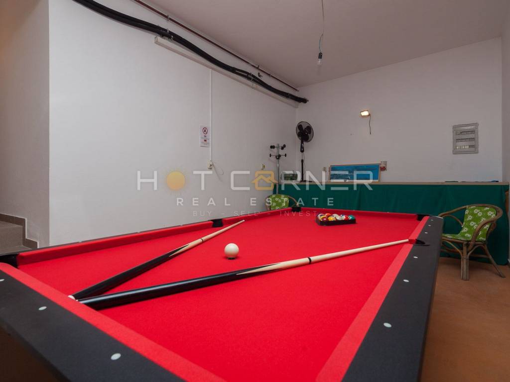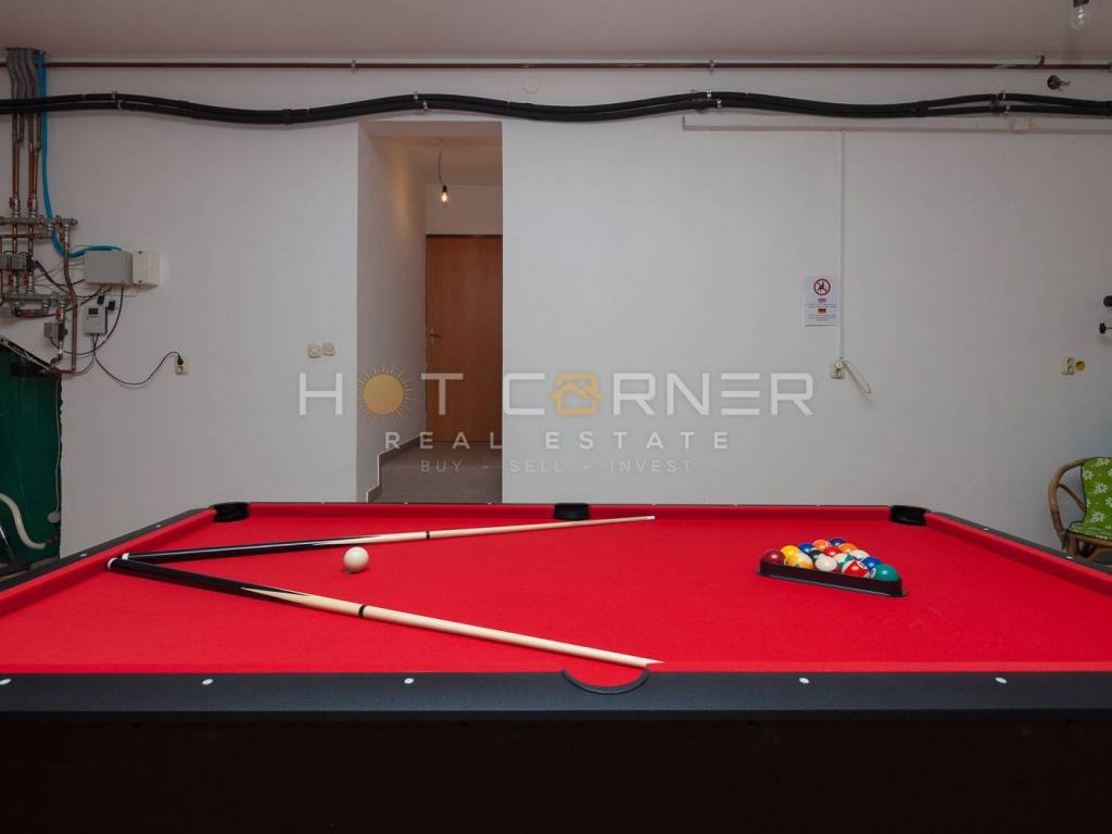 Im Erdgeschoss des Gebäudes befindet sich eine Garage für vier Autos und ein Spielzimmer (Tischtennis, Darts, Tischfußball ...) und ein Heizraum.