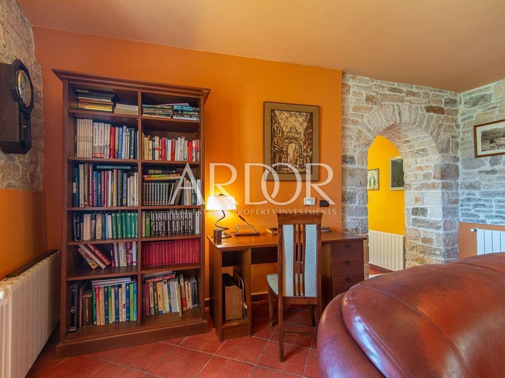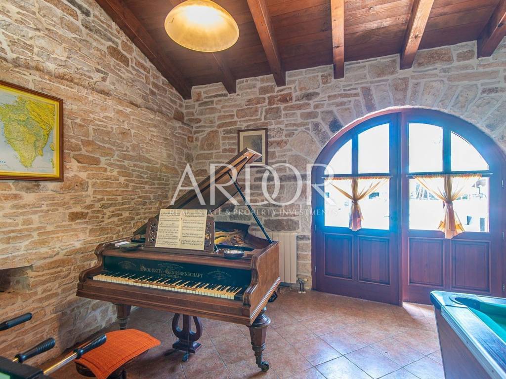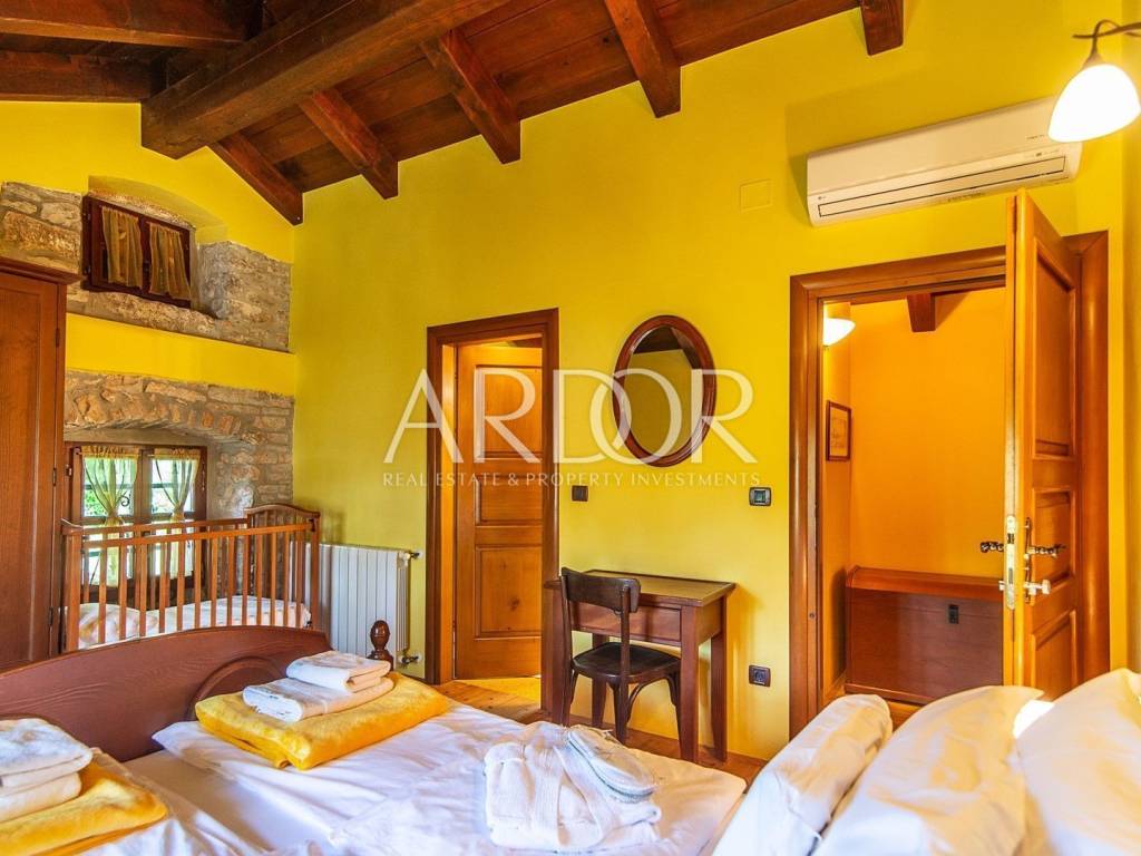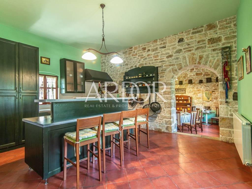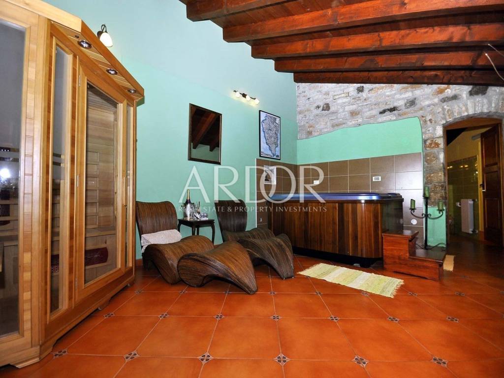 Žminj, wir verkaufen eine wunderschöne Luxusvilla im Zentrum Istriens. Es wurde 1709 erbaut und im Jahr 2020 einer kompletten Renovierung unterzogen, bei der es erneut gemäß den Bedingungen für die Kategorisierung von Stone Villas mit 5 Sternen renoviert wurde. Die Villa mit einer Gesamtbruttofläche von ca. 400 m2 wurde auf einem Grundstück von 1800 m2 errichtet. Es besteht aus 5 Schlafzimmern, 5 Badezimmern, Toilette, Wohnzimmer, Küche, Esszimmer, Ruheraum, Spielzimmer und Waschküche. Im gesamten Haus gibt es eine Zentralheizung und jedes Schlafzimmer ist klimatisiert. Vor dem Haus gibt es einen beheizten Swimmingpool mit automatischer Wasserdesinfektion und eine überdachte Terrasse mit Grill. Hinter dem Haus befindet sich ein Gartenhaus, das als Abstellraum dient. Eine ausgezeichnete Gelegenheit zum Wohnen oder als Investition, mit einer bereits bestehenden Miete.
