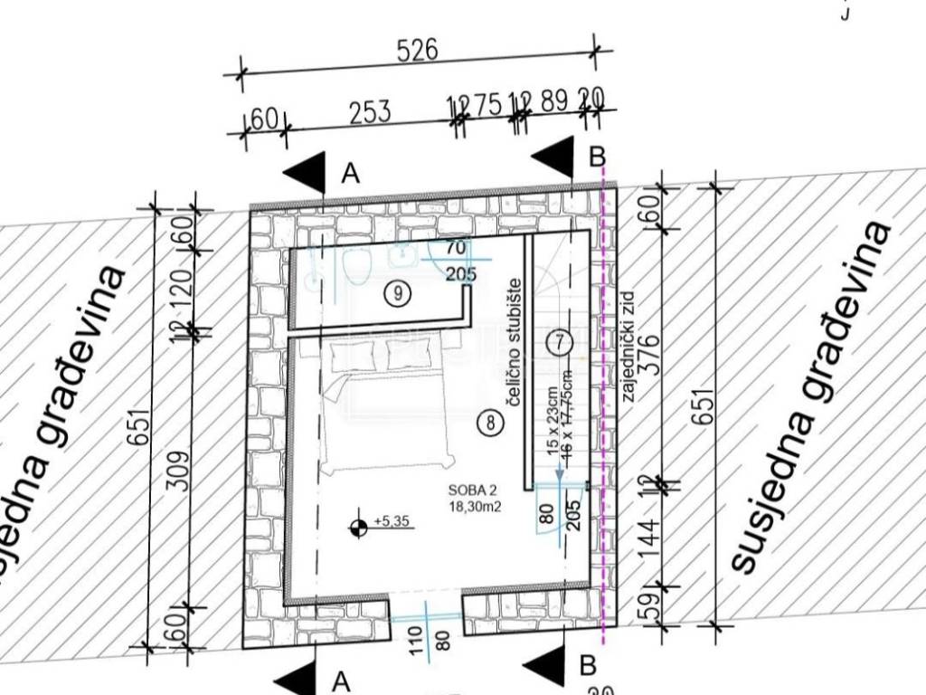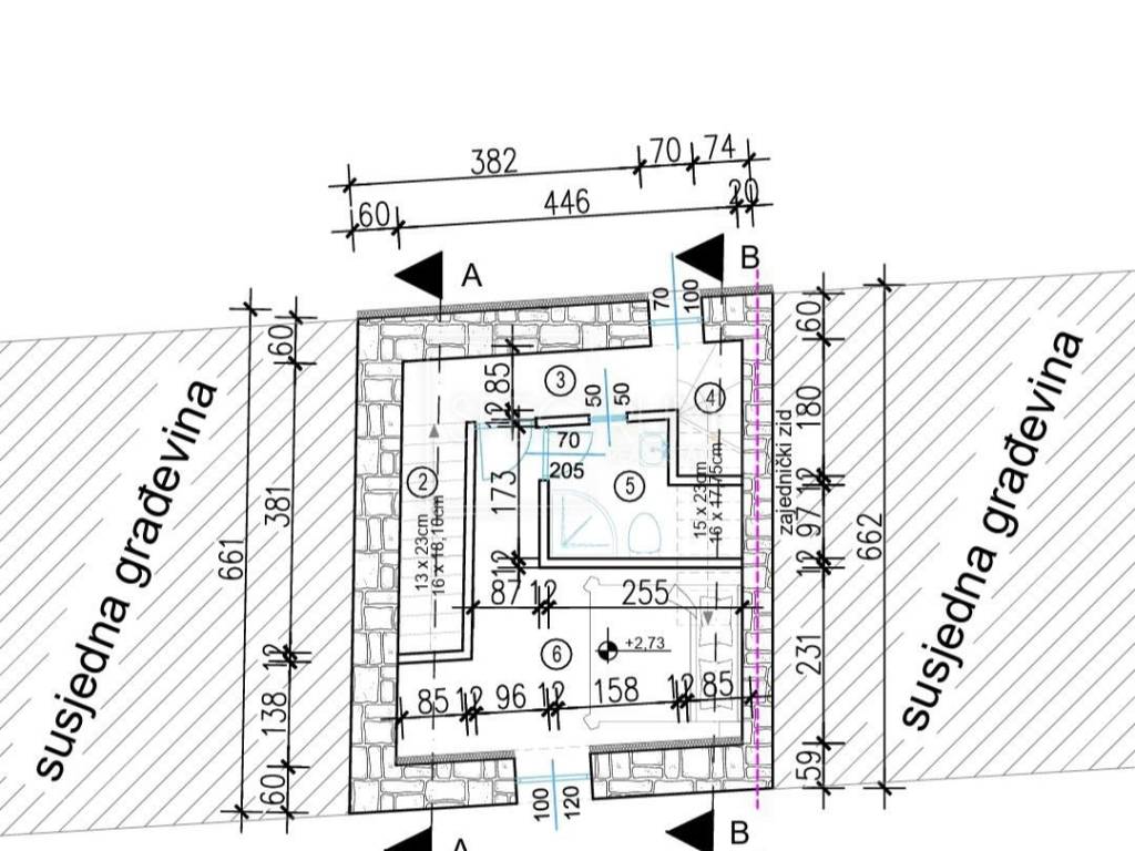 Es handelt sich um ein traditionelles istrisches Reihenhaus aus Stein, das sich über das Erdgeschoss, den 1. und den 2. Stock erstreckt. Die Wohnfläche beträgt 75 m². Im Erdgeschoss befindet sich ein Wohnzimmer mit offener Küche und Esszimmer. Eine Innentreppe führt in den 1. Stock, wo sich ein Schlafzimmer mit Bad befindet. Die Innentreppe führt auch in den 2. Stock, wo sich ebenfalls ein Schlafzimmer mit Bad befindet. Die Raumaufteilung richtet sich nach den Wünschen des neuen Eigentümers.