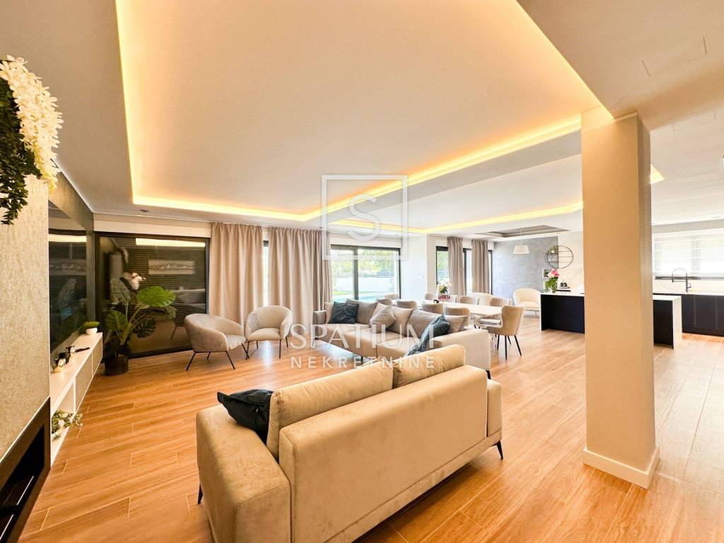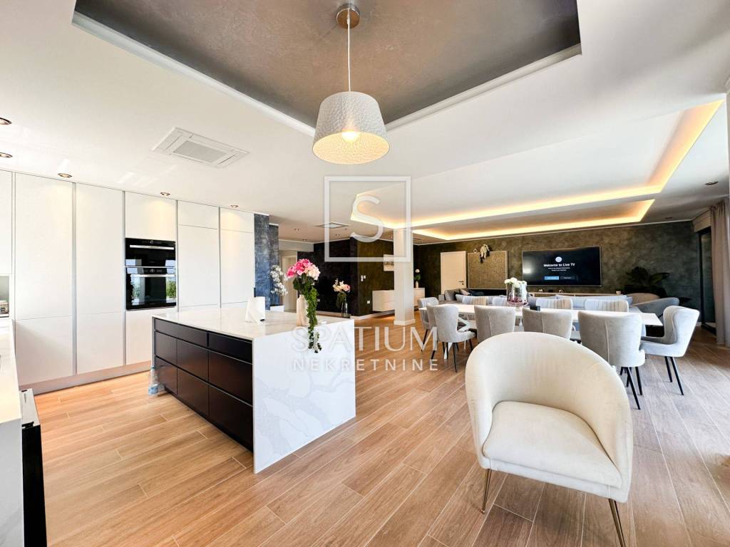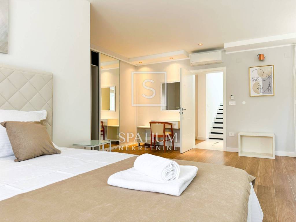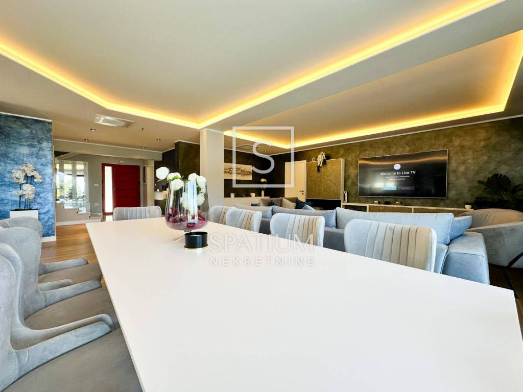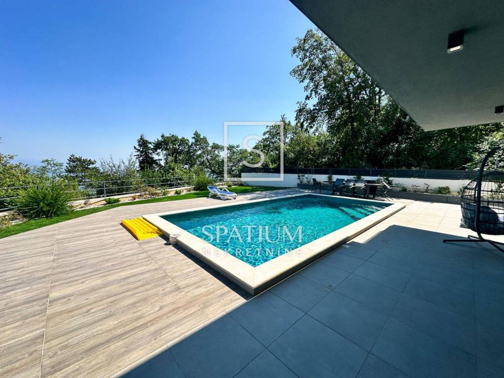 LOVRAN, OPRIĆ, wir bieten eine neu eingerichtete moderne Villa von 400 m2 mit einem schönen Pool und einem herrlichen Panoramablick auf das Meer. Dieses schöne Haus besteht aus insgesamt 5 geräumigen Schlafzimmern, jedes mit eigenem Bad und bietet maximale Privatsphäre und Komfort. Besonders hervorzuheben ist, dass die Schlafzimmer nach Süden ausgerichtet sind und Zugang zur Terrasse haben. Diese Villa ist ideal für Familien, die ein geräumiges und elegantes Zuhause suchen, das luxuriöse Annehmlichkeiten mit dem Komfort des Alltags verbindet. Ihre durchdachten Details, darunter Fußbodenheizung, moderne Küche, privater Pool und großzügige Dachterrasse, sorgen für ein außergewöhnliches Wohnerlebnis. Darüber hinaus sorgen ein privater Garten und fortschrittliche Sicherheitssysteme für ein friedliches und sicheres Leben. Für Familien mit Kindern gibt es ein spezielles Spielzimmer, in dem sie ihre Freizeit verbringen können. Die Küche ist mit modernsten Geräten ausgestattet, während maßgefertigte Einbauschränke viel Stauraum bieten. Eine große Dachterrasse mit einer Fläche von 200 m2 bietet einen wunderschönen Panoramablick auf das Meer. Die Terrasse ist mit Wasser- und Stromanschlüssen ausgestattet und eignet sich ideal zum Entspannen im Freien oder zum Verbringen von Zeit mit Freunden und Familie. Die Villa wird komplett möbliert und mit hochwertigen Möbeln verkauft. Es liegt nur 3 Autominuten von Lovran und nur 10 Autominuten vom Zentrum von Opatija entfernt. Oprić ist ein kleines Dorf in der Gespanschaft Primorje-Gorski Kotar an der Nordwestküste der Adria. Die Siedlung Oprić kann sich einer wunderschönen Natur und Nähe zum Meer rühmen, was sie für Touristen und Menschen, die einen ruhigen Ort zum Leben suchen, attraktiv macht. Obwohl Oprić kleiner ist, bietet es seinen Bewohnern und Besuchern die Möglichkeit, sich in einer natürlichen Umgebung zu entspannen und den Küstenlebensstil zu genießen. Für weitere Informationen wenden Sie sich bitte vertrauensvoll an uns. Silvio Orešković lizenzierter Vertreter +385 99 2358 666 silvio@spatium.hr Spatium nekretnine +385 51 272 903 info@spatium.hr