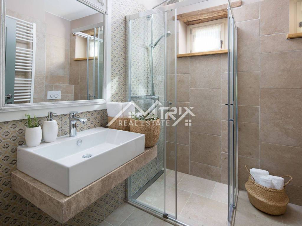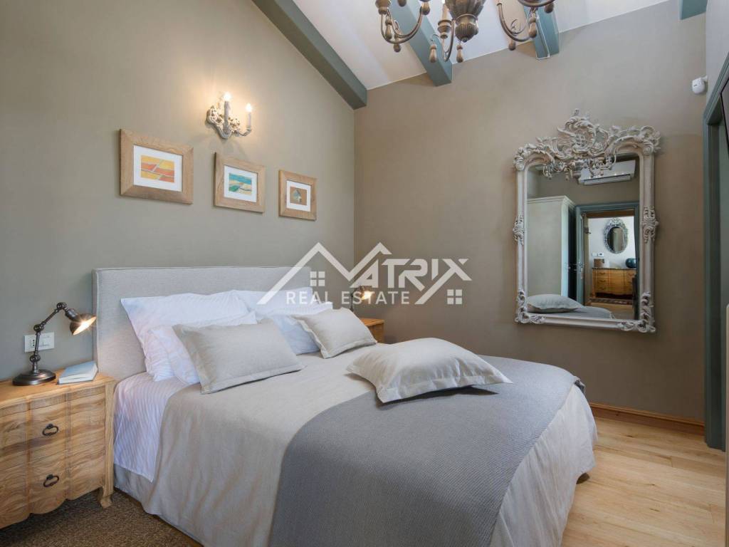 Im Obergeschoss befinden sich drei große Schlafzimmer mit jeweils eigenem Bad. Zwei Schlafzimmer haben Zugang zu einer eigenen Terrasse mit freiem Blick auf das Meer, die Natur und die Stadt Rovinj.