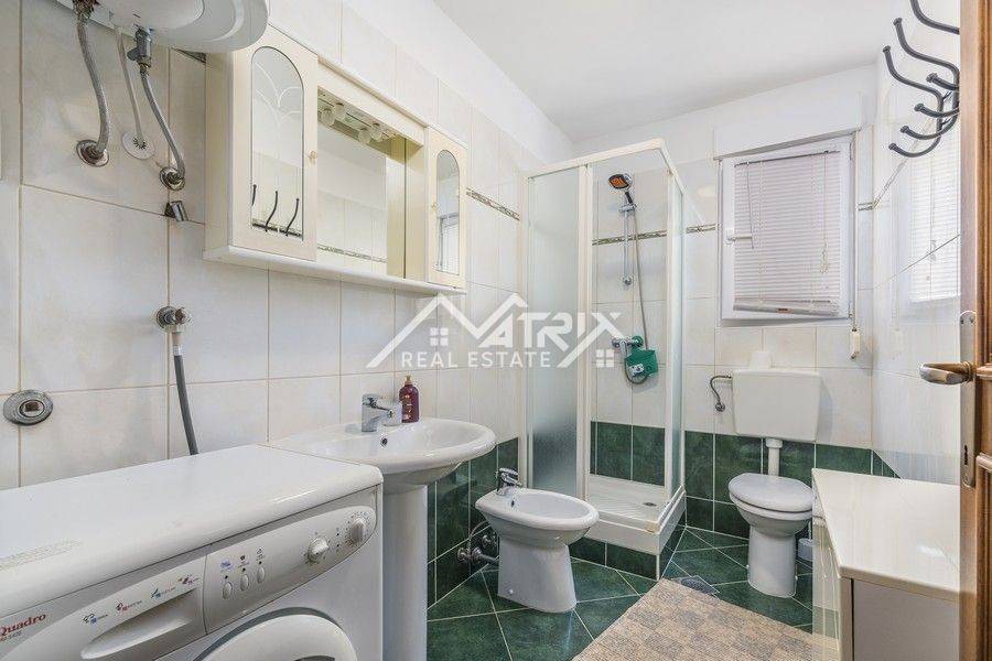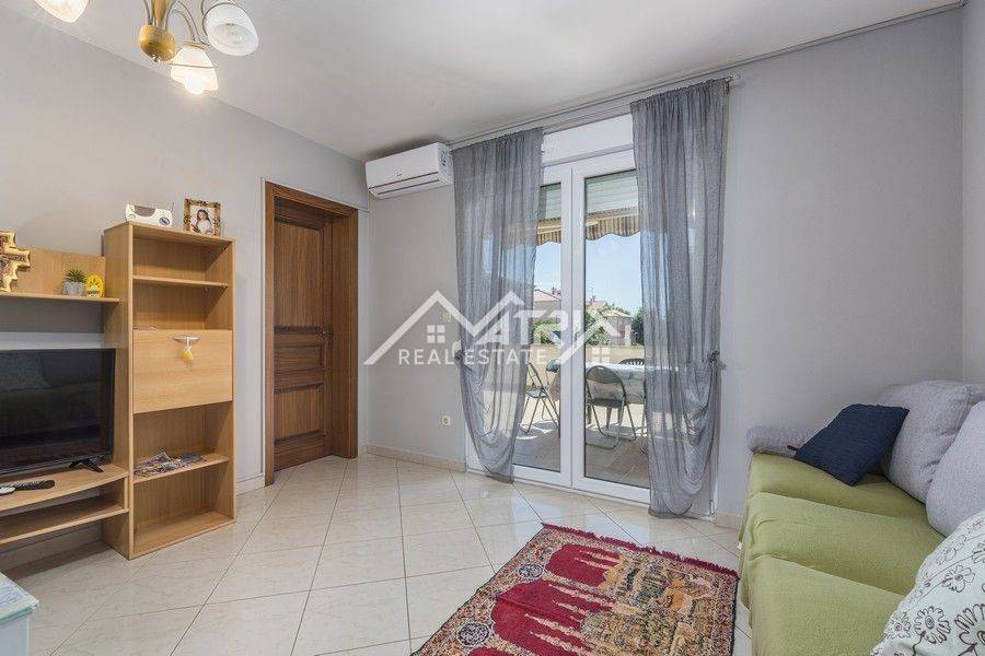 Eine Wohnung steht zum Verkauf in einer attraktiven Lage in Karigador, nur 200 Meter vom Meer und den schönen Stränden entfernt. Diese funktionale Wohnung befindet sich im Erdgeschoss eines Wohngebäudes und besteht aus zwei Schlafzimmern, einem voll ausgestatteten Badezimmer und einem Wohnzimmer mit Küche. Das Wohnzimmer führt auf eine große Terrasse mit Grillplatz, ideal zum Genießen warmer Sommerabende.