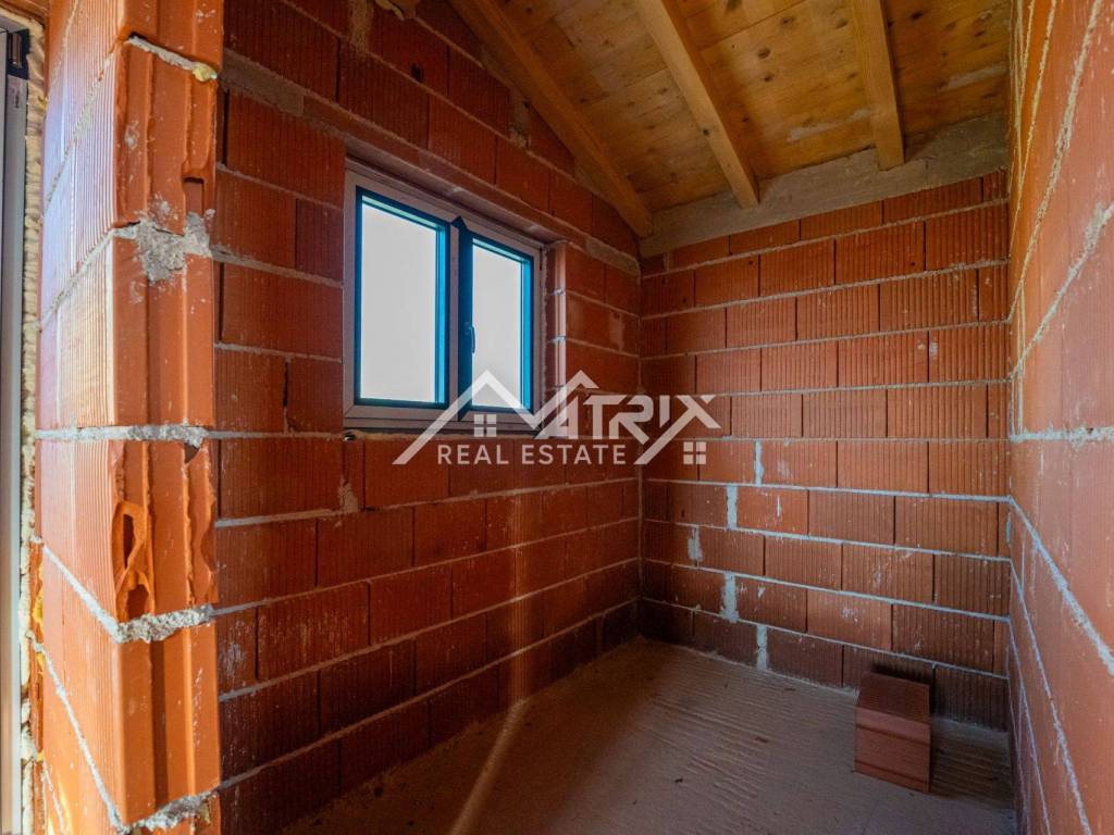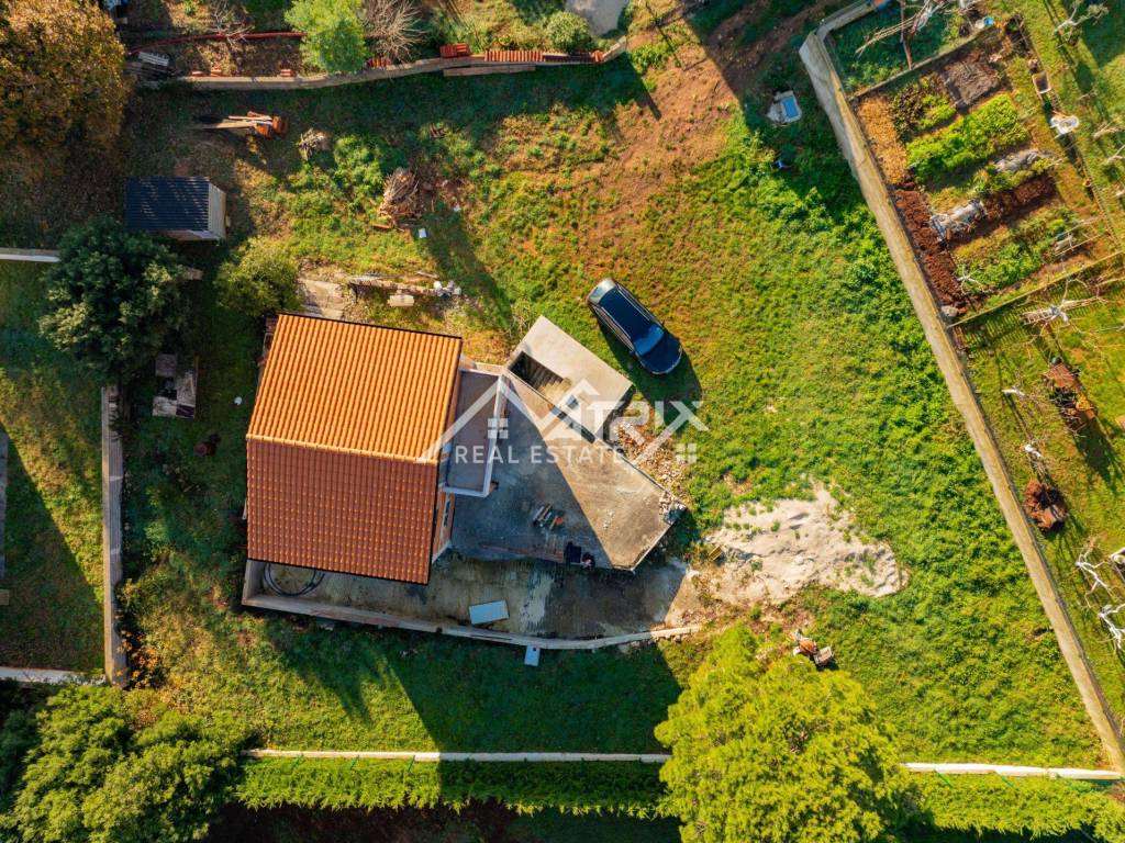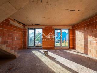 Die Gesamtwohnfläche des Hauses beträgt 110 m2, das Haus verfügt jedoch über eine aktive Baugenehmigung für den Bau eines viel größeren Hauses, was dem zukünftigen Eigentümer die Möglichkeit einer Modernisierung bietet. Im aktuellen Zustand verfügt das Erdgeschoss über einen überdachten Eingangsbereich und einen großzügigen offenen Raum, der Küche, Ess- und Wohnbereich verbindet, mit einer zusätzlichen Gästetoilette. Im ersten Stock befinden sich zwei Schlafzimmer, ein Badezimmer und Zugang zur gemeinsamen Terrasse. Am Eingang zum Erdgeschoss befindet sich außerdem ein zusätzlicher externer Abstellraum, ideal zum Abstellen von Sachen oder Fahrrädern.