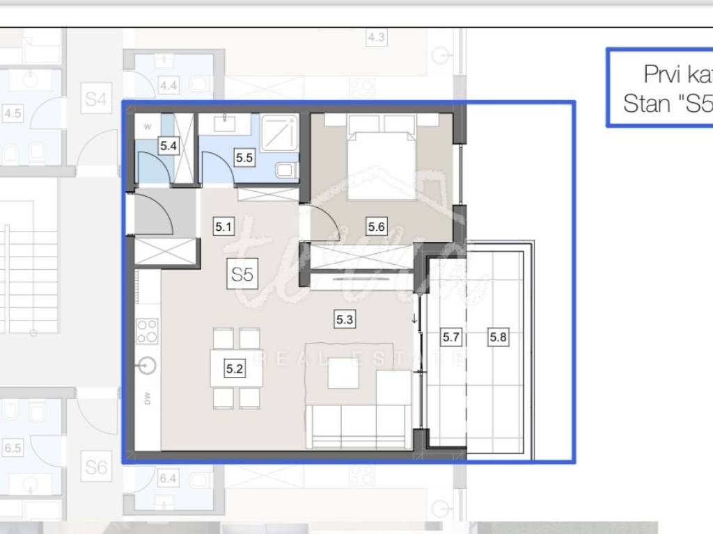 Die Wohnung mit einer Gesamtfläche von 54,54 Quadratmetern besteht aus Flur, Schlafzimmer, Küche, Esszimmer, Wohnzimmer, Badezimmer, Hauswirtschaftsraum und zwei überdachten Terrassen.