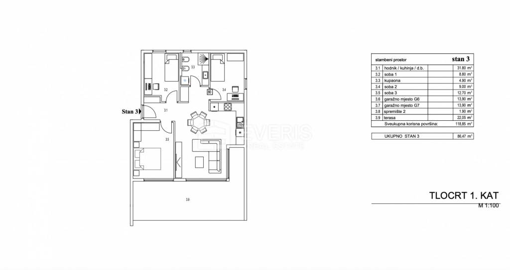 Die Immobilie befindet sich im ersten Stock eines Neubaus mit insgesamt fünf Wohneinheiten. Sie besteht aus: Flur, Küche mit Wohnzimmer, Badezimmer, drei Schlafzimmern mit einer Nettofläche von 67,10 m² sowie dem Nebenbereich der Wohnung: überdachte Terrasse mit einer Gesamt-Nettofläche von 22,05 m² (Wohnwertfläche 5,51 m²).