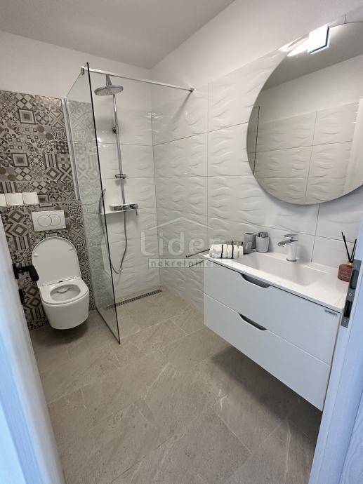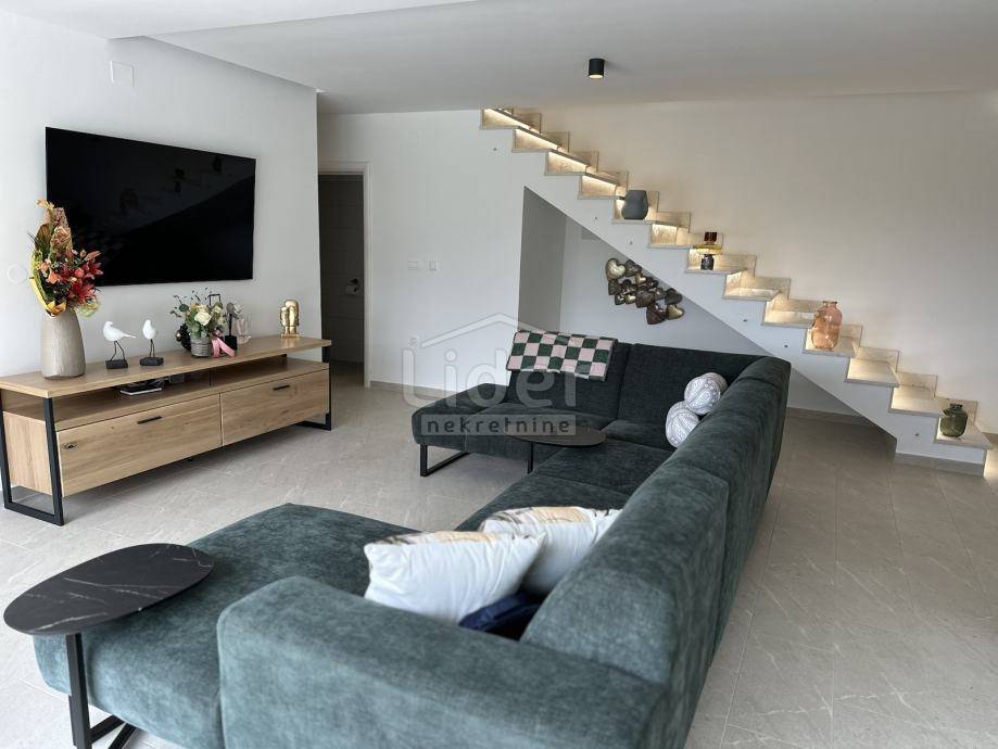 Im wunderschön angelegten und umzäunten Garten befindet sich ein Kinderpark mit Unterhaltung für die Kleinsten, ein Grill, ein Swimmingpool (8x4m) mit Wassererwärmungssystem, ausgestattet mit Wärmepumpe und automatischem Chemikalienspender. Mediterrane Pflanzen und Gräser im Garten werden durch ein intelligentes Bewässerungssystem gepflegt. Die Garage mit Fernöffnung und die Waschküche haben eine Gesamtfläche von 54 m2. Der Zufahrtshof ist durch ein Tor mit Fernbedienung von der Straße getrennt und bietet Platz für 10 oder mehr Fahrzeuge.
