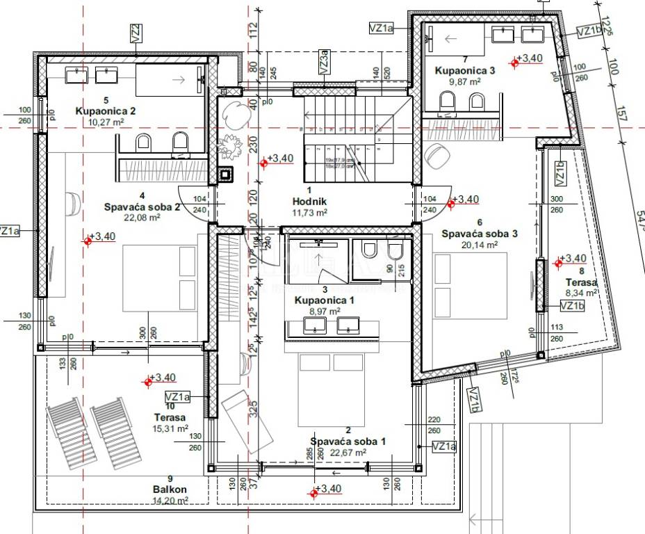 Die Innentreppe führt in die erste Etage, wo sich drei große, schöne Schlafzimmer mit eigenem Bad und Glaswänden befinden, jedes Zimmer hat außerdem Zugang zu einer eigenen Terrasse mit Blick auf den schönen Garten und den Swimmingpool.