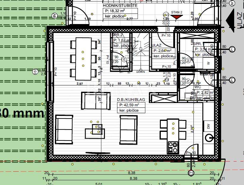 Zur Wohnung gehört ein Garten (Terrasse), in dem Sie an warmen Sommertagen bei einer leichten Brise genießen und geselliges Beisammensein genießen können. Der Zugang zur Terrasse erfolgt durch eine große Glaswand, die im Bereich des Esszimmers, des Wohnzimmers und der Küche, die auch über ein eigenes Fenster verfügt, für eine große Lichtquelle sorgt.