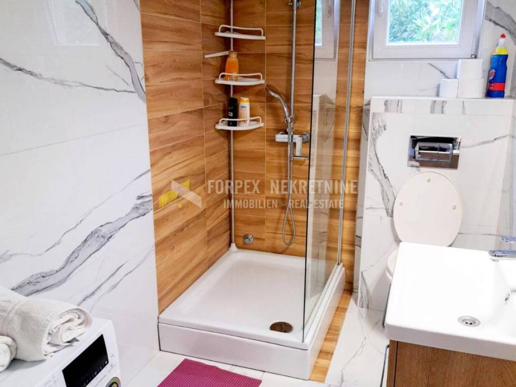 In Crikvenica, nur 200 Meter vom Meer entfernt, steht eine 74 m² große Immobilie zum Verkauf. Im Erdgeschoss befindet sich ein ehemaliger Nebenraum, der zu einem 22 m² großen Studio-Apartment umgebaut wurde. Im ersten Stock liegt eine 50 m² große Wohnung mit zwei Schlafzimmern, einem Badezimmer, einer Küche, einem Wohnzimmer und einer Terrasse mit Meerblick. Die Wohnungen sind komplett möbliert und ausgestattet und werden im Ist-Zustand verkauft. Zur Wohnung gehören zwei Parkplätze im Garten.