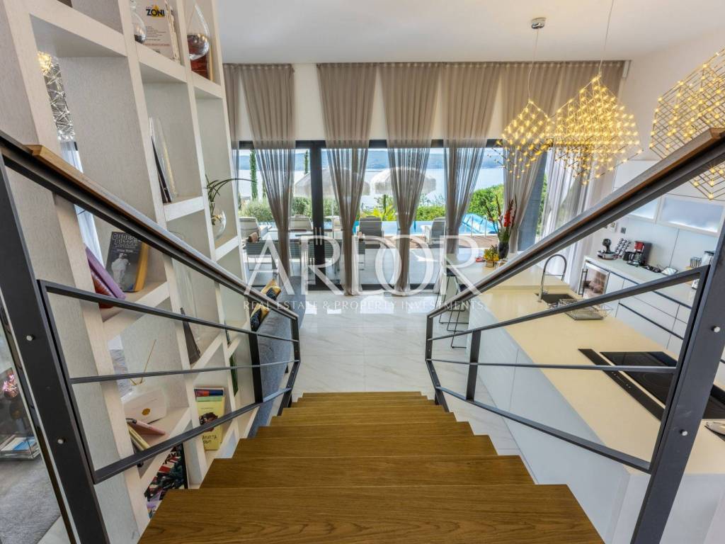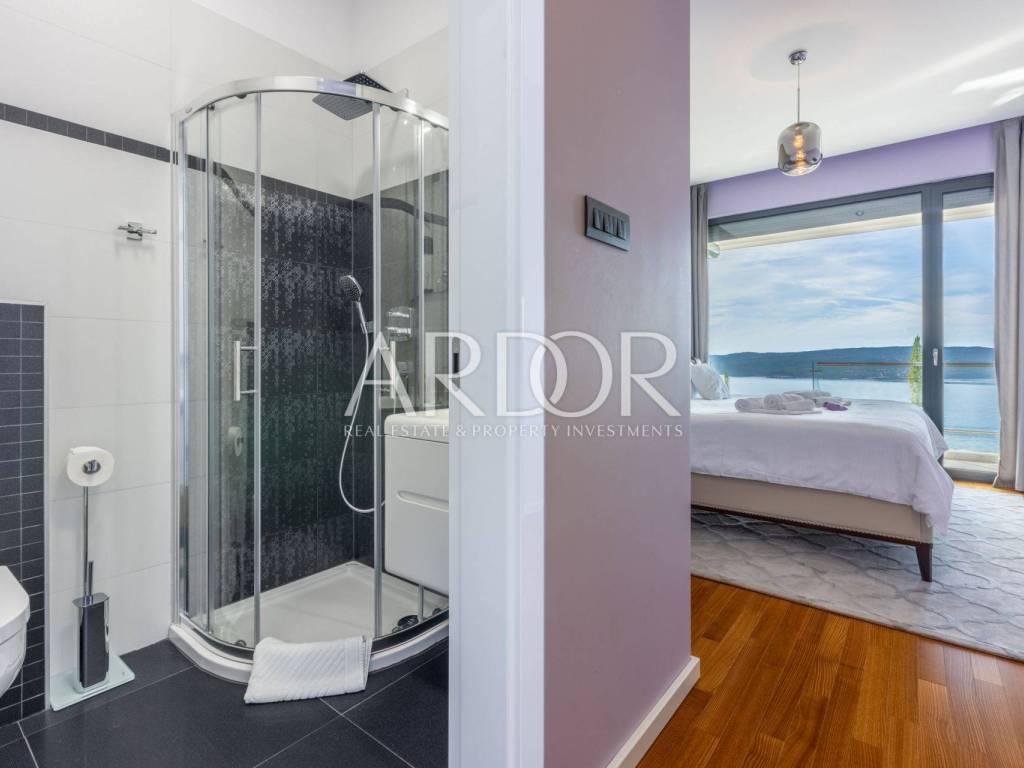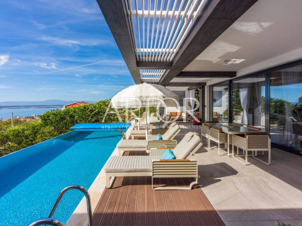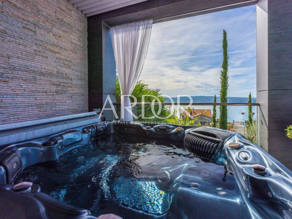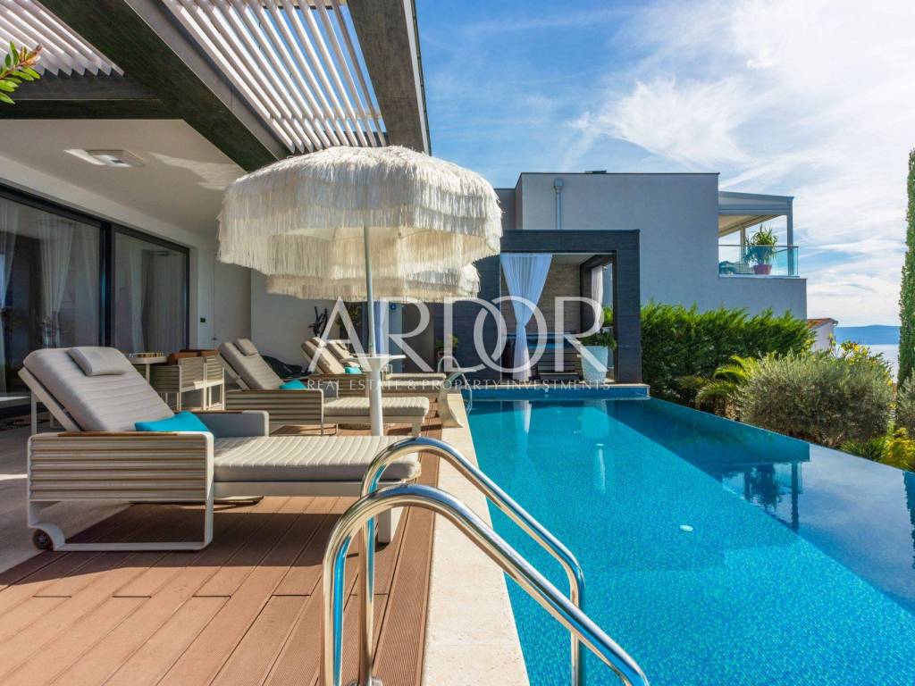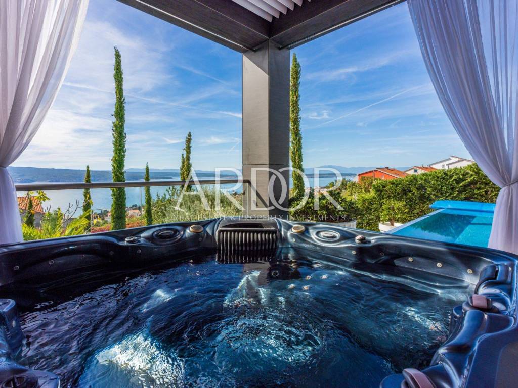 Crikvenica ist ein beliebtes Urlaubsziel, eine kleine Stadt an der Kvarner Küste. Sonne, frische Luft und der Duft des Meeres sowie grüne Parks und Promenaden sind unwiderstehliche Gründe für einen Besuch an der Crikvenica Riviera. Auf einer Anhöhe, mit einem atemberaubenden Panoramablick auf das Meer, liegt diese luxuriöse Villa in einem sorgfältig angelegten und grünen Garten. Die Villa ist so konzipiert, dass sie maximalen Komfort und Privatsphäre bietet, das Haus ist vollständig zum Meer hin ausgerichtet und ermöglicht allen Zimmern einen herrlichen Ausblick, während ausgewählte Vegetation die Privatsphäre in allen Außenbereichen gewährleistet. Mit hochwertigen Materialien für Langlebigkeit und Qualität gebaut, erfüllt diese Villa hohe Standards im Innen- und Außenbereich. Ein ausgeklügeltes Heiz- und Kühlsystem, Fußbodenheizung sowie ein beheizter Pool sorgen ganzjährig für eine angenehme Atmosphäre. Auch die Sicherheit ist auf hohem Niveau, dank der Videoüberwachung des Außenbereichs des Anwesens. Die Villa erstreckt sich über zwei Etagen und bietet vier geräumige Schlafzimmer, jedes mit eigenem Bad. Das offene Konzept von Küche, Esszimmer und Wohnzimmer erweitert den Raum zu den Außenterrassen und schafft eine einzigartige Einheit mit einem der schönsten Ausblicke in Crikvenica. Voll ausgestattet und modern eingerichtet, erzielt diese Immobilie bereits hervorragende Ergebnisse im touristischen Angebot, was sie sowohl für den privaten Genuss als auch als geschäftliche Investition mit hoher Rentabilität zur perfekten Wahl macht.