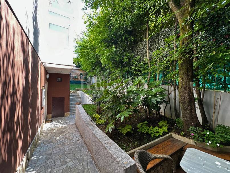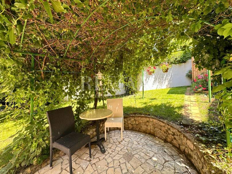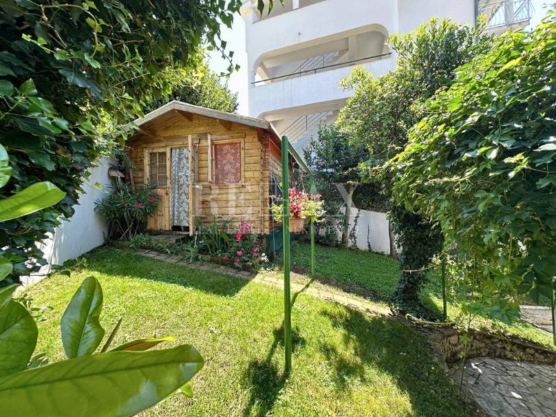 Das Haus erstreckt sich über zwei Etagen, die durch eine Außentreppe verbunden sind, was zusätzliche Funktionalität bietet. Das Erdgeschoss ist perfekt für Gäste oder zur Vermietung geeignet, da es aus einem Studio-Apartment und einem Ein-Zimmer-Apartment besteht, beide mit direktem Zugang zum gepflegten Garten. Stellen Sie sich vor, wie Sie Ihren Morgenkaffee oder Abendtee in dieser ruhigen Oase genießen, umgeben von Grün.