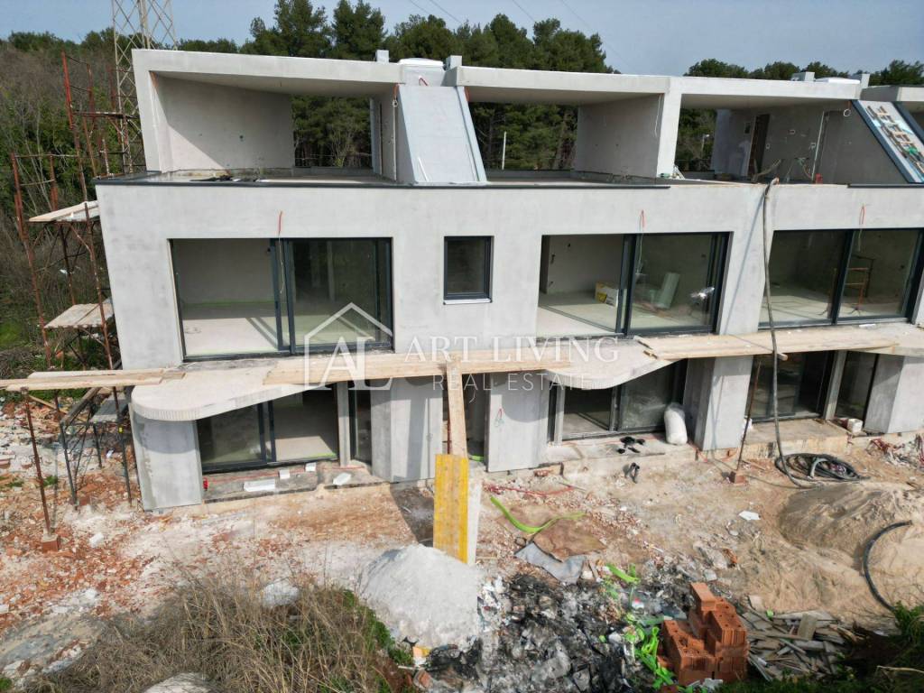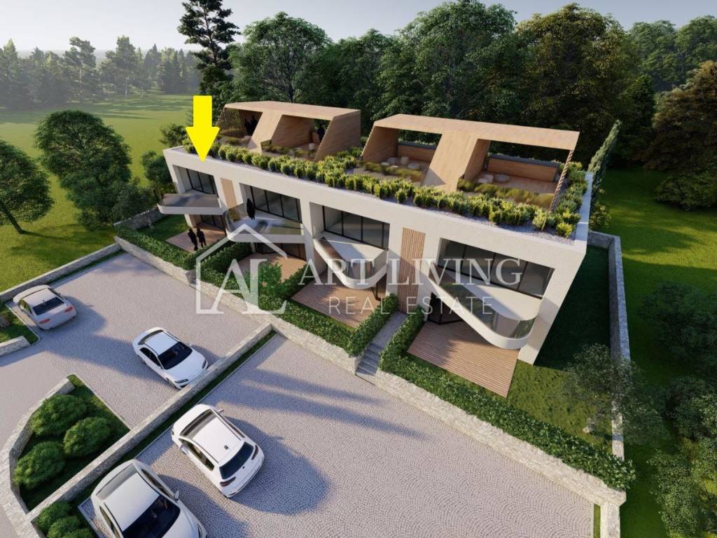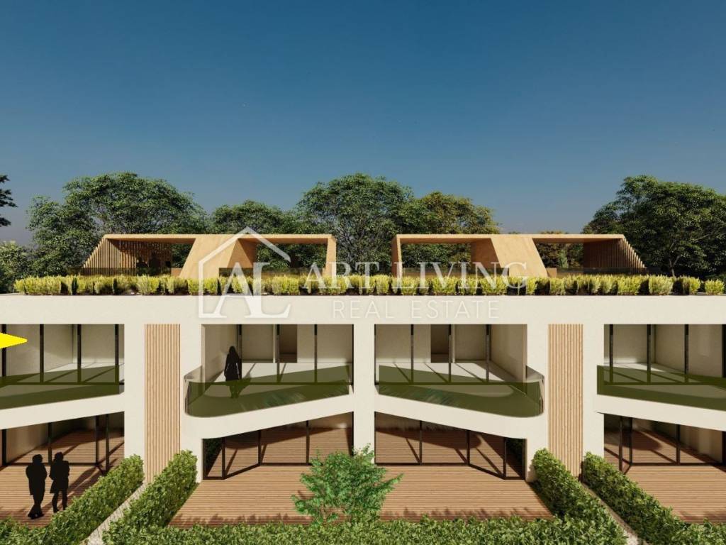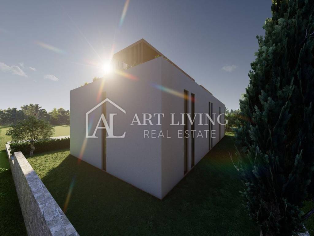 Die 65 m2 große Wohnung besteht aus einem Wohnzimmer mit offener Küche und Esszimmer, 1 Schlafzimmer, einem Abstellraum, einem Badezimmer, einem Flur und einer überdachten Terrasse. Die Wohnung verfügt außerdem über eine großzügige Dachterrasse mit einer Fläche von 31 m2, auf der sich eine Toilette befindet und auf Wunsch eine Sommerküche und ein Whirlpool mit herrlichem Blick auf die Natur und die wunderschöne istrische Landschaft installiert werden können.
