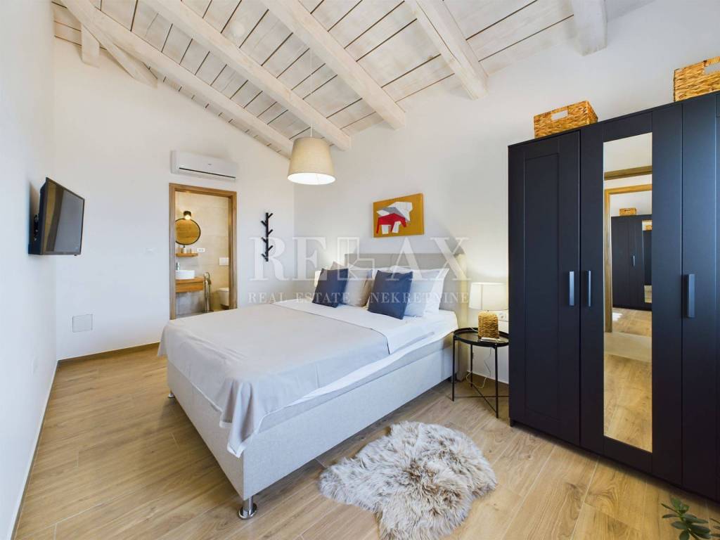 Fünf Parkplätze, darunter zwei in der Garage und drei davor, tragen zur Bequemlichkeit dieser Immobilie bei. Die Villa wurde aus hochwertigem istrischem Kanfanar-Stein gebaut, der Langlebigkeit und ästhetische Anziehungskraft gewährleistet und sich perfekt in die natürliche Umgebung einfügt.