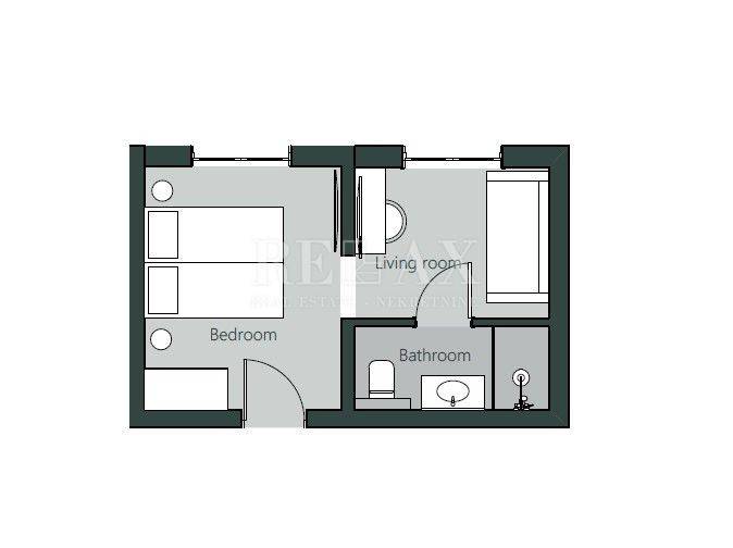 Der Grundriss umfasst einen Wohnbereich, ein Schlafzimmer und ein Badezimmer, funktional organisiert, um jeden Quadratmeter optimal zu nutzen. Ideal für Einzelpersonen, Paare oder als Investitionslösung für kurzfristige Vermietung – diese Wohnung bietet Komfort ohne Überflüssiges.