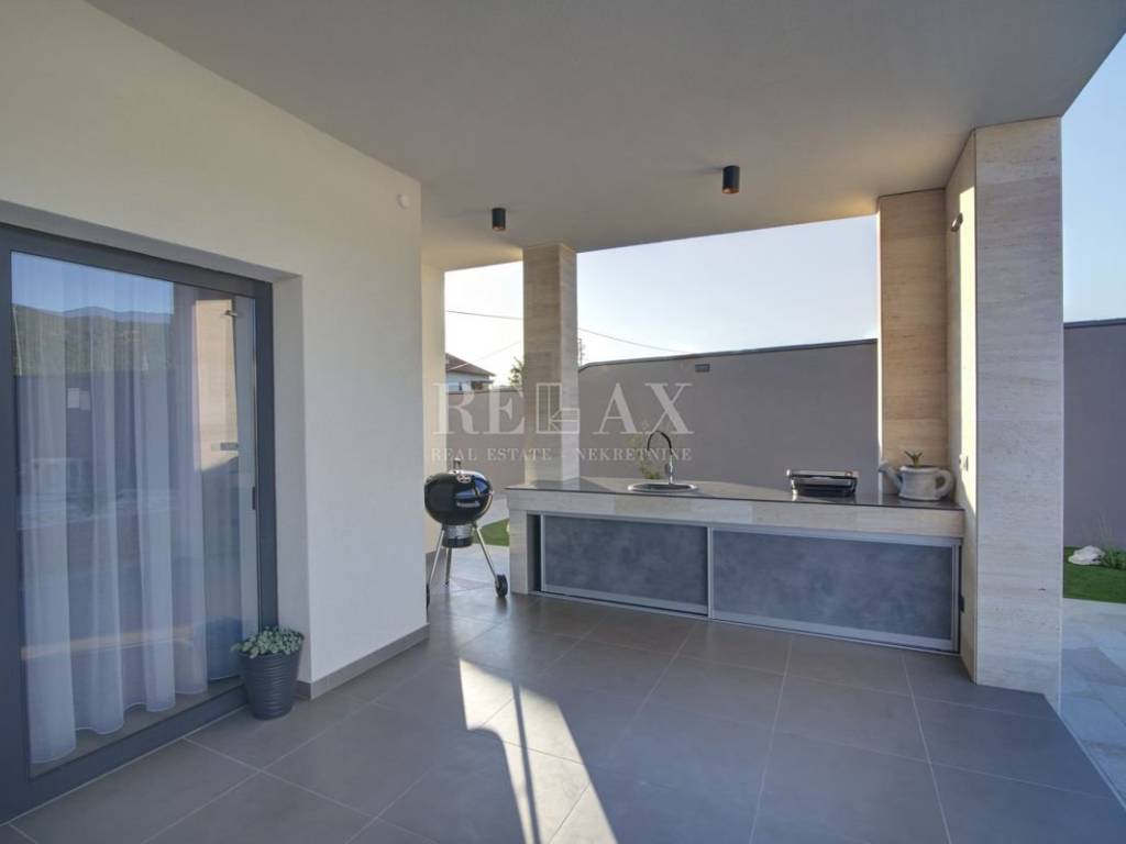 Das Haus besteht aus einer Eingangshalle, einer Toilette, einem Schlafzimmer mit Badezimmer, einem geräumigen Wohnzimmer, einer Küche mit einer Kücheninsel mit sechs Stühlen und einem Ausgang zu einer überdachten Terrasse, auf der sich ein Grill und eine Sommerküche befinden.