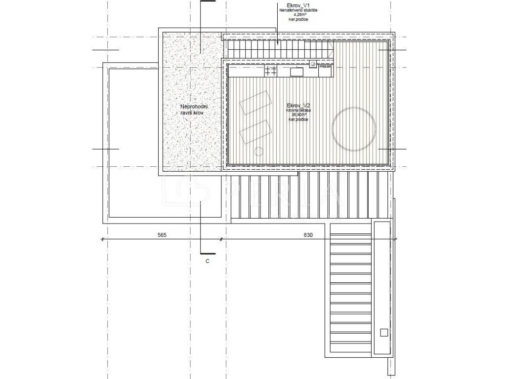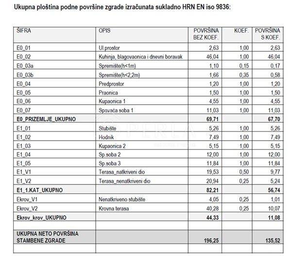 Die gesamte Nettofläche ohne Koeffizient beträgt 196,25 m², die gesamte nutzbare Nettofläche 135,52 m².