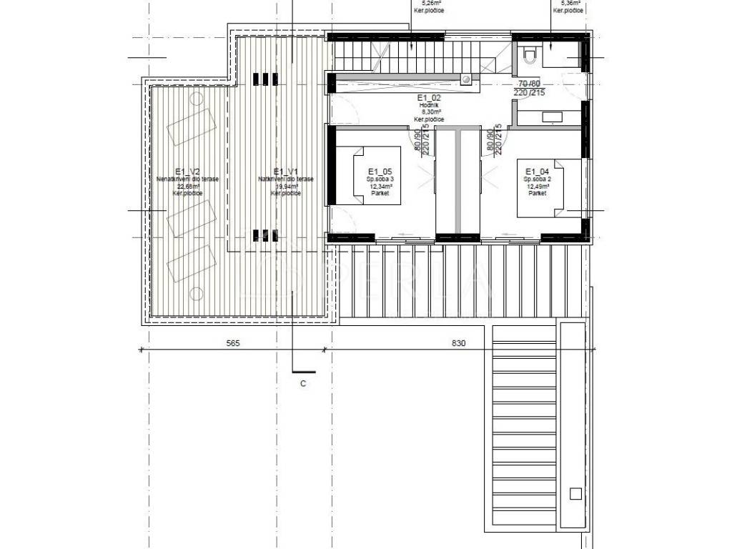 Im Obergeschoss befinden sich zwei Schlafzimmer (12 m² und 11,84 m²), ein Badezimmer und eine geräumige Terrasse (19,53 m² überdachter Teil und 20,94 m² nicht überdachter Teil der Terrasse).