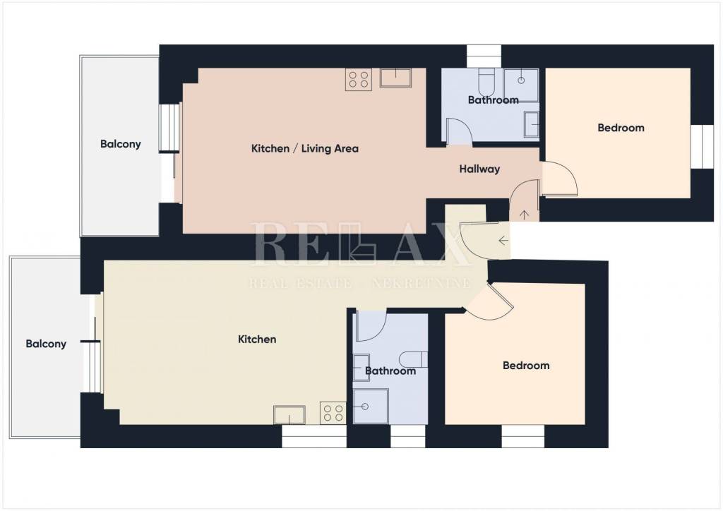 Jede Wohnung verfügt über einen funktionellen Grundriss mit Wohnzimmer, Küche und Essbereich, Badezimmer, Schlafzimmer, Flur und Zugang zum Balkon. Die Gesamtfläche der Balkone beträgt zusätzliche 17,20 m² und bietet einen angenehmen Blick auf das Meer und die Umgebung. Die Süd- und Westausrichtung sorgt den ganzen Tag über für viel natürliches Licht.