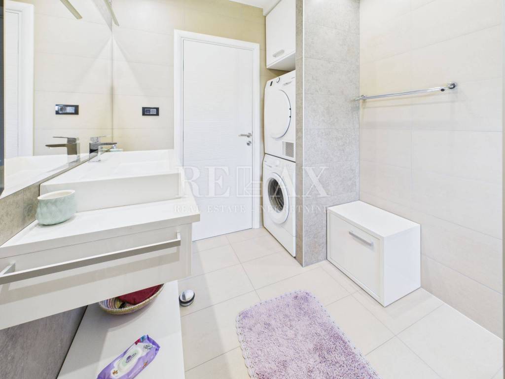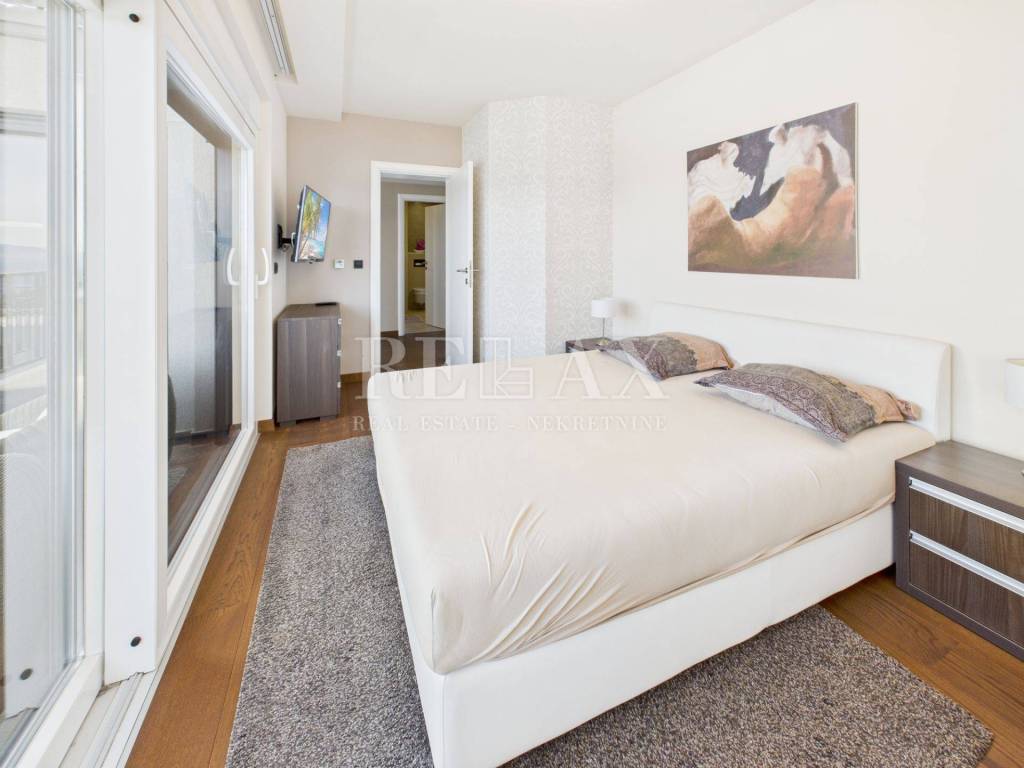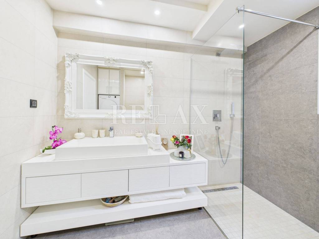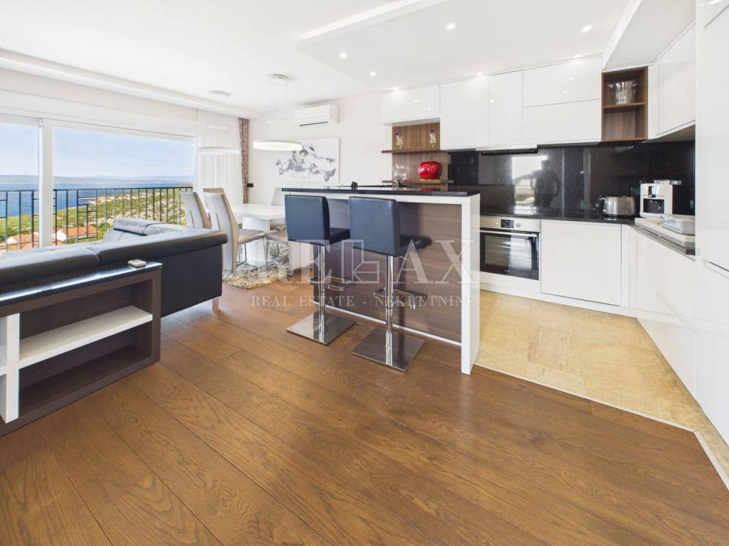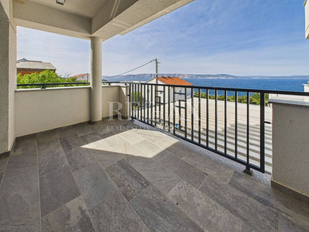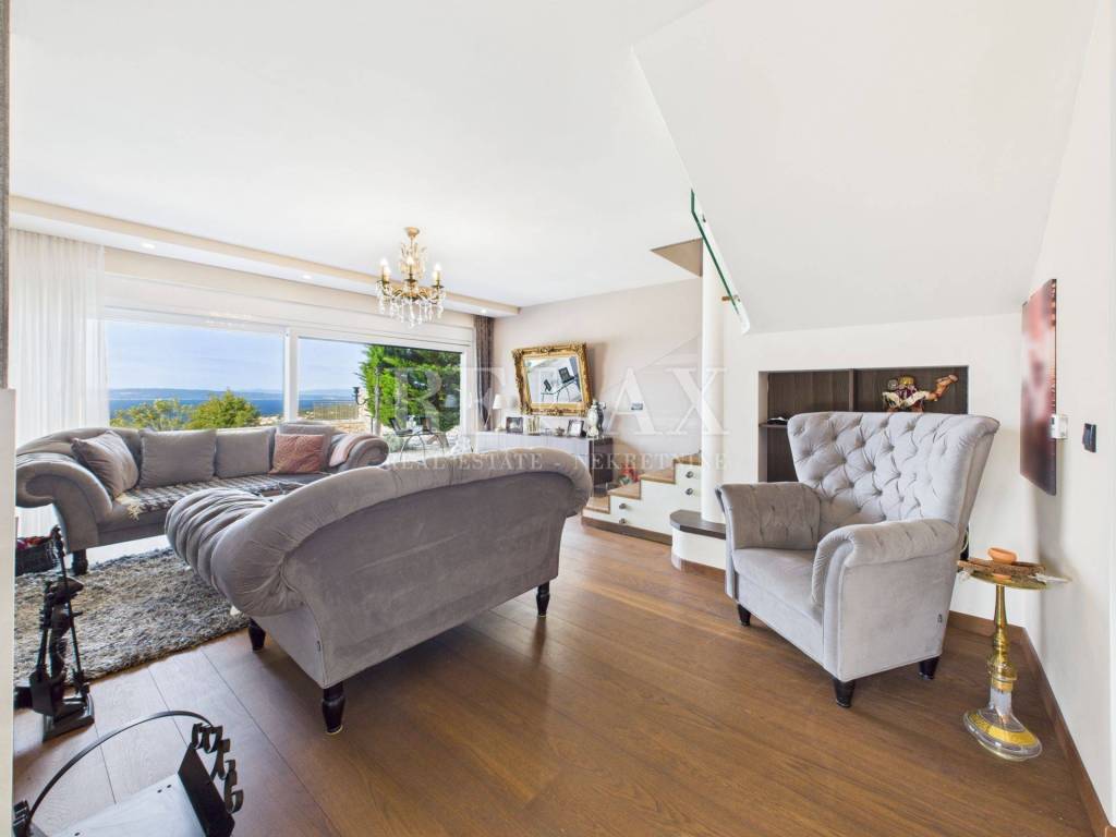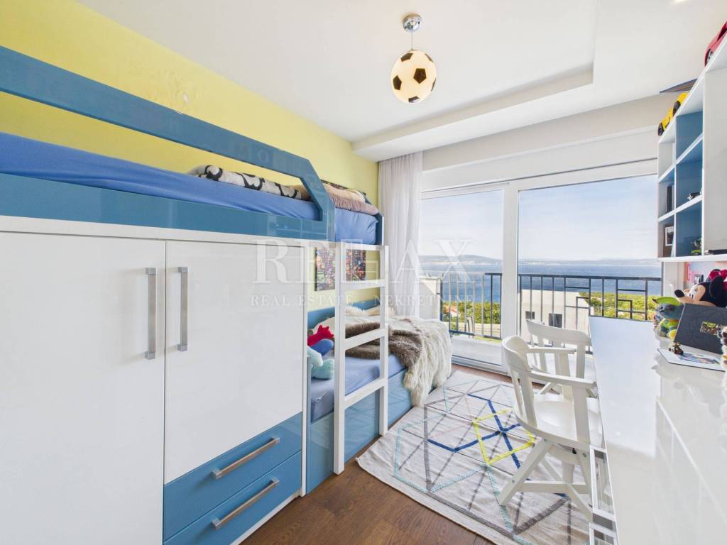 Im oberen Stockwerk der Villa befindet sich eine helle Einzimmerwohnung mit Wohnzimmer und großen Balkonen, die einen Panoramablick auf das Meer bieten. Beide Wohneinheiten verfügen über separate Eingänge, und der hintere Teil des Hauses bietet zusätzliche Privatsphäre.
