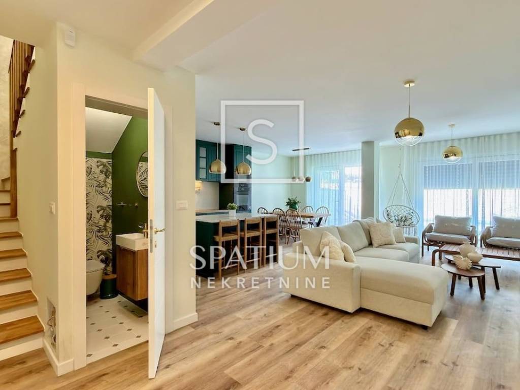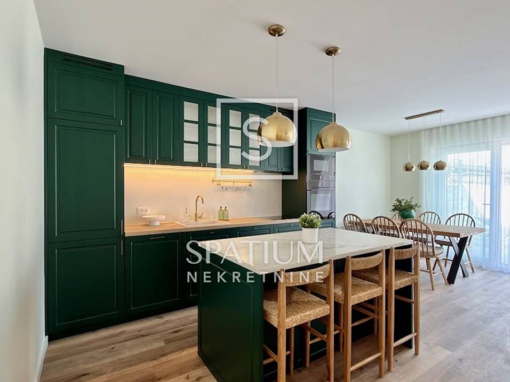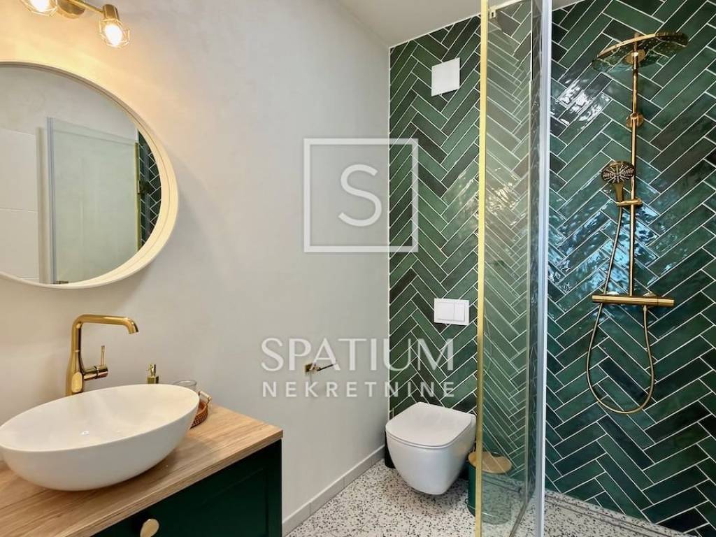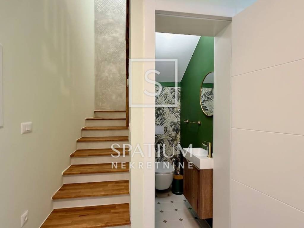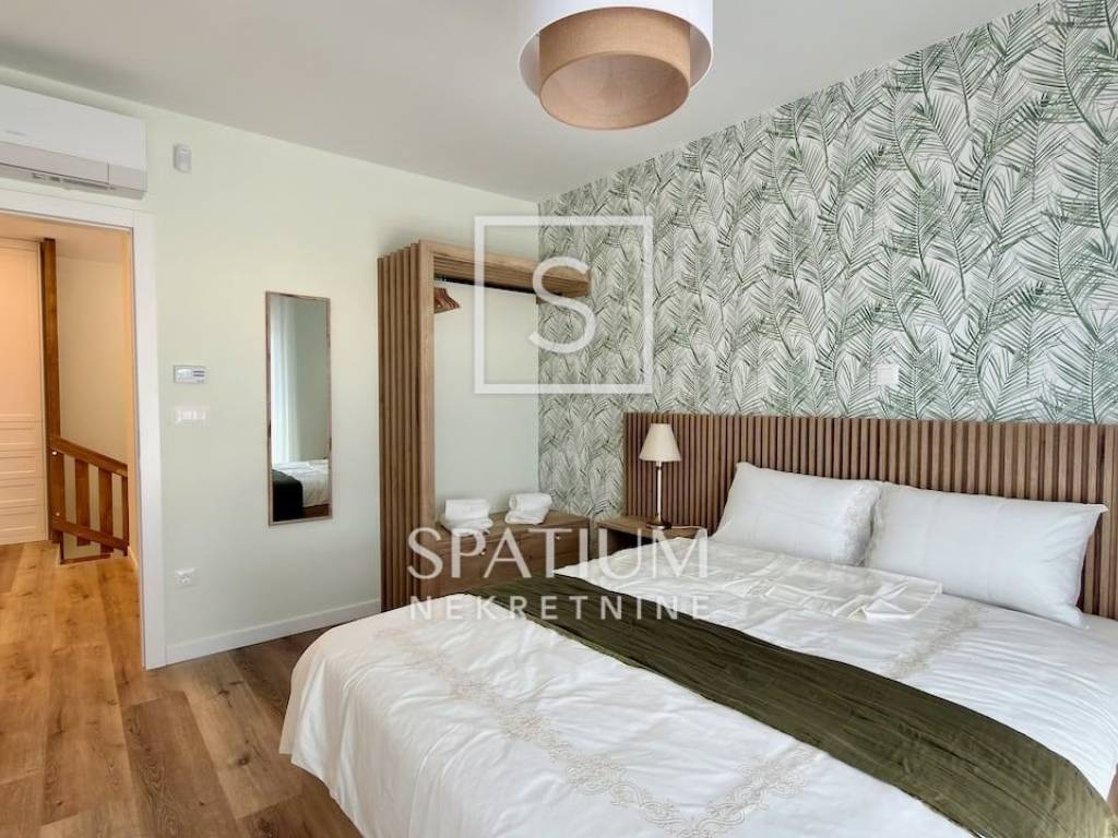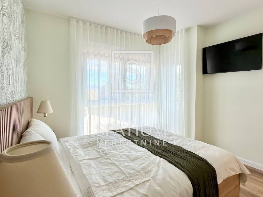 LOVRAN, wir bieten Ihnen eine geschmackvoll möblierte und ausgestattete Maisonette-Wohnung mit zwei Schlafzimmern und Pool in einem Neubau in fußläufiger Entfernung zum ersten Strand und der Altstadt von Lovran. Im Erdgeschoss befindet sich der großzügige Wohnbereich mit Küche, Esszimmer und Wohnzimmer, von dem aus Sie auf die Terrasse mit Pool gelangen. Neben der Innentreppe befindet sich ein Gäste-WC. Im ersten Stock befinden sich zwei Schlafzimmer mit jeweils eigenem Bad für maximalen Komfort. Das Hauptschlafzimmer verfügt über einen Balkon mit teilweisem Meerblick. Die Wohnung zeichnet sich durch einen optimalen Grundriss, hochwertige, maßgefertigte Möbel und ein stilvolles Design aus. Zur Wohnung gehören drei Außenstellplätze, ein weiterer Parkplatz befindet sich in der Nähe.