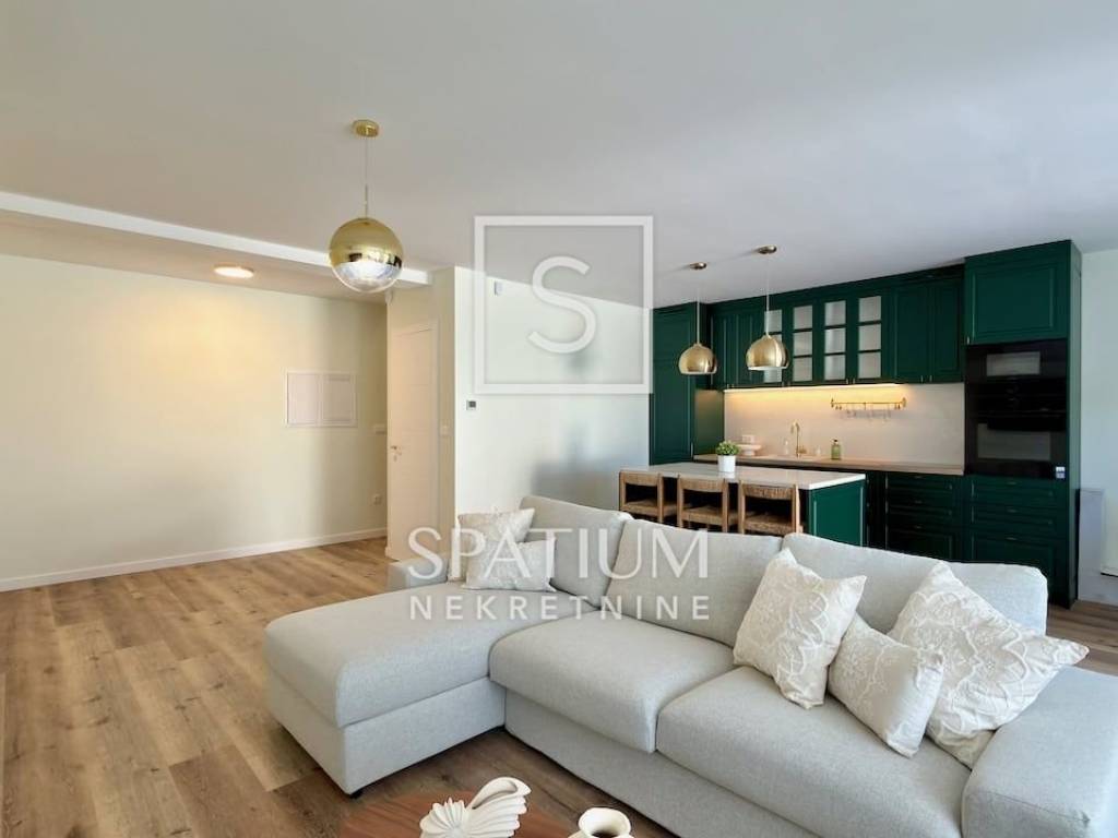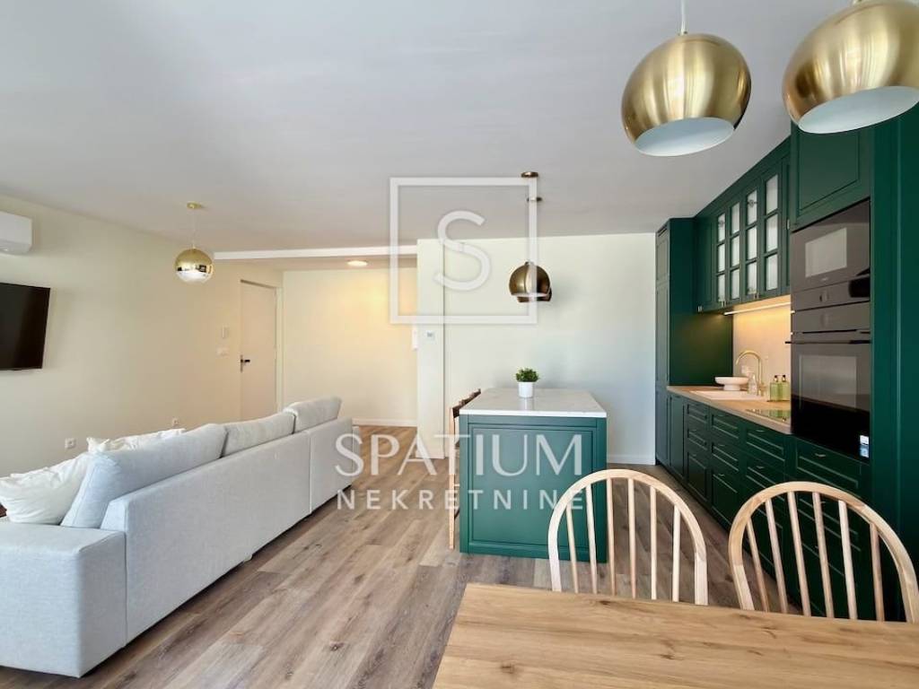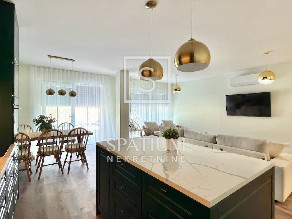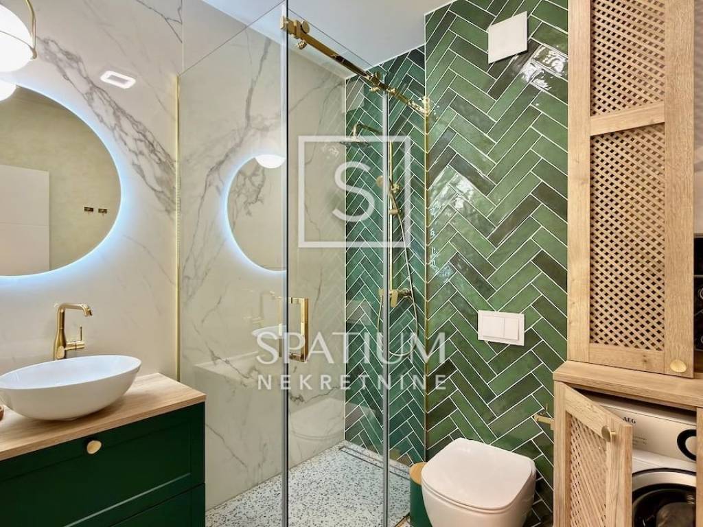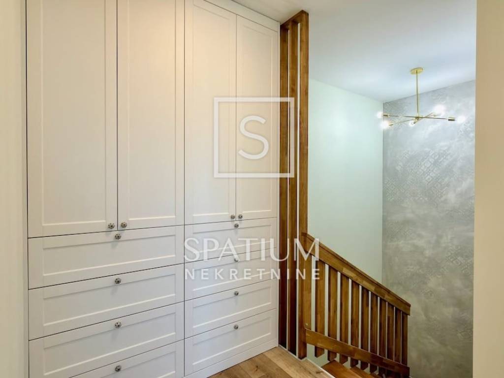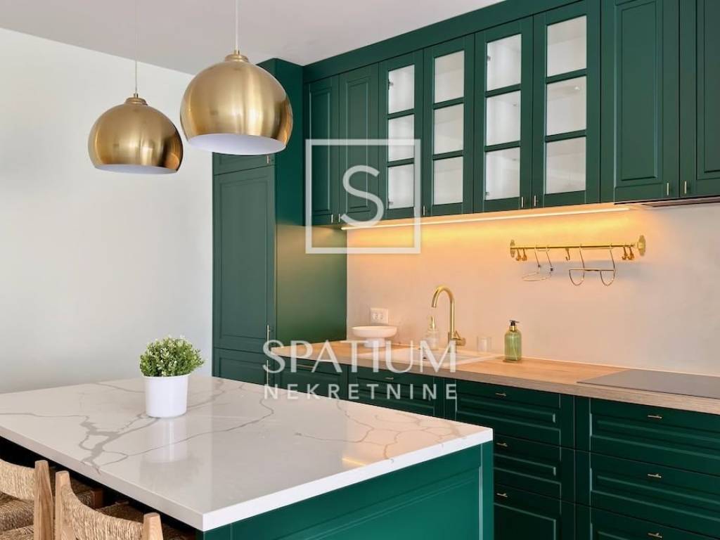 LOVRAN, wir bieten Ihnen eine geschmackvoll möblierte und ausgestattete Maisonette-Wohnung mit zwei Schlafzimmern und Pool in einem Neubau in fußläufiger Entfernung zum ersten Strand und der Altstadt von Lovran. Im Erdgeschoss befindet sich der großzügige Wohnbereich mit Küche, Esszimmer und Wohnzimmer, von dem aus Sie auf die Terrasse mit Pool gelangen. Neben der Innentreppe befindet sich ein Gäste-WC. Im ersten Stock befinden sich zwei Schlafzimmer mit jeweils eigenem Bad für maximalen Komfort. Das Hauptschlafzimmer verfügt über einen Balkon mit teilweisem Meerblick. Die Wohnung zeichnet sich durch einen optimalen Grundriss, hochwertige, maßgefertigte Möbel und ein stilvolles Design aus. Zur Wohnung gehören drei Außenstellplätze, ein weiterer Parkplatz befindet sich in der Nähe.