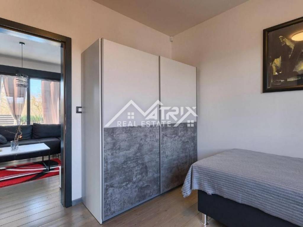 The house is built on a beautifully landscaped and fully fenced plot of 711 m², which provides everything you need for a relaxed and carefree stay. The central part of the garden is occupied by a 32 m² swimming pool with a sunbathing area, ideal for enjoying warm summer days. The garden is equipped with an irrigation system, and an additional value is provided by a beautiful outdoor kitchen located on a large covered terrace of 25 m². The garden also includes an auxiliary building with a barbecue, sink and outdoor shower, a children's playground and private paved parking for at least two vehicles.
