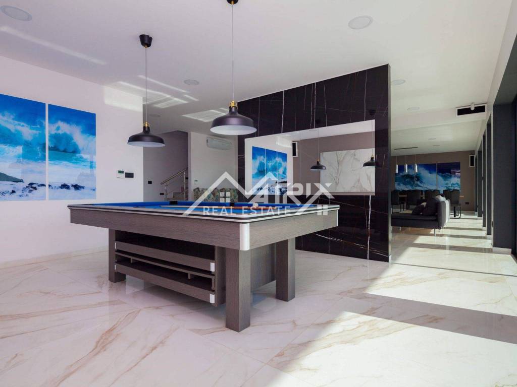 Die Villa verfügt über insgesamt 480 m2 Wohnfläche, verteilt auf drei Etagen: Erdgeschoss, erste Etage und zweite Etage. Der zentrale Teil des Erdgeschosses ist ein großer Raum, der das Wohnzimmer mit dem Esszimmer und der Küche verbindet, mit Zugang zur überdachten Poolterrasse durch große Glaswände, die für viel Tageslicht sorgen. Im Erdgeschoss gibt es außerdem eine Lounge mit Billardtisch und eine Gästetoilette. Moderne Treppen führen uns in die erste Etage, wo sich vier voll ausgestattete Schlafzimmer mit jeweils eigenem Bad und Zugang zur Terrasse befinden. Jedes Zimmer bietet einen schönen freien Blick auf das Meer und die Landschaft. Im obersten Stockwerk befindet sich eine echte Wellnessoase mit Fitnessraum, Sauna mit eigenem Bad und einem weiteren Schlafzimmer mit eigenem Bad. Für den vollen Genuss wird es in den Whirlpool gestellt.