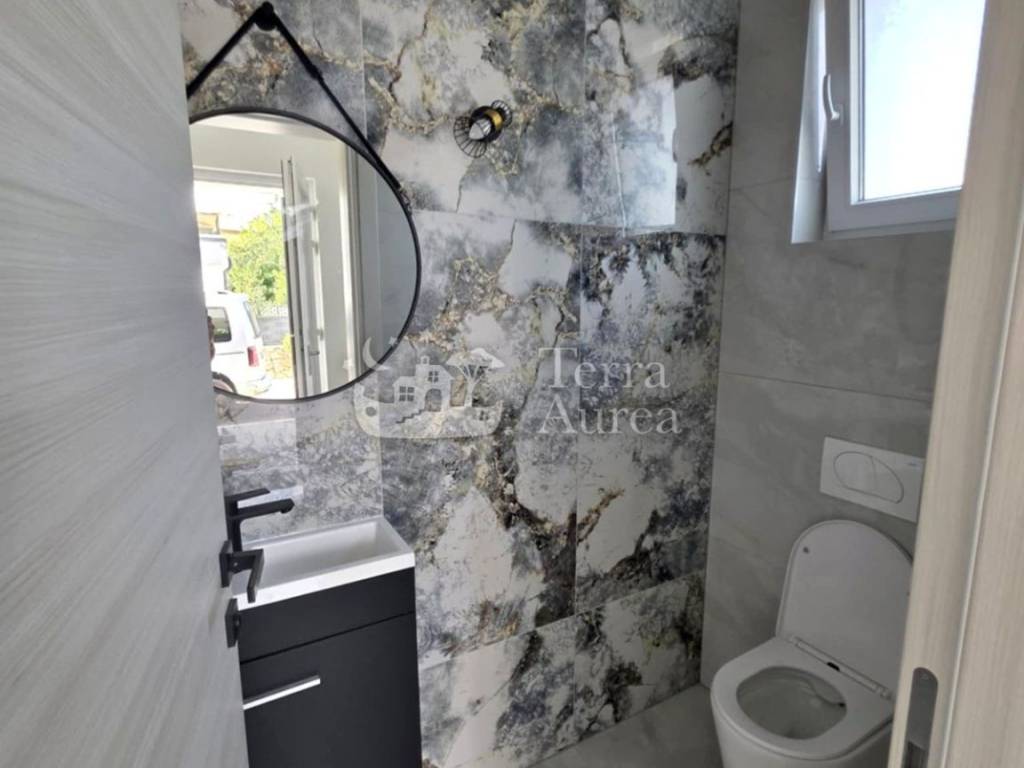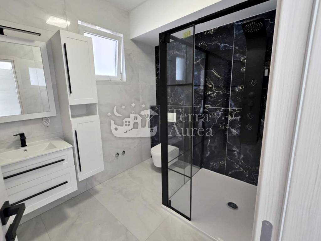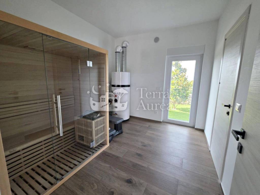 Im Erdgeschoss gibt es eine geräumige Küche mit Esszimmer und Wohnzimmer, ein luxuriöses Badezimmer und eine Toilette. Im Erdgeschoss befindet sich außerdem eine Sauna – eine Oase der Gesundheit und des Vergnügens, die die Möglichkeit bietet, sich vollkommen zu entspannen, Stress abzubauen und Körper und Seele zu erneuern. Vom Wohnzimmer gelangt man auf eine überdachte Terrasse mit Blick auf einen wunderschön angelegten Garten im mediterranen Stil. Hier finden Sie einen privaten Pool, einen Whirlpool, eine Sonnenterrasse und einen Grill, die den perfekten Raum für Entspannung und Spaß schaffen.