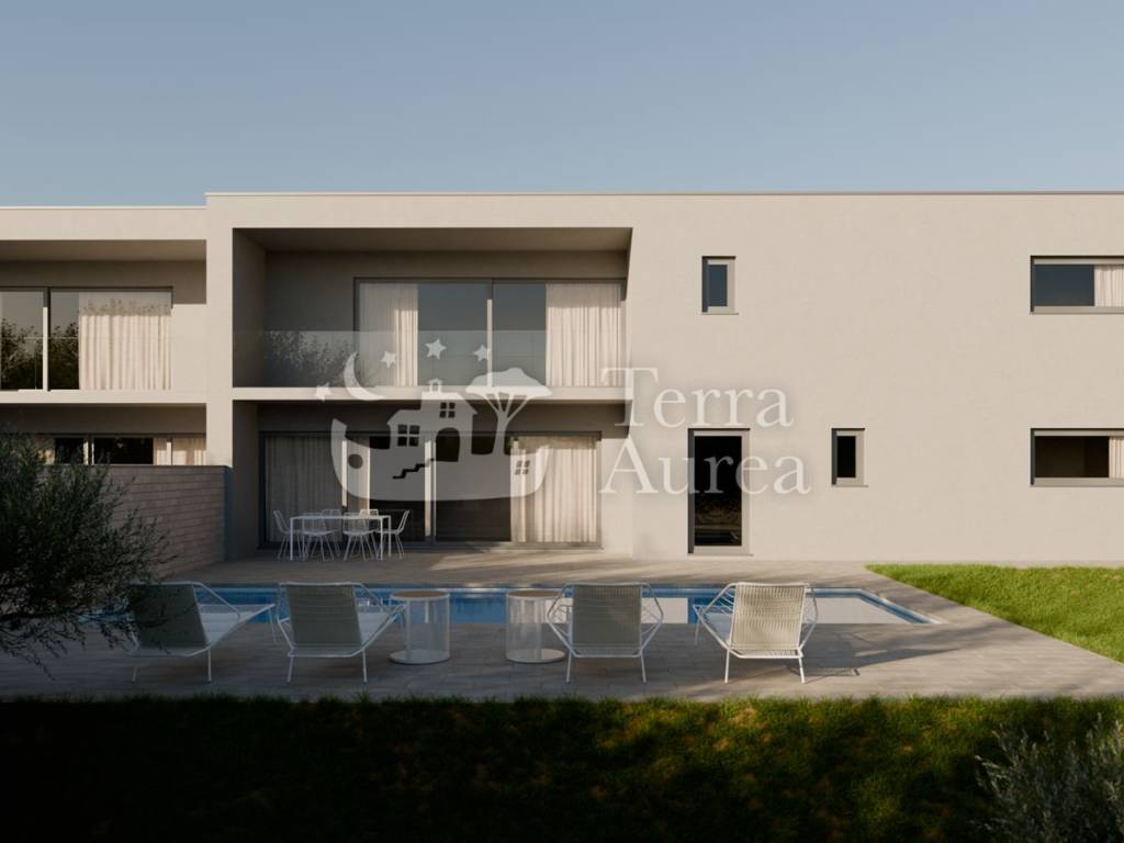Die Eingangshalle führt zu einem geräumigen Wohnzimmer, das mit einer modern ausgestatteten Küche und einem Esszimmer verbunden ist. Vom Wohnzimmer aus gelangt man auf eine überdachte Loggia und in den Garten mit Swimmingpool und Sonnenterrasse – ideal zum Entspannen und für gesellige Stunden im Freien.