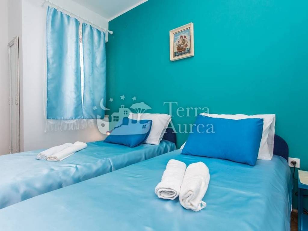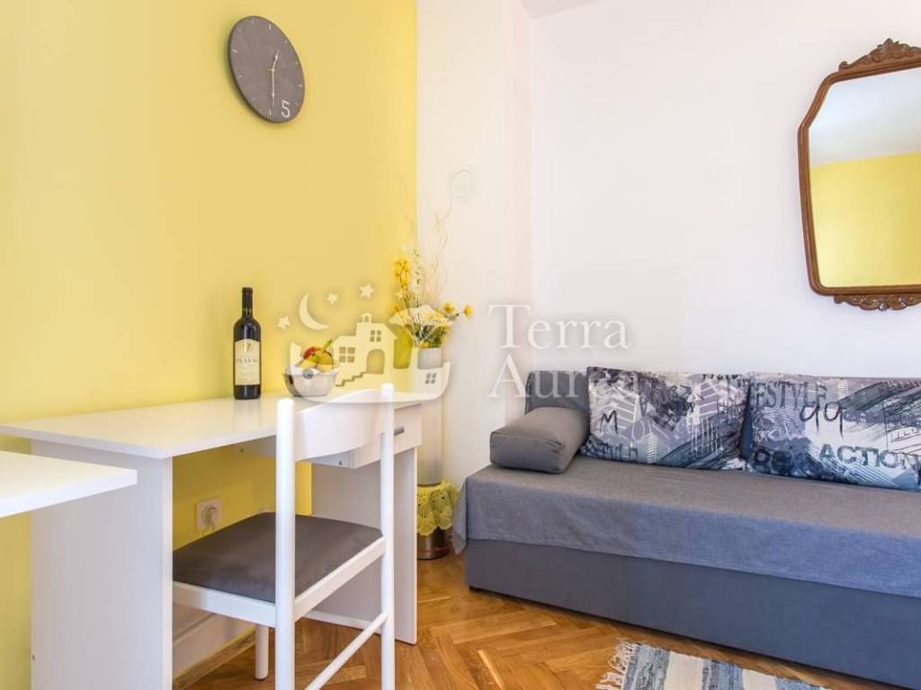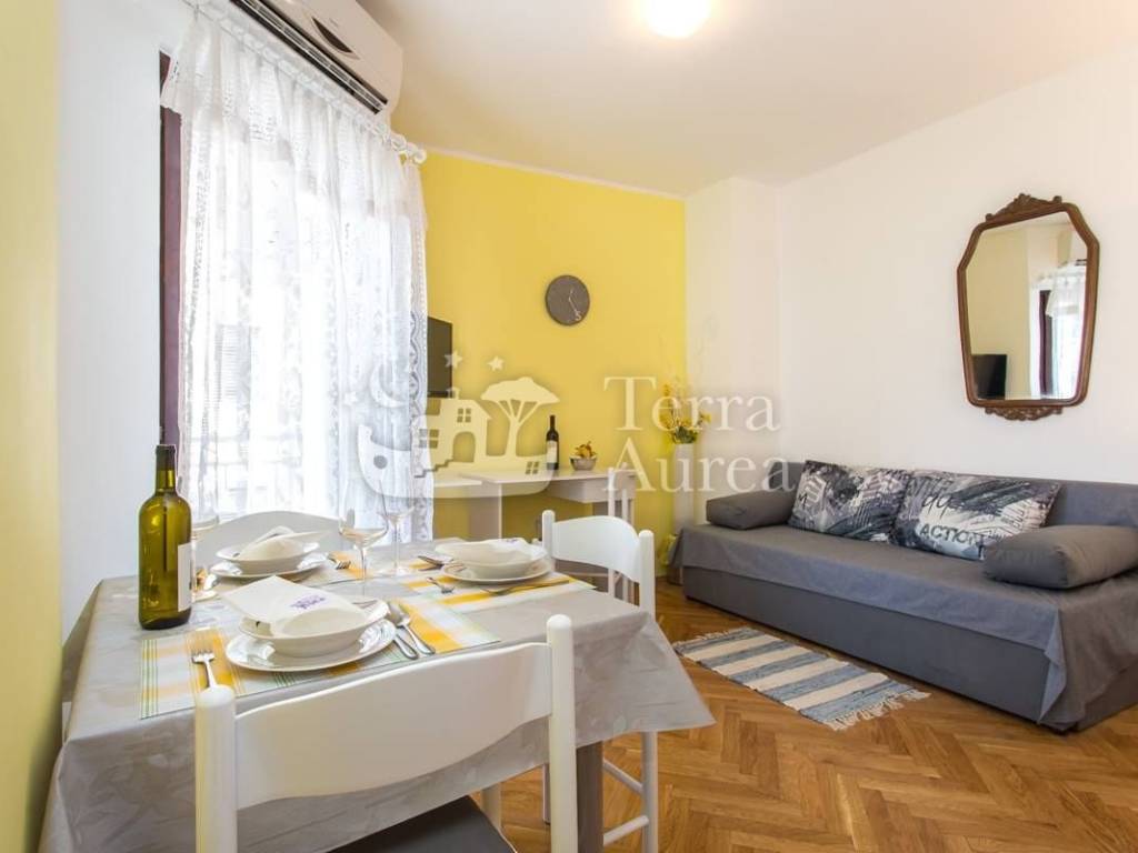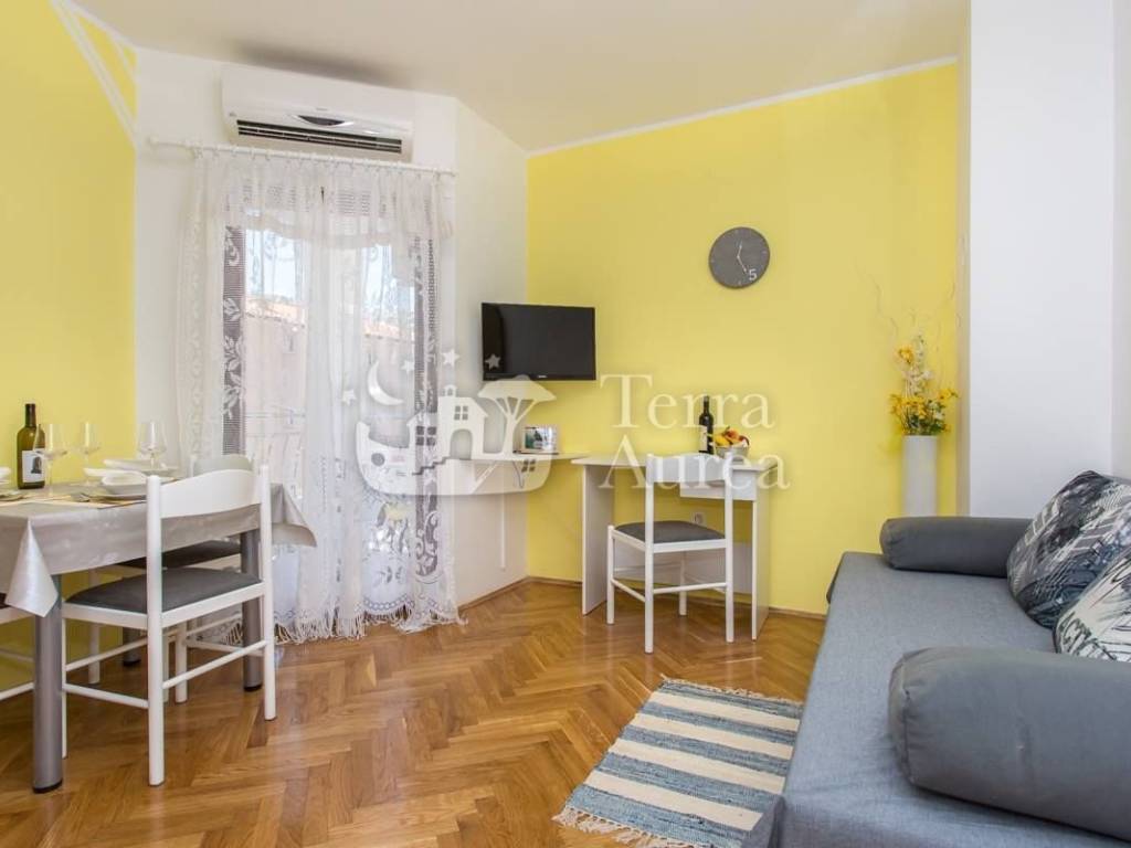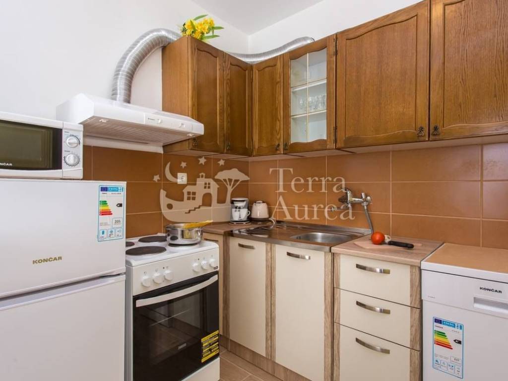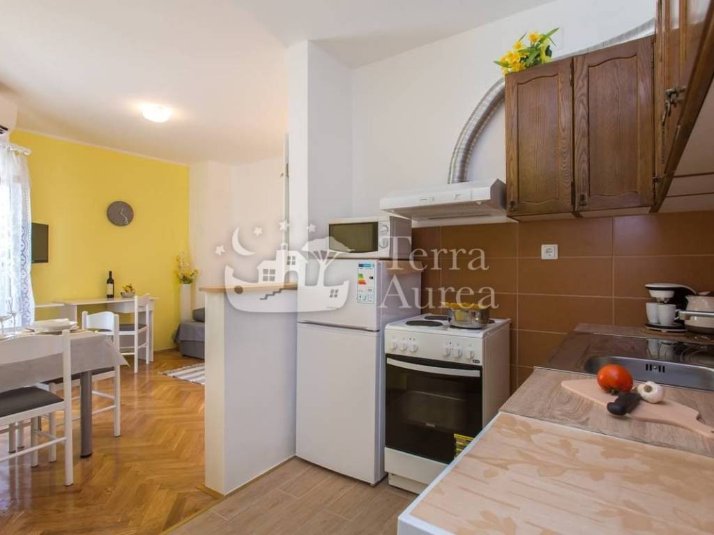 Die Wohnung bietet eine funktionale Raumaufteilung und umfasst ein Schlafzimmer mit Doppelbett, ein Badezimmer mit Dusche und Waschmaschine sowie ein Wohnzimmer mit angeschlossenem Esszimmer und voll ausgestatteter Küche. Vom Wohnzimmer aus gelangt man auf eine kleine, aber sehr gemütliche Terrasse, ideal für den ersten Morgenkaffee oder ein Abendessen im Freien.