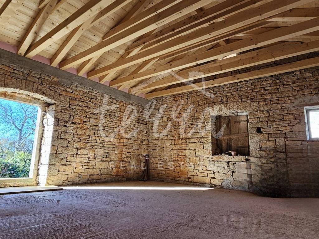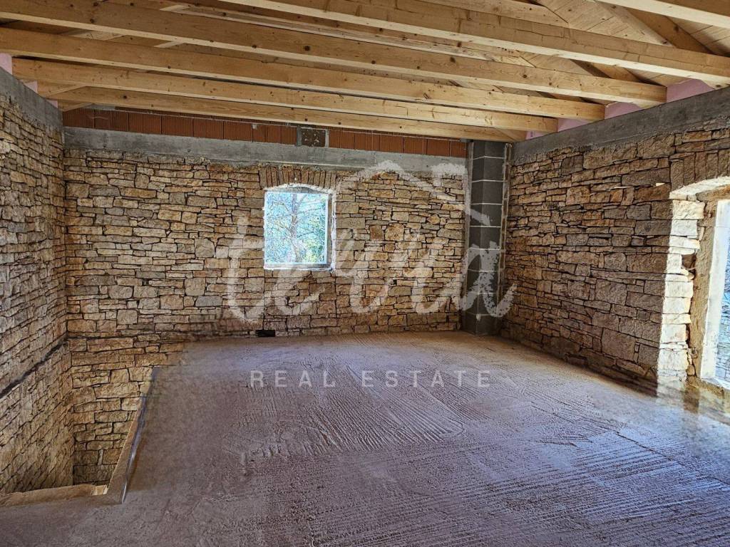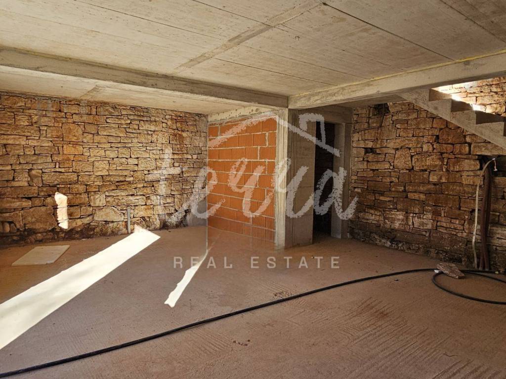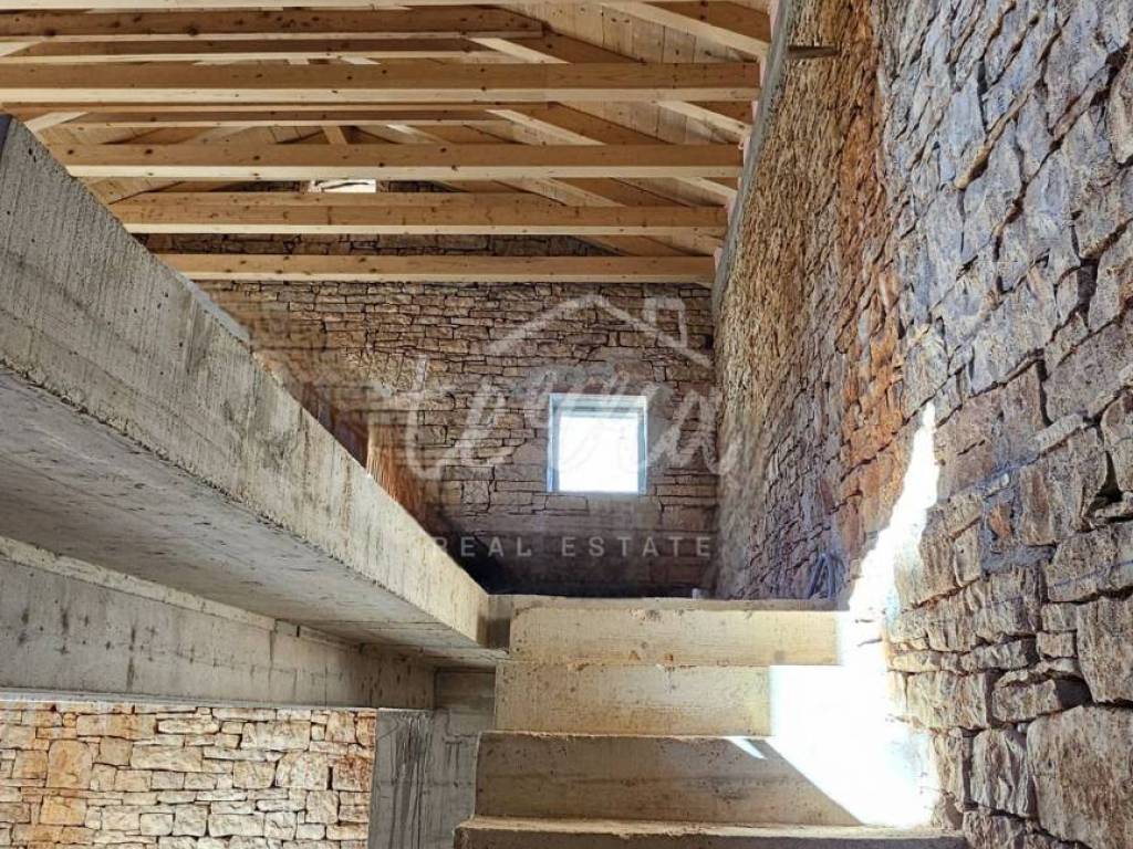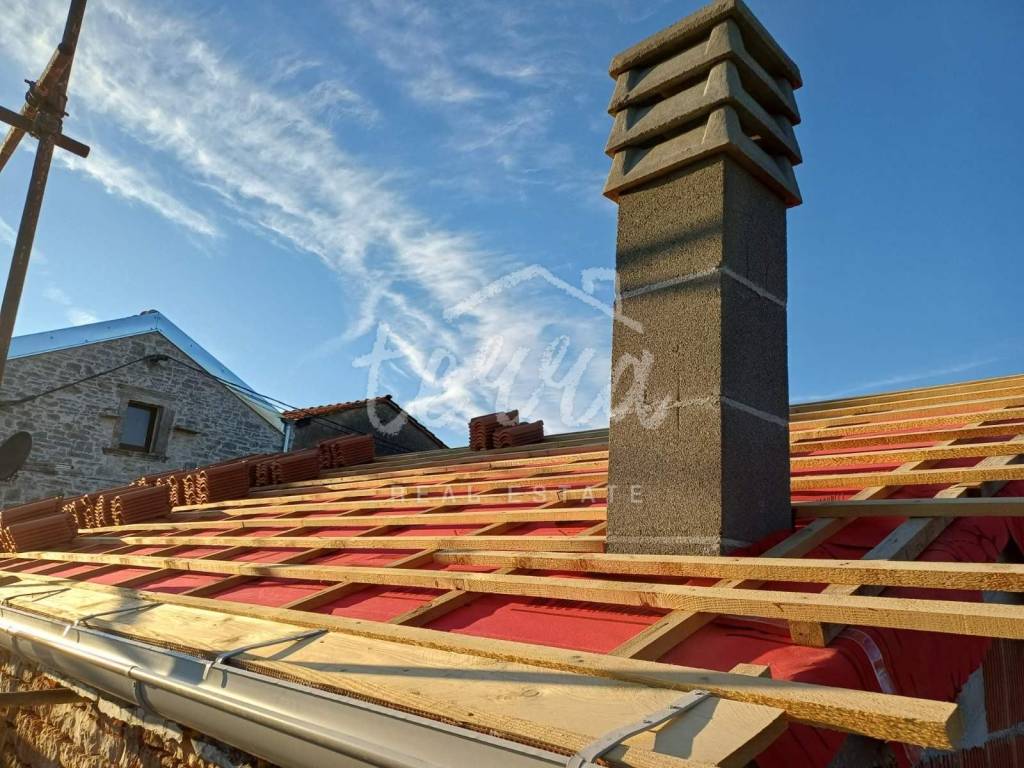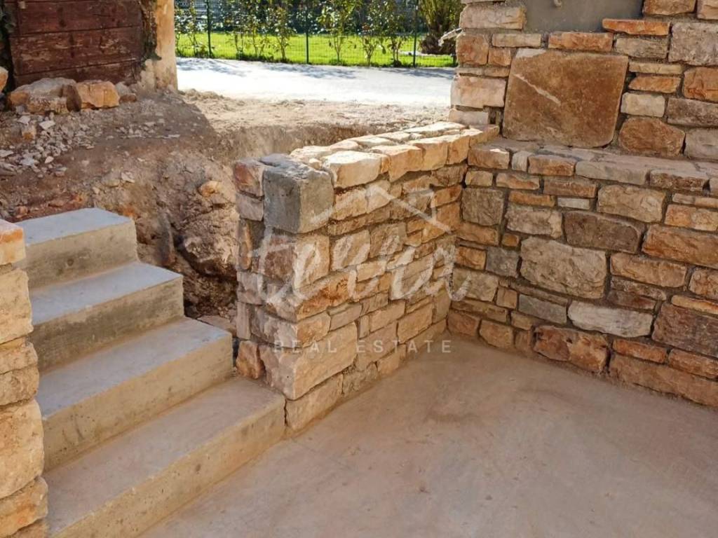 Info 00385 98 592122 Roberta Freistehendes Steinhaus in einem ruhigen Dorf bei Tinjan. Die Baugenehmigung liegt vor und der Baubeginn wurde gemeldet. Eine Stahlbeton-Bodenplatte, ein Stahlbeton-Zwischengeschoss mit Betontreppe und eine neue Holzkonstruktion mit allen Schichten und einer abschließenden Eindeckung aus mediterranen Ziegeln wurden errichtet. Im Erdgeschoss wurde eine Trennwand für die Toilette eingebaut. Laut Plan wurden vier neue Fensteröffnungen geschaffen und die alten Ziegel an der Außenfassade wiederverwendet. Das Grundstück verfügt über einen Wasseranschluss und einen Baustellenstromanschluss. Eigentumsanteil 1/1 Ideale Investition im Tourismussektor.