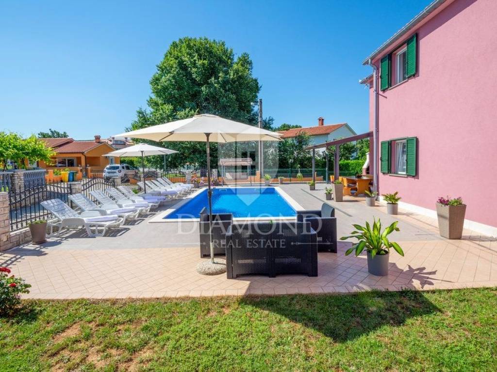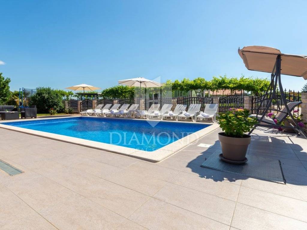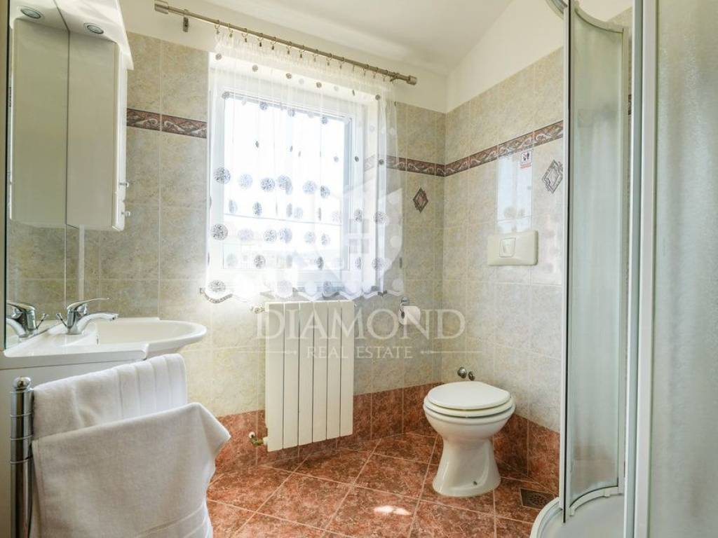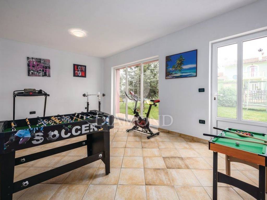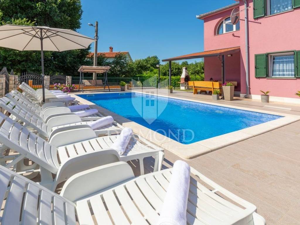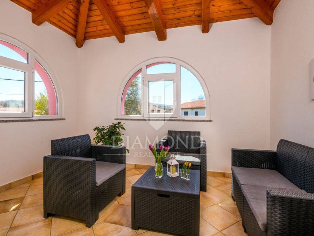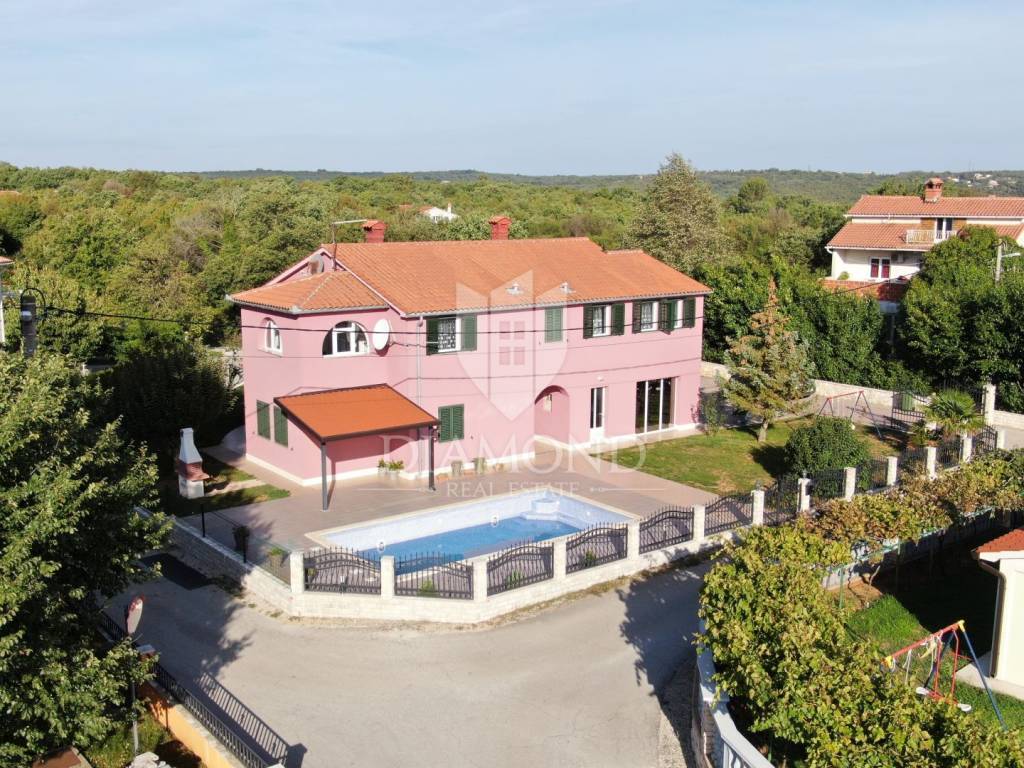 Wir verkaufen dieses geräumige Ferienhaus mit Swimmingpool in einem attraktiven Dorf, nur 4 km vom Zentrum von Labin entfernt. Das Haus ist als zweistöckiges Gebäude mit einer Gesamtfläche von 243 m2 konzipiert. Es besteht aus zwei Wohnungen. Die Wohnung im Erdgeschoss von 125 m2 besteht aus einer Küche mit Speisekammer, einem Esszimmer und einem gemütlichen Wohnzimmer mit geschlossenem Holzkamin. Es gibt auch ein Badezimmer und ein Schlafzimmer. Das Erdgeschoss ist auch mit der Garage und dem Heizraum verbunden. Im ersten Stock befindet sich eine zweite Wohnung mit einer Größe von 118 m2, die aus einem Wohnzimmer mit Zugang zu einem Balkon, einer voll ausgestatteten Küche, einem Schlafzimmer mit eigenem Bad sowie drei weiteren Schlafzimmern und einem Badezimmer besteht. Zwei Schlafzimmer haben Zugang zu einem geschlossenen Balkon. Innerhalb des Hauses gibt es auch einen separaten Raum mit externem Eingang, der in ein Fitnessstudio umgewandelt wurde. Der Hof ist landschaftlich gestaltet, gepflegt und vollständig eingezäunt, was die Ruhe und Privatsphäre des Anwesens gewährleistet. Der Hof umfasst 1079 m2 mit gepflanzten Obstbäumen und Zierpflanzen, und es gibt auch einen schönen Swimmingpool von 32 m2. Parkplätze, ein kleiner Kinderspielplatz und schöne Grünflächen sind vorhanden. Neben dem Haus gibt es auch ein besonderes Nebenwohngebäude, bestehend aus einem Schlafzimmer mit Bad, einer voll ausgestatteten Küche und einem gemütlichen Wohnzimmer mit einem besonderen antiken offenen Kamin. Das Haus ist das ganze Jahr über zum Wohnen und Verweilen geeignet - im ganzen Haus wurde eine Zentralheizung installiert, Klimaanlagen wurden installiert und holzbefeuerte Kamine sorgen für zusätzliche Atmosphäre. Das Anwesen hat eine ausgezeichnete Lage, im neueren Teil des Dorfes ist es von Ferienhäusern und Einfamilienhäusern umgeben. Es liegt 4 km vom Zentrum von Labin und 8 km von den schönen Stränden und dem Meer in Rabac entfernt, das bei Touristen beliebt ist.