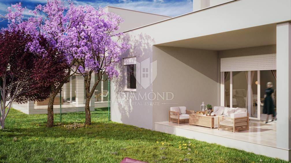 Das Haus ist Teil einer Reihe von vier Gebäuden, die als mehrstöckiges Gebäude mit einer Gesamtfläche von 167 m2 konzipiert sind. Im Erdgeschoss gibt es ein geräumiges Wohnzimmer, Esszimmer, Küche, Gäste-WC und Abstellraum, während wir im ersten Stock zwei Schlafzimmer mit eigenem Bad haben, eines davon mit eigenem Balkon (9,90 m2). Die angeschlossene Garage für zwei Autos hat eine Fläche von 31,8 m2. Das Wohnzimmer verfügt über eine funktionale Verbindung mit der überdachten Außenterrasse (14,95 m2).