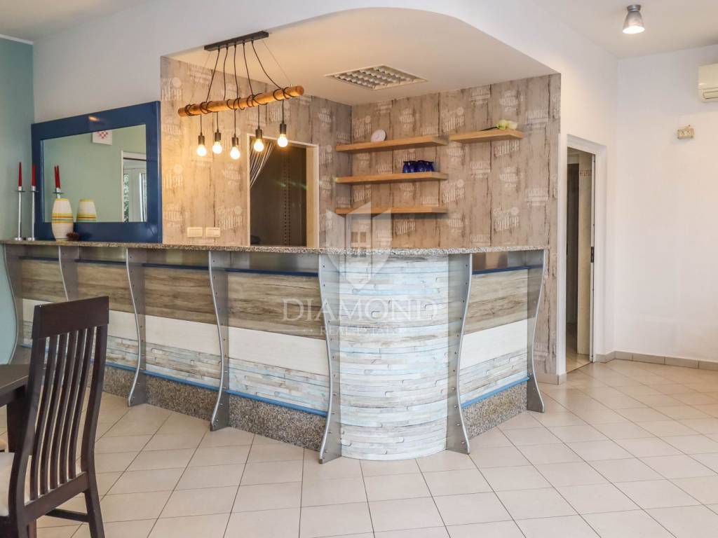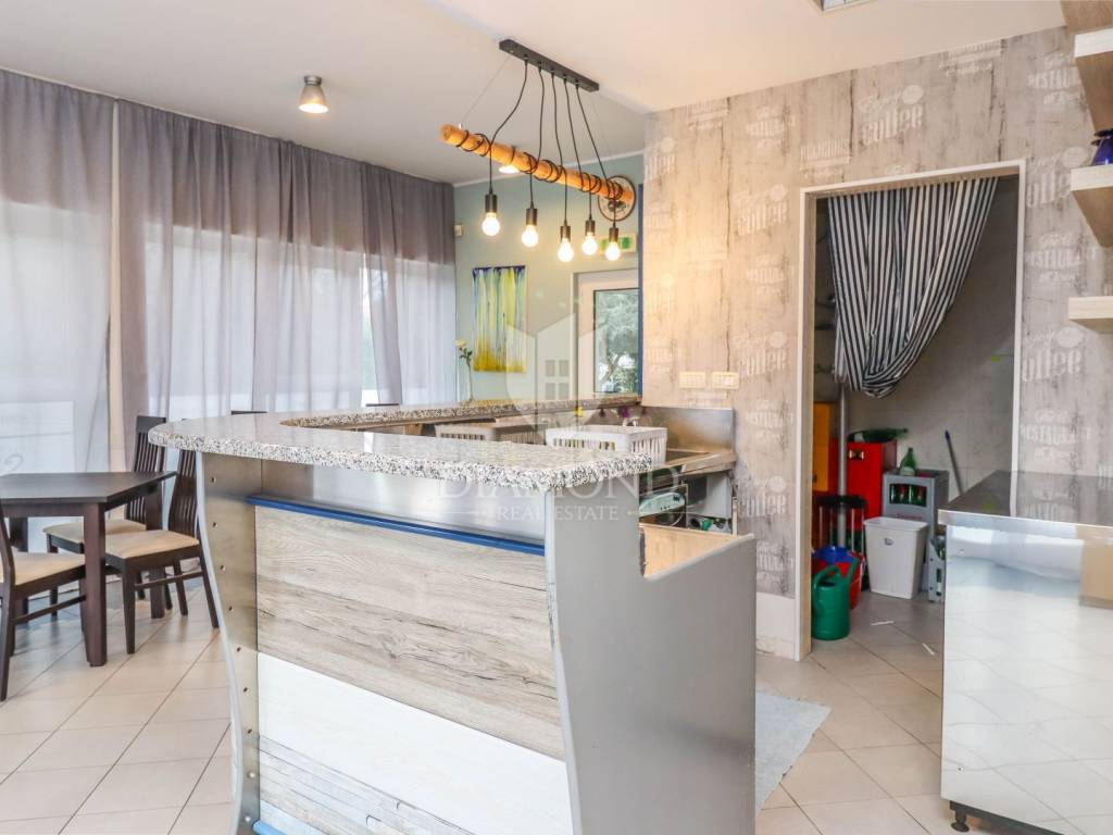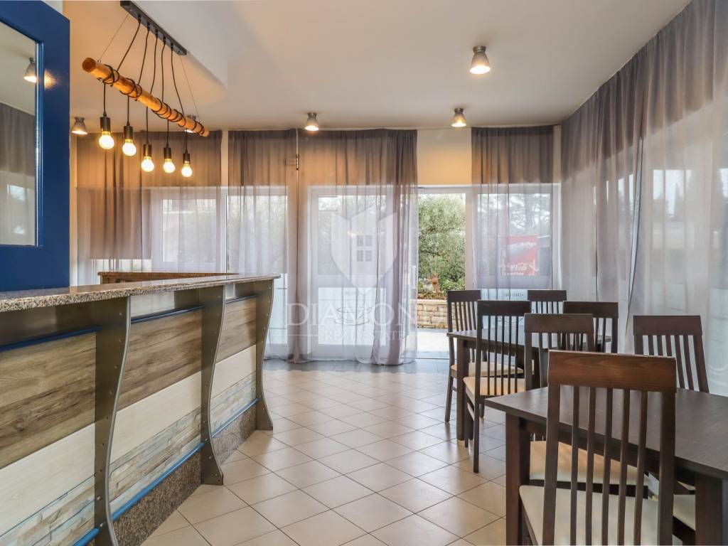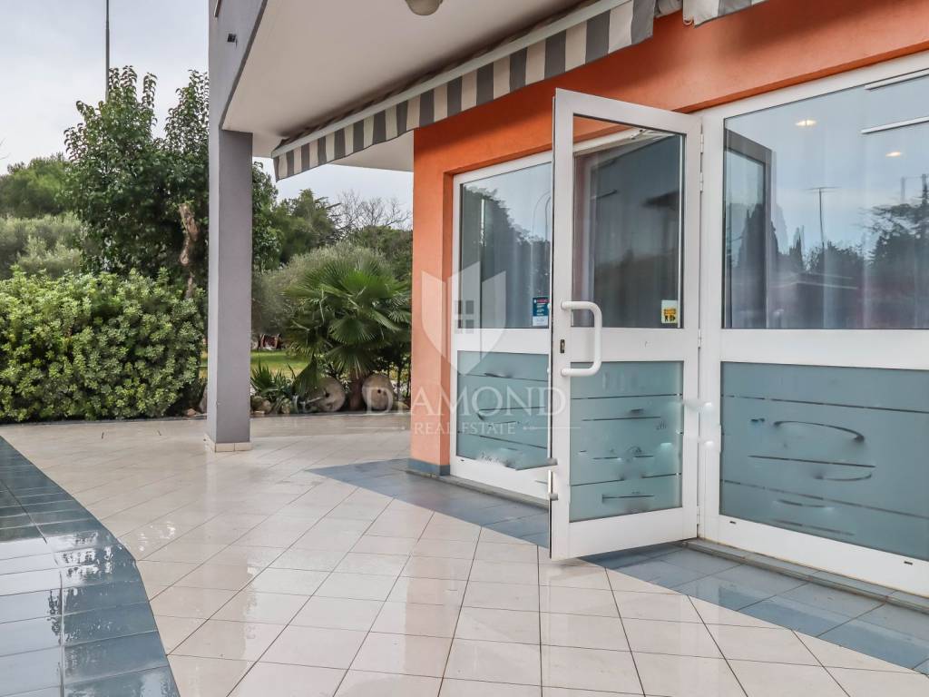 Es befindet sich im Erdgeschoss eines Gebäudes mit mehreren Wohnungen. Die Fläche des Raumes beträgt 58m2 und besteht aus einer zentralen Theke und einem Lagerraum, einem geräumigen und gut beleuchteten Bistro und 2 Toiletten. Der Raum ist über die dazugehörige überdachte Terrasse zugänglich und verfügt außerdem über einen Garten und 2 Parkplätze. Der Geschäftsraum befindet sich in einer attraktiver Lage in der Stadt Umag, nur 600 m von den Umag-Hotels, dem Yachthafen und der Promenade entfernt.